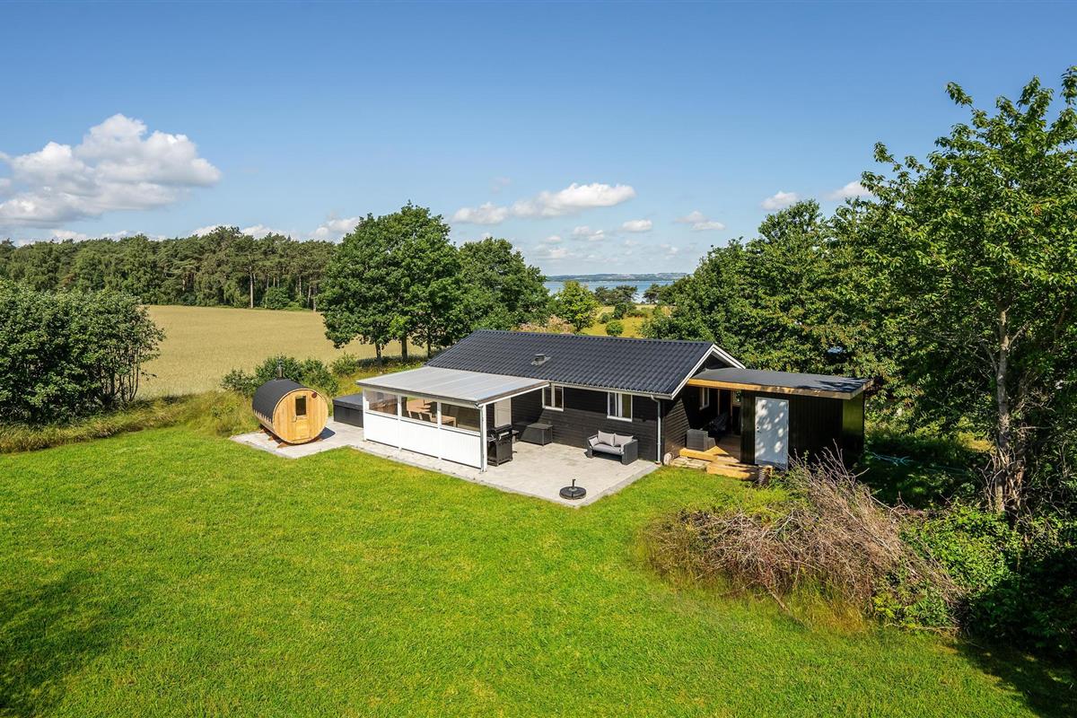 Romantisch houten vakantiehuis nabij Skødshoved Strand met uitzicht op zee en privéterrein.
