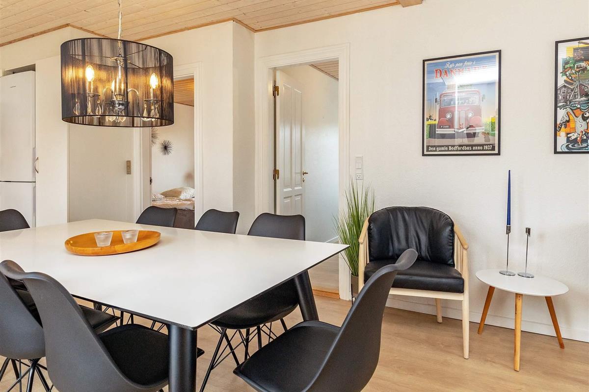 Innen offener Küchen-/Wohnbereich mit Essecke, ideal für das Familienleben. Außerdem drei geräumige Schlafzimmer mit viel Stauraum im Haus. Zudem stehen nebenan in einem beheizten Nebengebäude (Annex) zwei weitere Schlafplätze in einem Doppelbett zur Verfügung. Im Haupthaus auch geräumiges Badezimmer mit angenehmer Fußbodenheizung, Dusche, Waschmaschine und Wäschetrockner. Für die Kleinen stehen Hochstuhl und Kinderbett sowie im Garten ein Spielgerüst bereit.