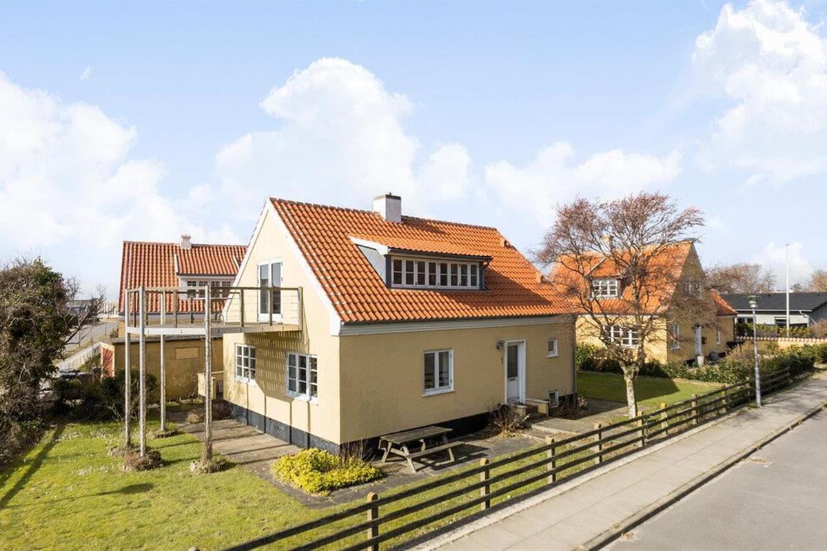 Aan de rand van Skagen verwelkomt dit typisch Skagen gele vakantiehuis je met een groot houten balkon met uitzicht op zee.