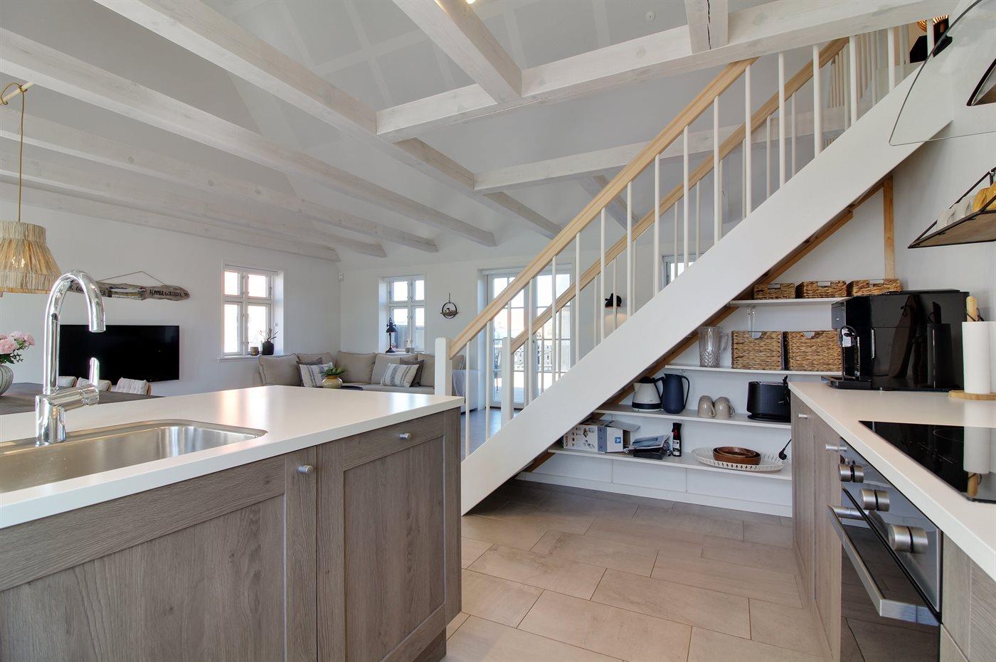 De keuken is uitgerust met koelkast Er is 4 inductiekookplaten, heteluchtoven en vaatwasser.