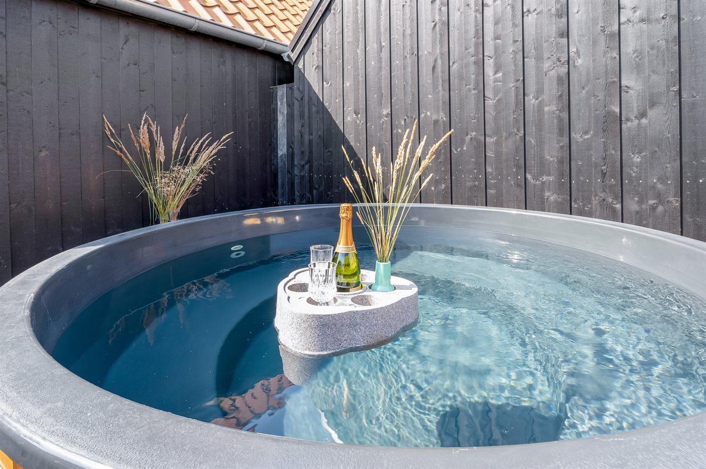 Het buitenbubbelbad (standwater) biedt ontspanning aan 8 personen.