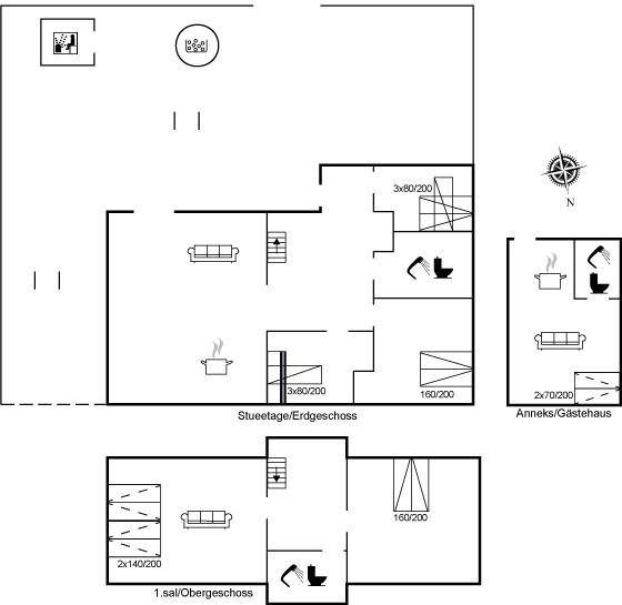 Er zijn in totaal 5 slaapkamers. De slaapplaatsen zijn als volgt verdeeld: 4 slaapplaatsen in tweepersoonsbedden. 6 slaapplaatsen in stapelbedden. 6 slaapplaatsen in slaapbanken (tweepersoons).2 slaapplaatsen op matrassen. 2 van deze slaapplaatsen bevinden zich in de bijgebouw, 4 in de huiskamer en 2 in de open slaapzolder. Verder is kinderbed ter beschikking.
