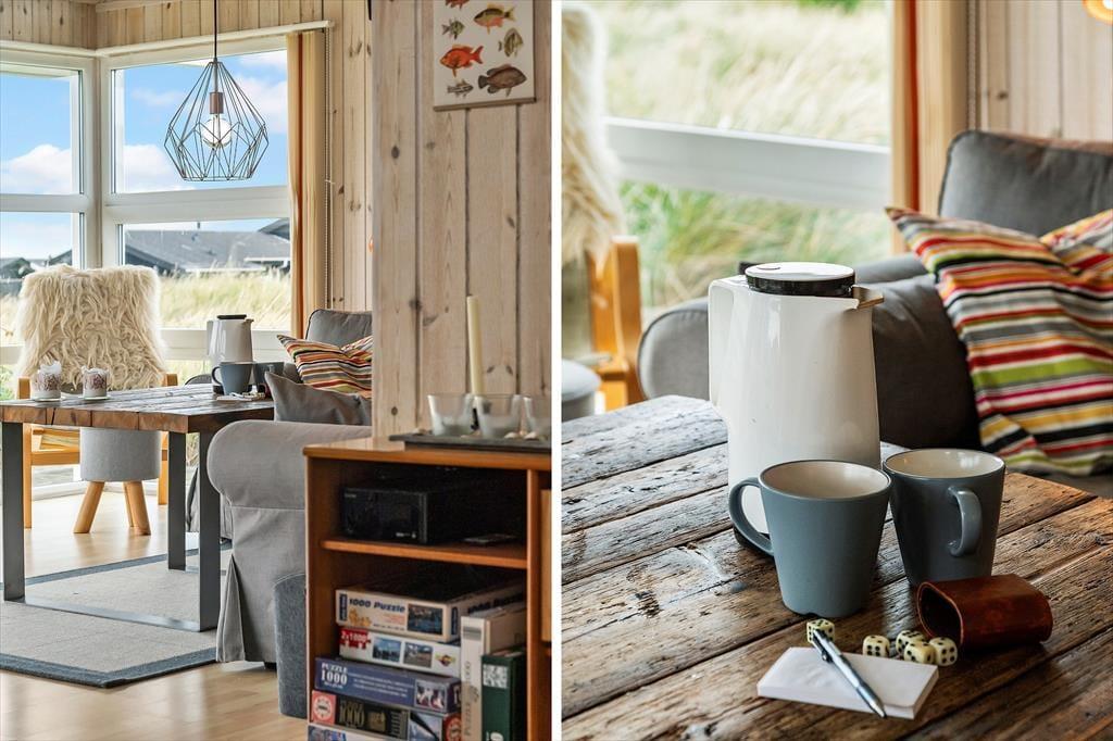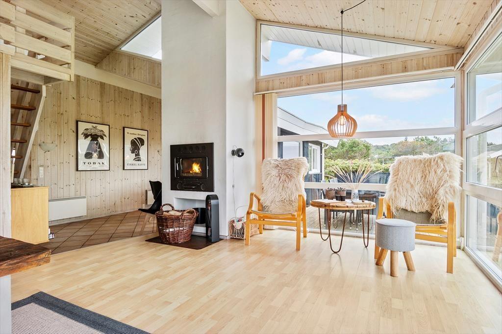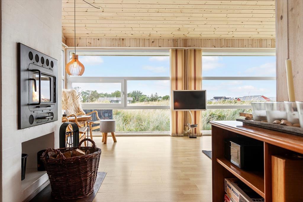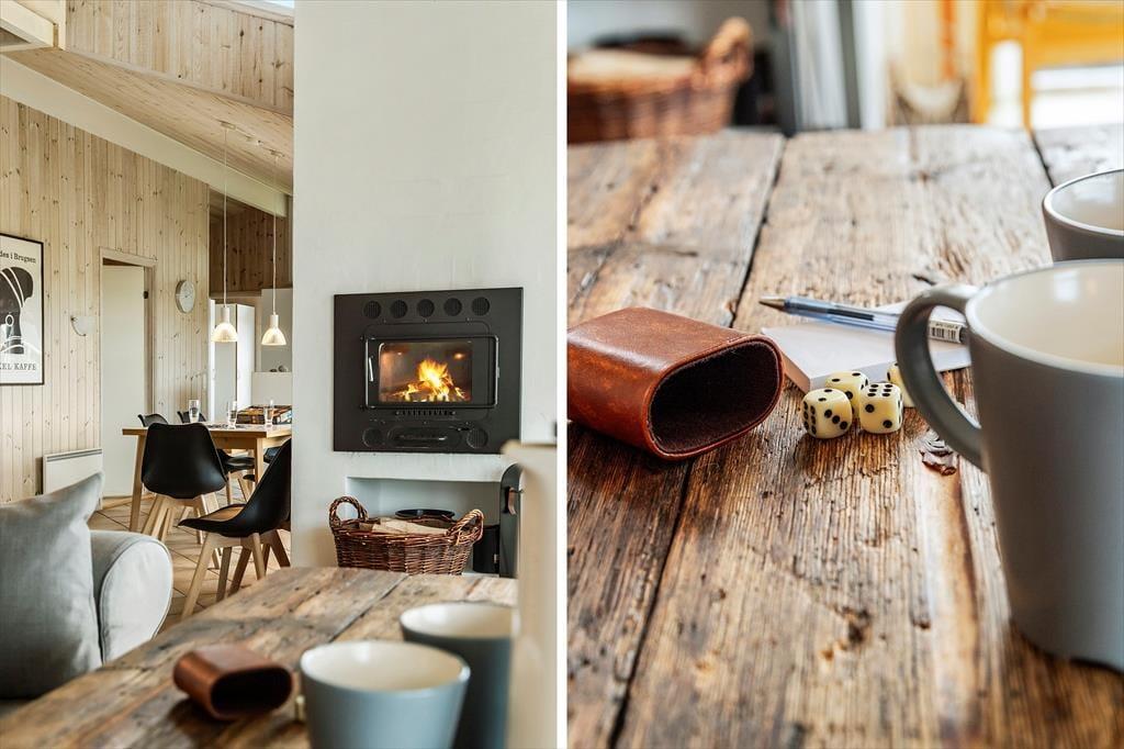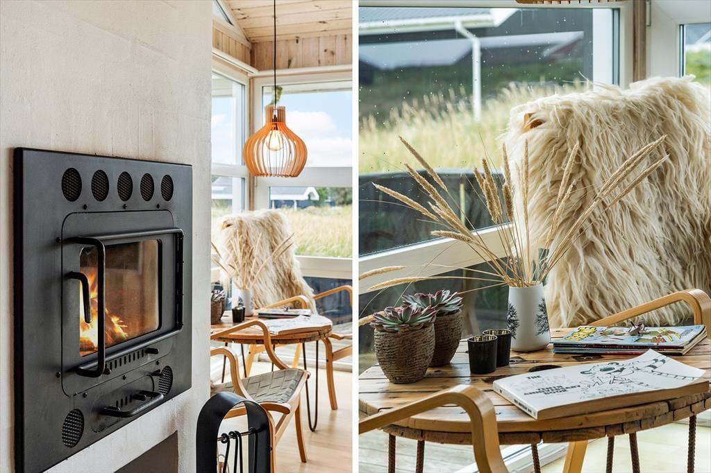 Das Innere des Ferienhauses ist hell und einladend, mit einer gemütlichen Atmosphäre, die Sie sofort wie zu Hause fühlen lässt. Der offene Wohnbereich verbindet Wohnzimmer und Küche – ideal für gemeinsame Aktivitäten und Zeit miteinander. Der Kaminofen sorgt an kühlen Abenden für Wärme und Gemütlichkeit, während große Fenster viel Tageslicht hereinlassen und die schöne Natur direkt in den Wohnraum holen. Ein besonderes Highlight ist der Hems mit Blick auf die umliegende Landschaft – der ideale Ort, um ein gutes Buch zu lesen oder einfach die Ruhe zu genießen. Der Hems ist sowohl bei Kindern als auch bei Erwachsenen beliebt und trägt zum Charme des Hauses bei.