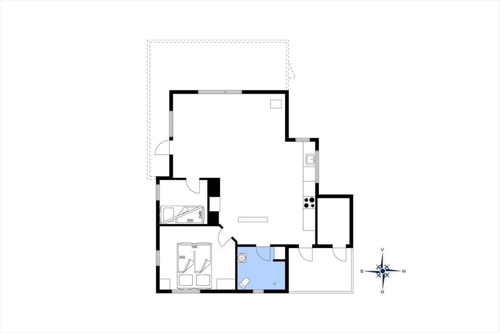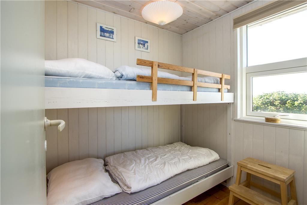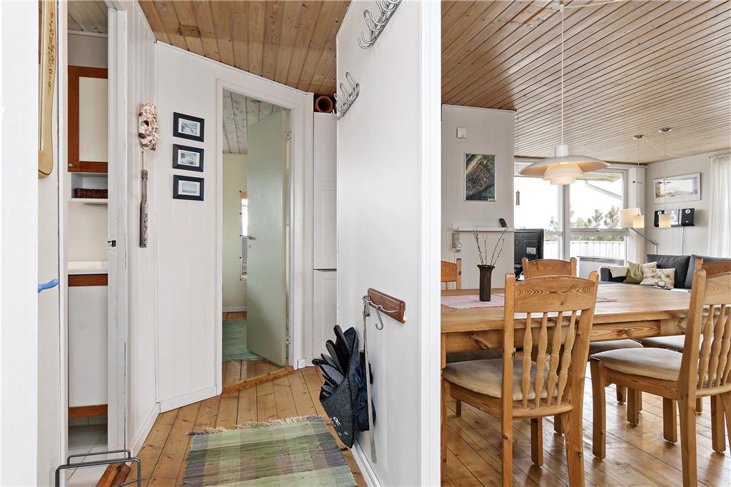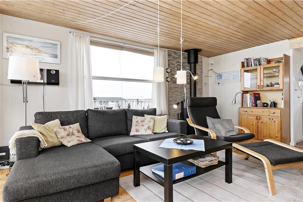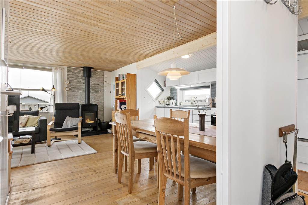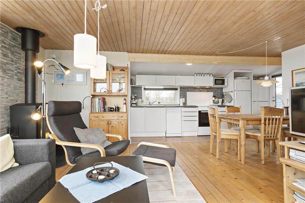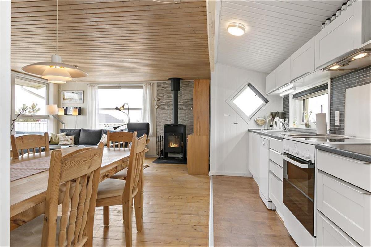 Vom Eingangsbereich an der überdachten Terrasse betreten Sie die offene Küche, die das Herzstück des Hauses ist. Hier befinden sich eine Essecke mit großen Fenstern nach Norden und eine Sofagruppe mit tollem Ausblick nach Südwesten. Egal, ob am Esstisch oder auf dem Sofa, es lassen sich immer die blaue Nordsee und die Fischkutter beobachten. Nach einem Marsch entlang am Strand ist es wunderbar, wenn Sie sich vor dem Kamin aufwärmen. Korb voller Brennholz kann für 25 DKK gekauft werden. In Verlängerung der Terrasse befindet sich der Anbau mit eigenem TV.