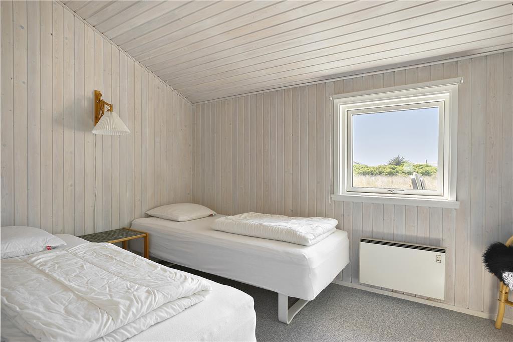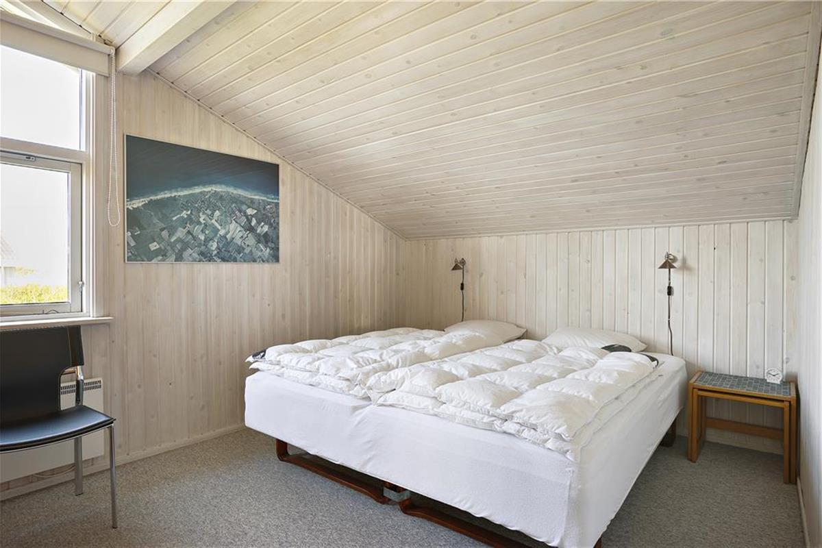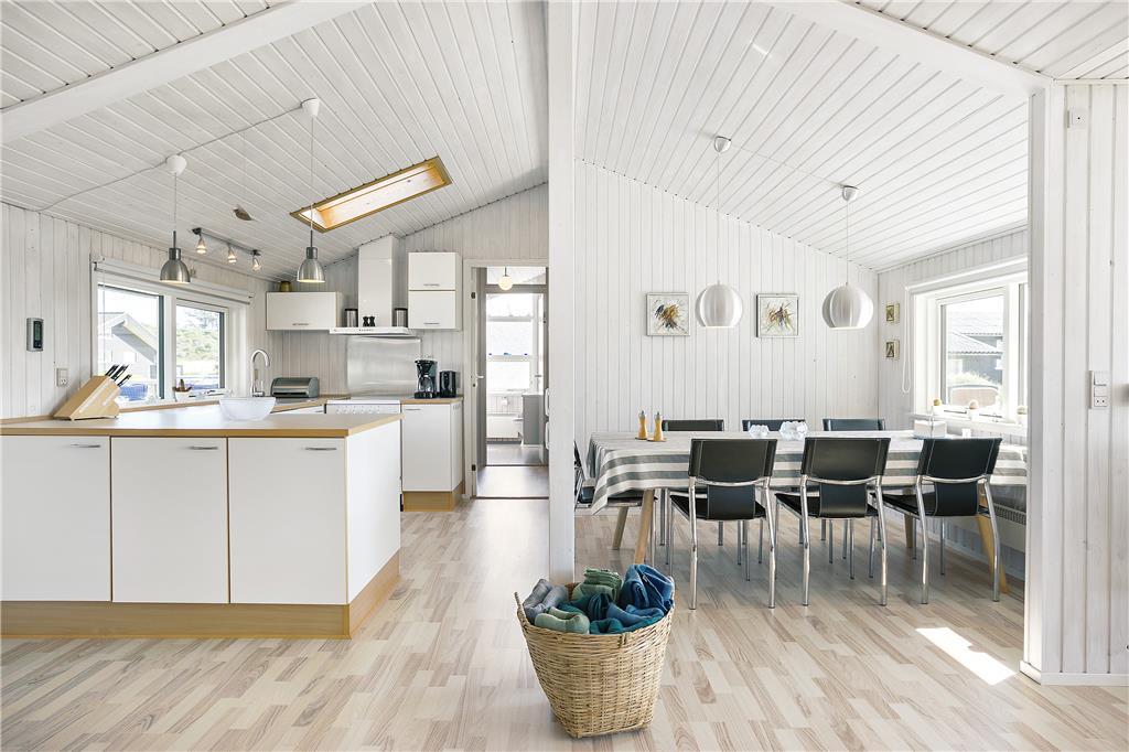 Das Herzstück dieses Hauses bildet der große Wohnbereich, der mit seinen bodentiefen Fenstern, den hellen, frischen Farbtönen und einem überwältigenden Lichteinfall vom Dünengebiet in westlicher Richtung begeistert. Die Einrichtung ist als schlicht und geschmackvoll, mit Massivholz und bedacht gewählten Details, zu charakterisieren. Der Wohnraum befindet sich in offener Verbindung zur Küche. Die attraktive Küche mit weißen Fronten und abgesetzten Kanten in Bucheoptik erleichtert Ihnen Dank vieler moderner Annehmlichkeiten Ihren alltäglichen Aufgaben. Zu nennen sind beispielsweise der Ceranfeldherd, ein Kühl- und Gefrierschrank, ein Geschirrspüler und eine Mikrowelle. Ihnen stehen in diesem reizvollen Haus zwei Bäder zur Verfügung. Das kleinere Bad ist mit einer Duschnische, einem WC und einem Waschbecken ausgestattet. Im größeren Bad befinden sich ein großer Waschtisch samt Spiegelarrangement, eine große Ablagefläche, eine Duschnische ein WC und eine Waschmaschine. Die Schlafplätze verteilen sich auf drei gute Schlafräume, von denen zwei mit jeweils einem Doppelbett eingerichtet sind. Im dritten Schlafraum erwarten Sie zwei Einzelbetten. Dank der schrägen, hohen Decken und der hellen Holzwände im gesamten Innenbereich, kommen Sie bei diesem Haus in den Genuss eines wunderbar luftig leichten Wohngefühls. Der Küchen- und Wohnbereich ist mit einem modernen Holzboden ausgelegt. In den beiden Bädern erwarten Sie Fliesenböden samt Fußbodenheizung. Die hauseigene Klimaanlage und eine Sonnenwärmeventilation sorgen für ein gutes Raumklima.
