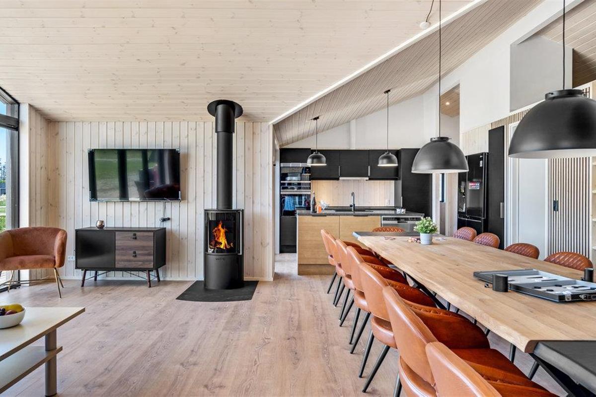 In de ruime woonkamer is er een gezellige houtkachel, een schuin plafond en grote ramen die het licht naar binnen laten stromen, waardoor de kamer erg licht is.