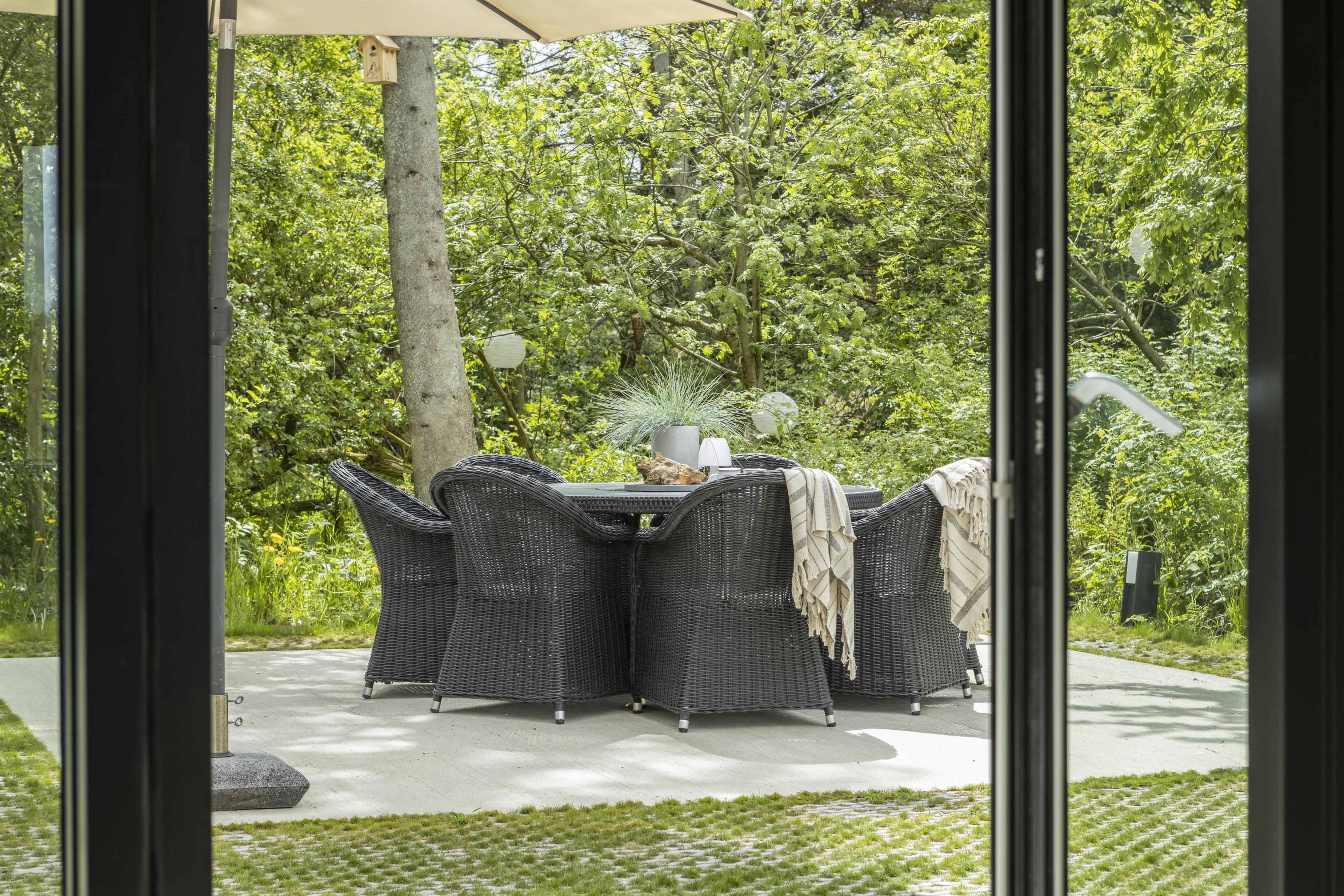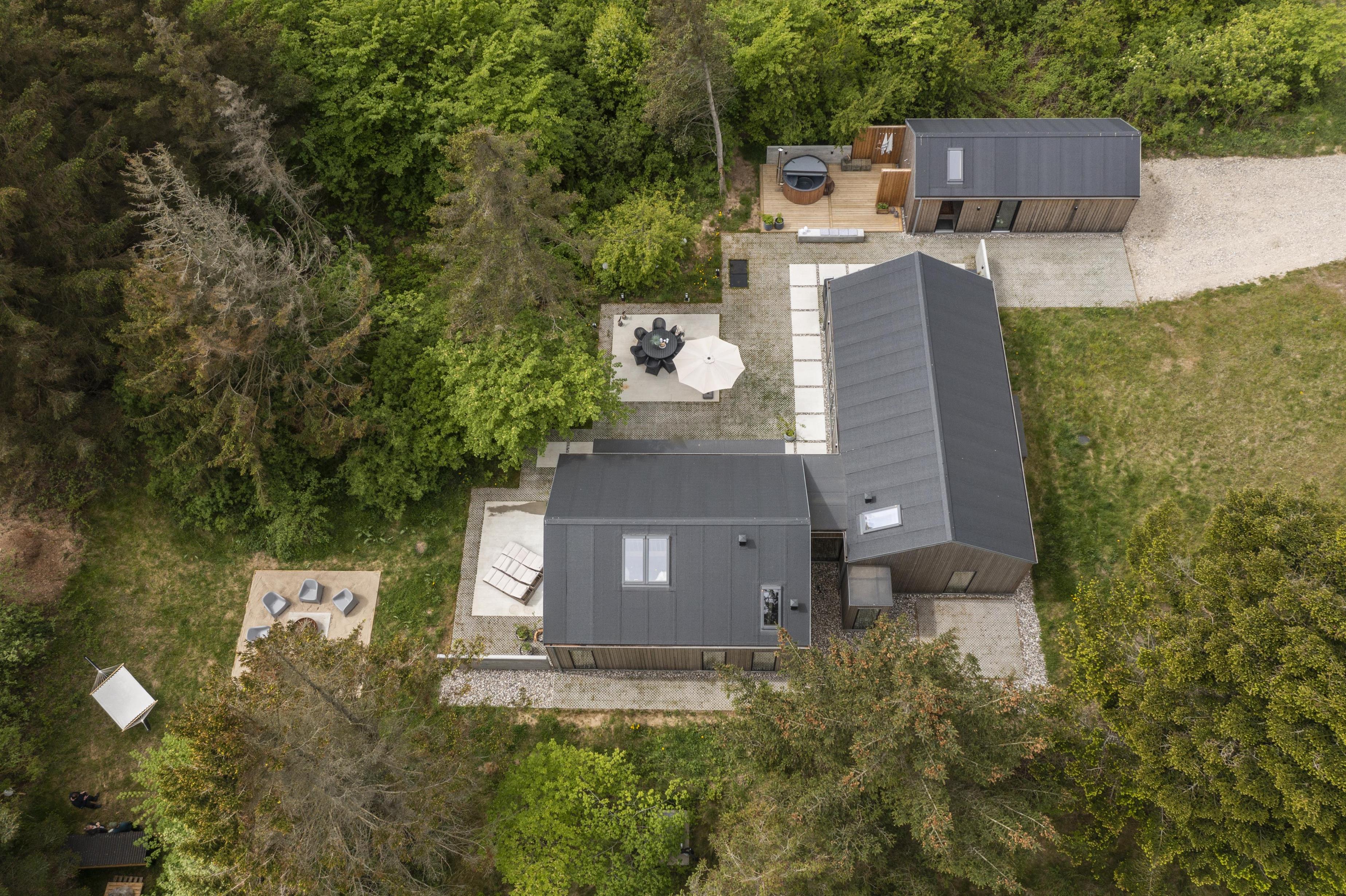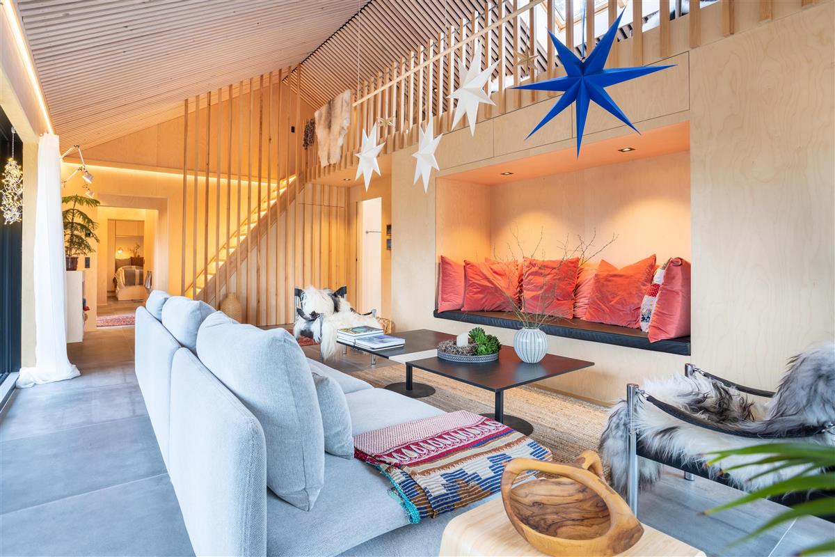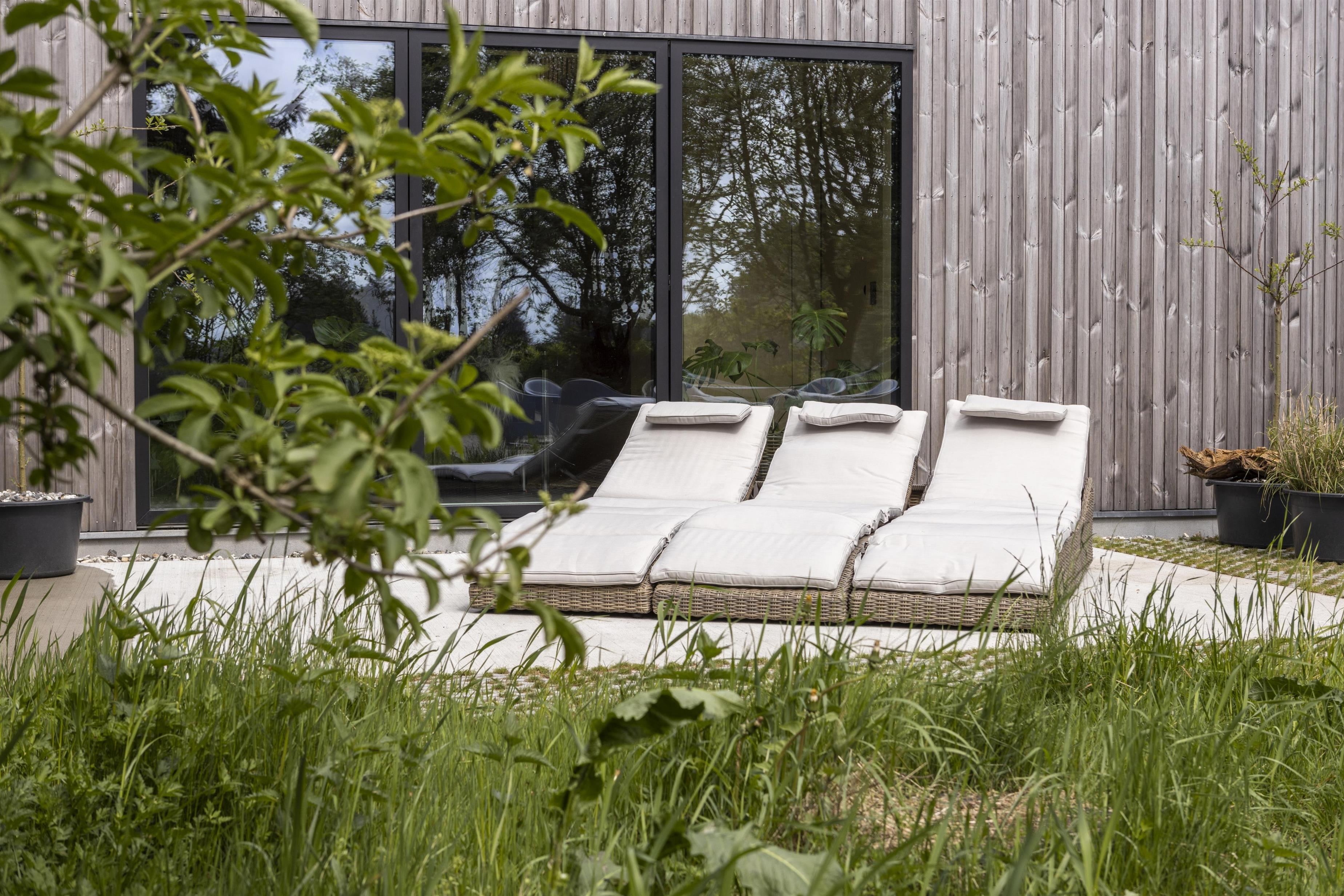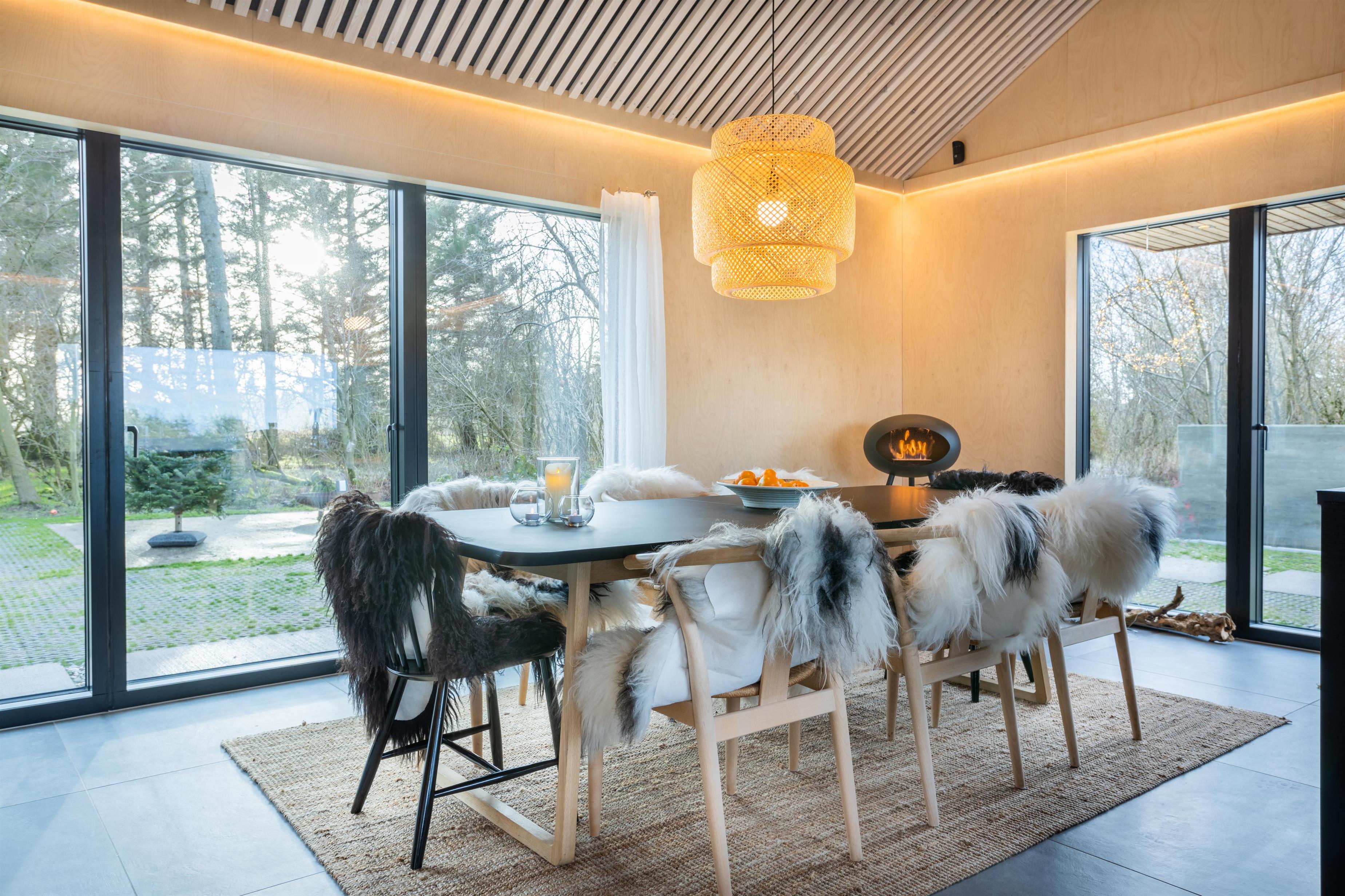 Both living rooms open directly onto a large, private terrace where you can enjoy the peace and natural beauty. With multiple seating areas, you can take in the fresh air at any time. Enjoy a delightful barbecue on the terrace, make a campfire to toast marshmallows, or recline on the sun loungers and bask in the sun. The terrace also provides direct access to the outdoor hot tub and sauna, offering a tranquil space to relax, take in the view, and enjoy each other’s company.