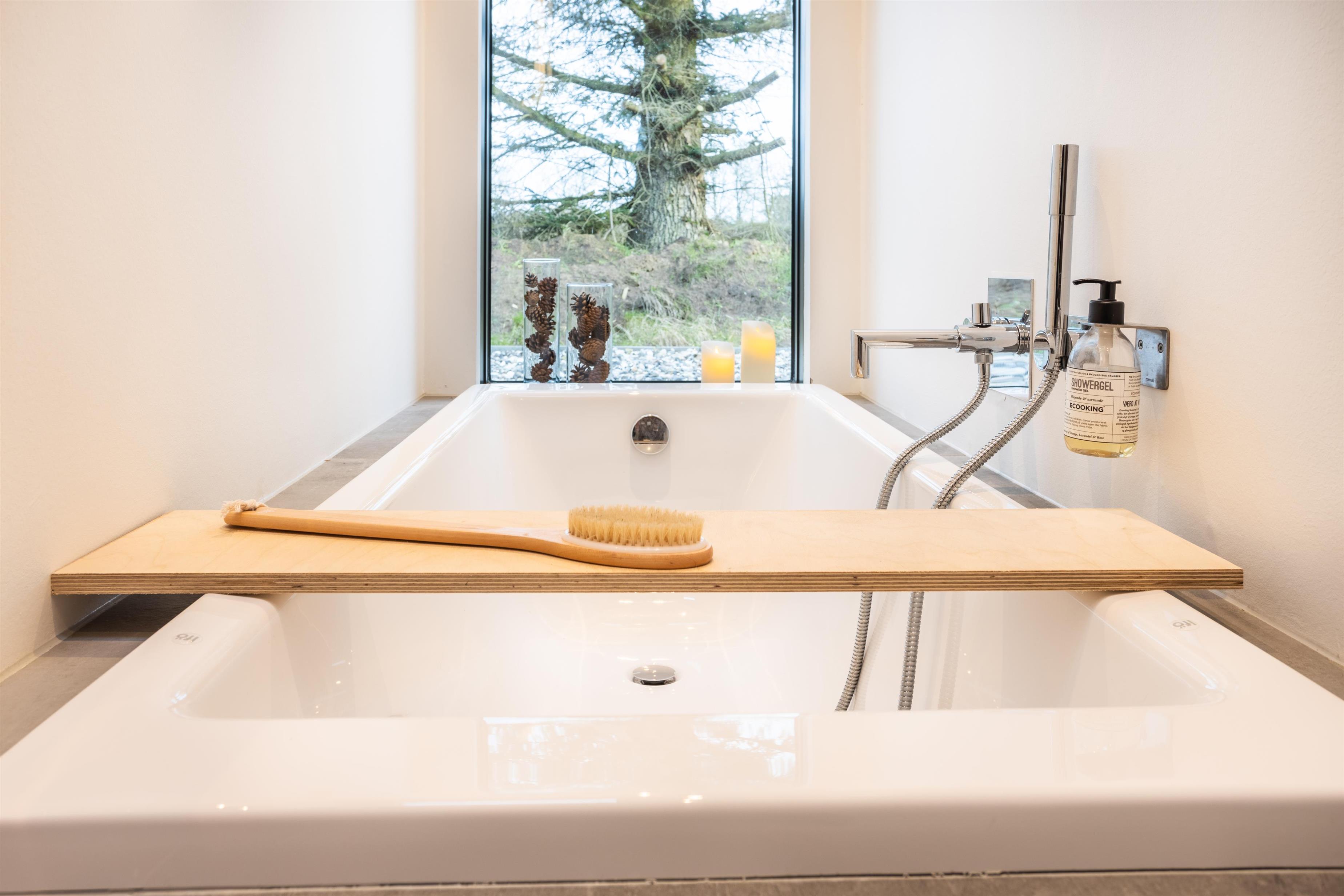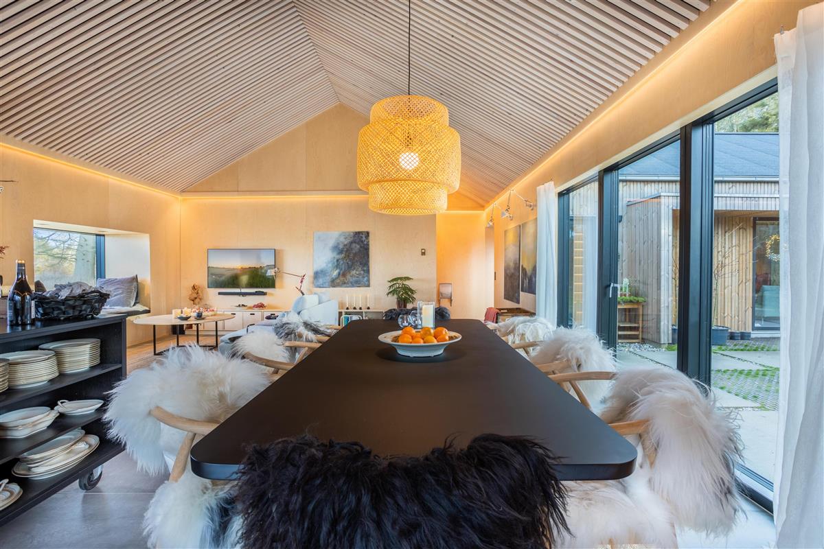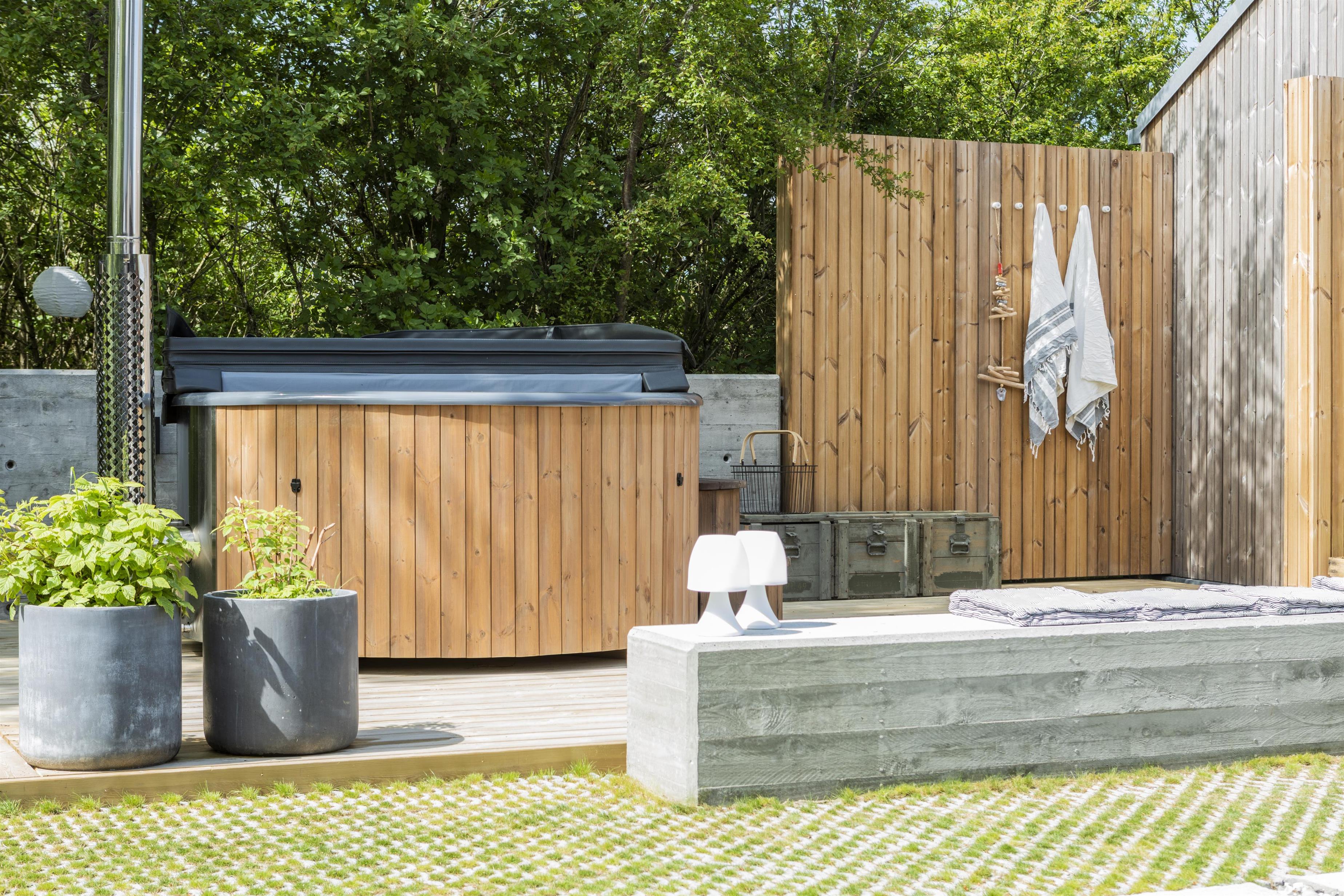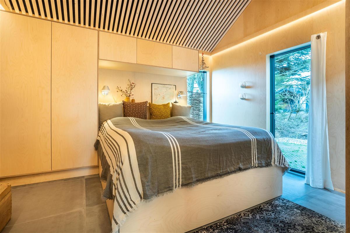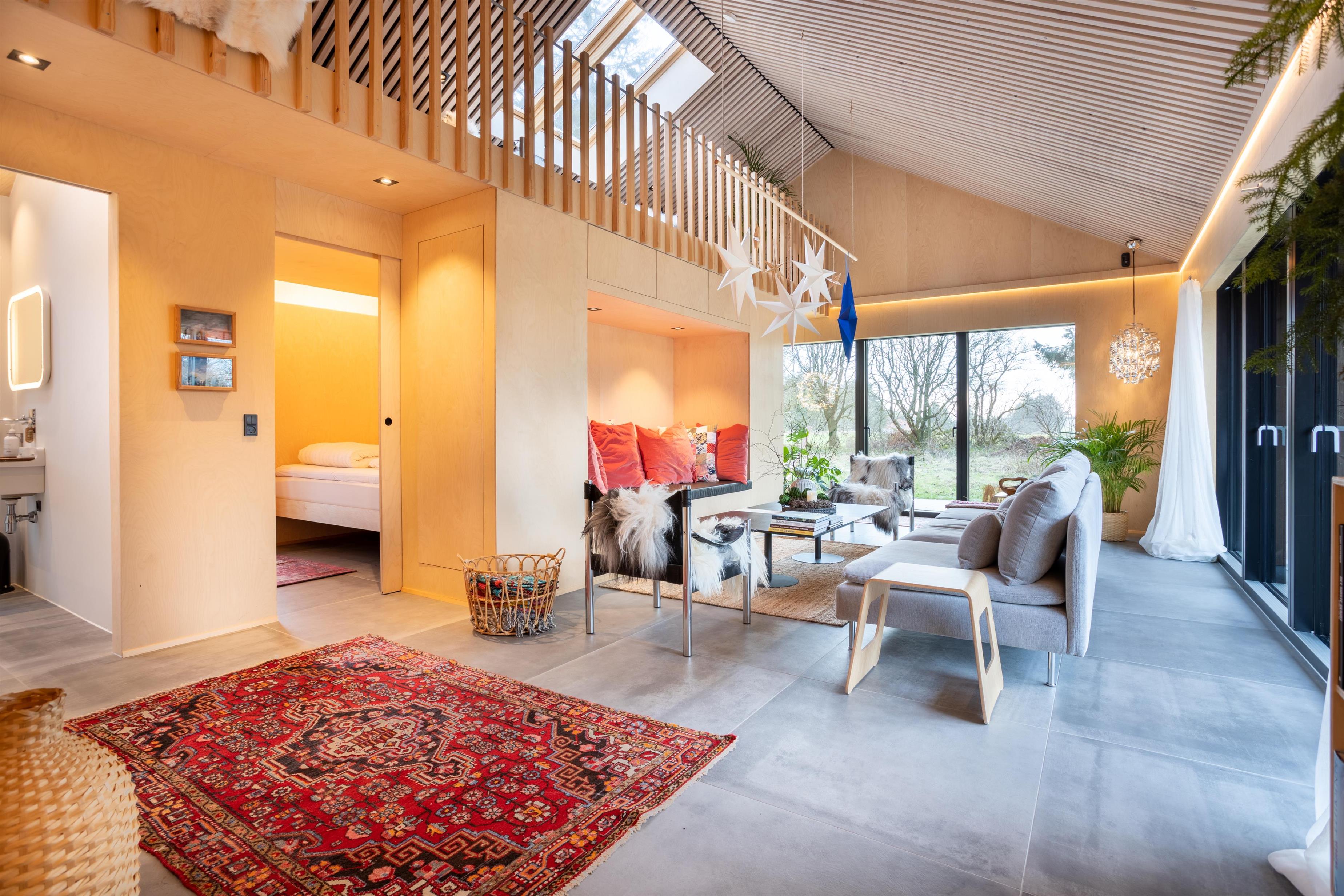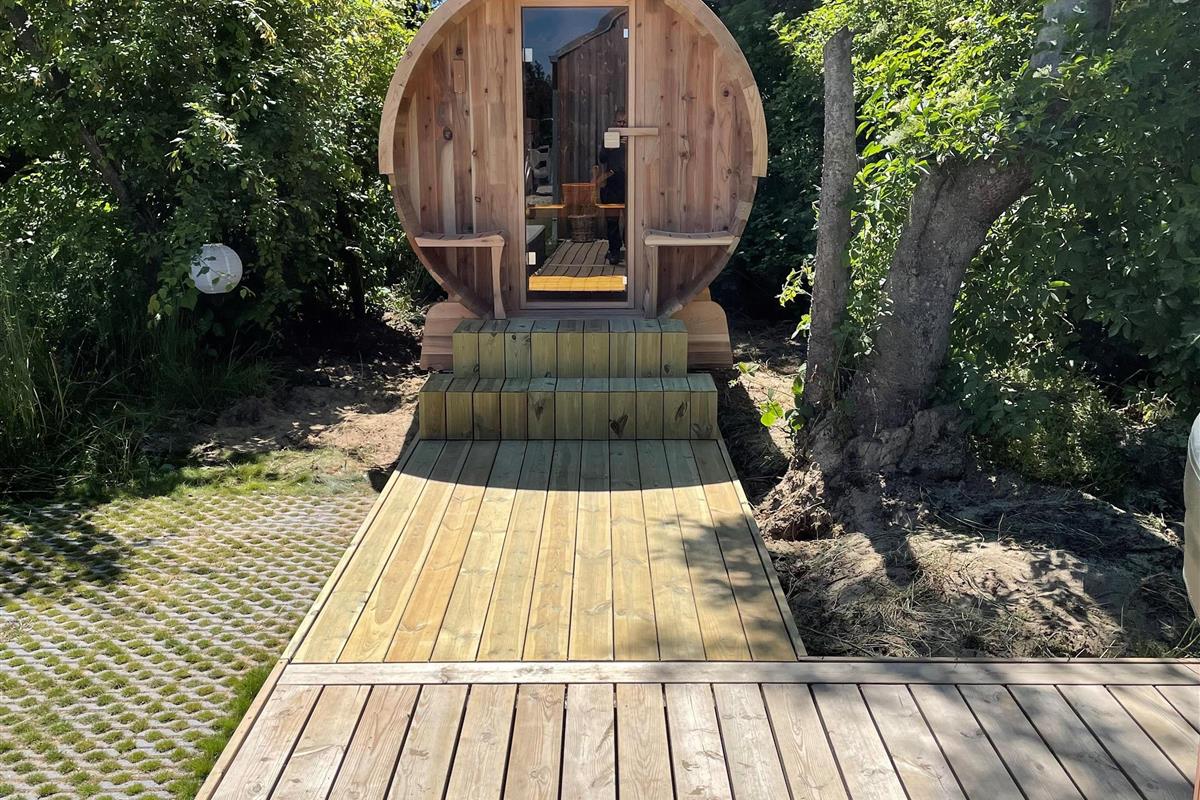 Both living rooms open directly onto a large, private terrace where you can enjoy the peace and natural beauty. With multiple seating areas, you can take in the fresh air at any time. Enjoy a delightful barbecue on the terrace, make a campfire to toast marshmallows, or recline on the sun loungers and bask in the sun. The terrace also provides direct access to the outdoor hot tub and sauna, offering a tranquil space to relax, take in the view, and enjoy each other’s company.