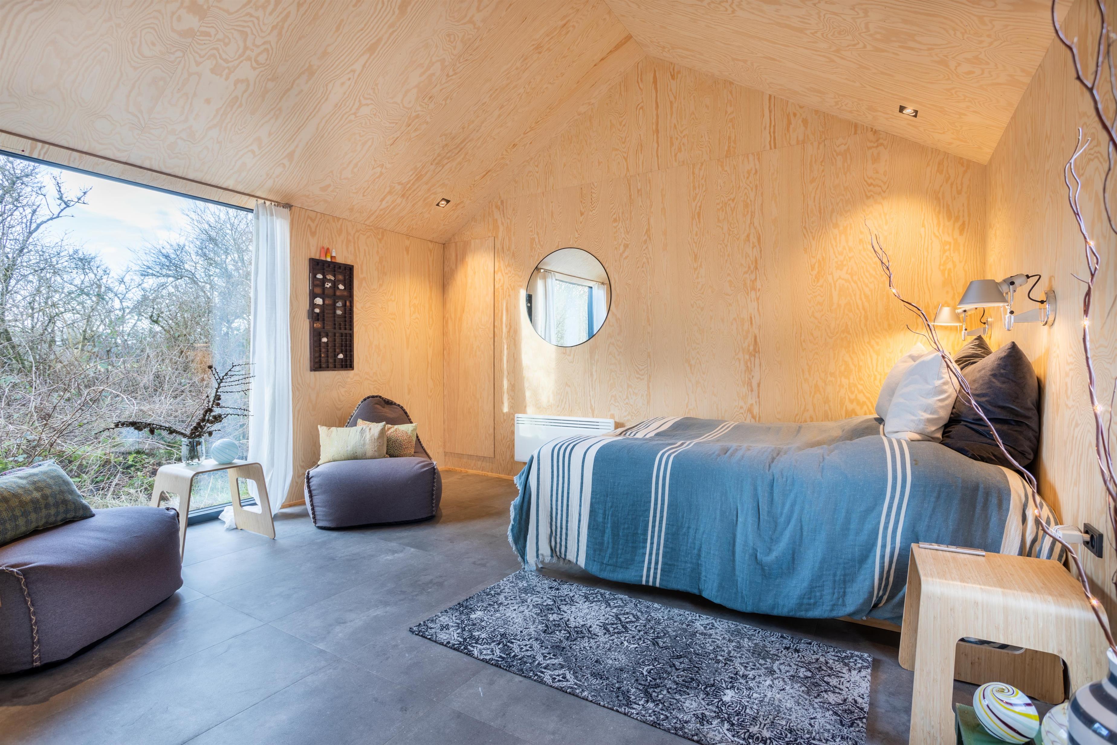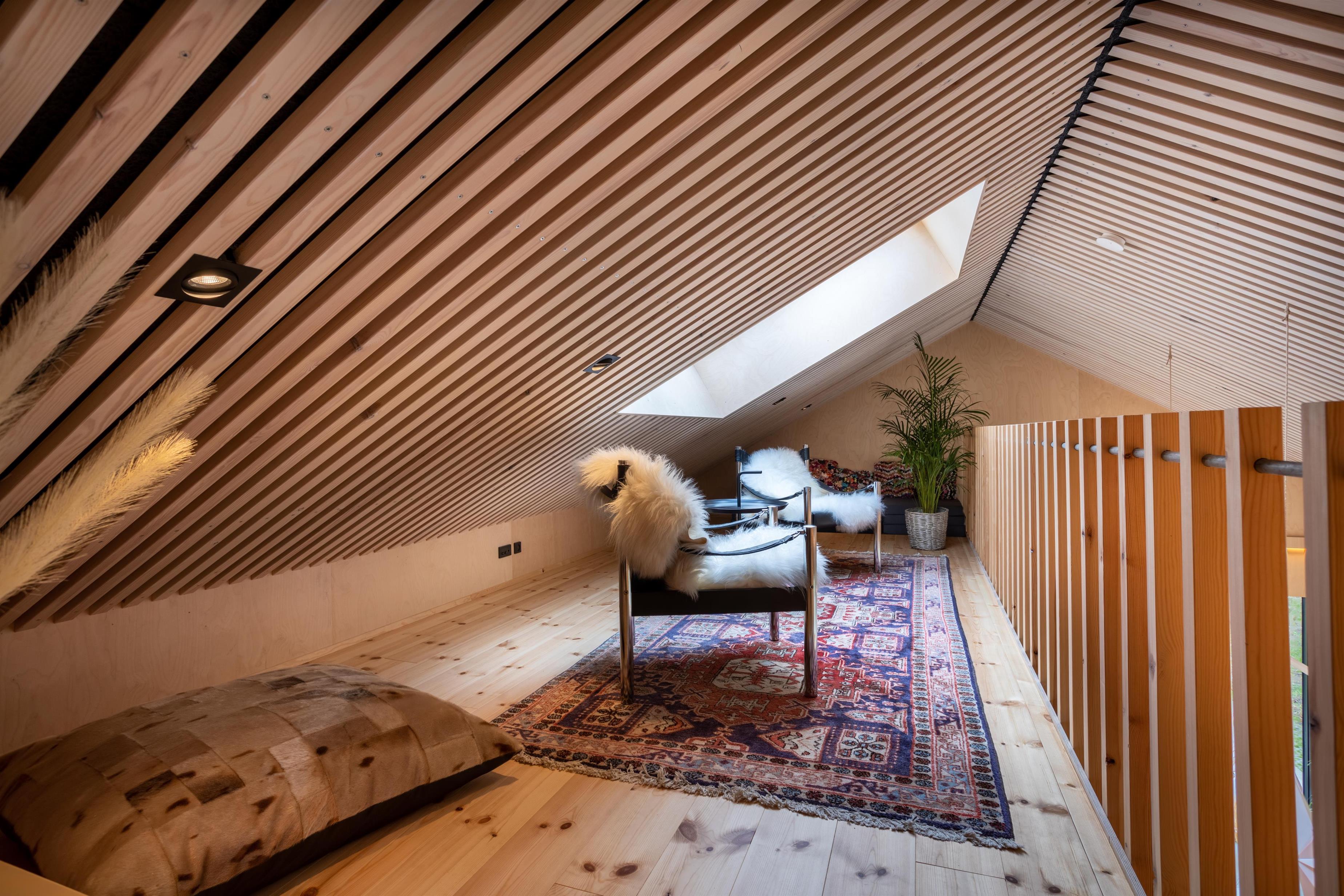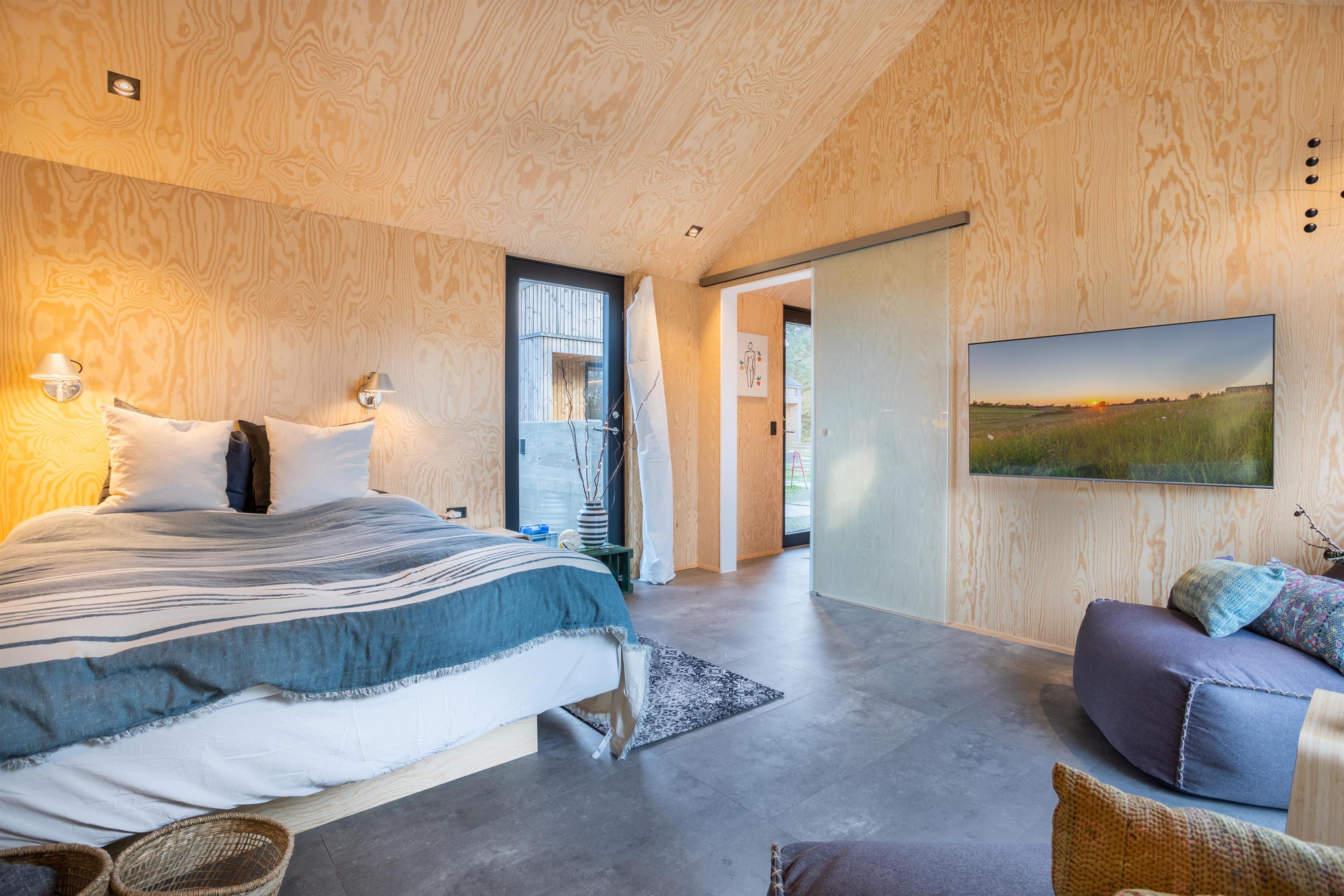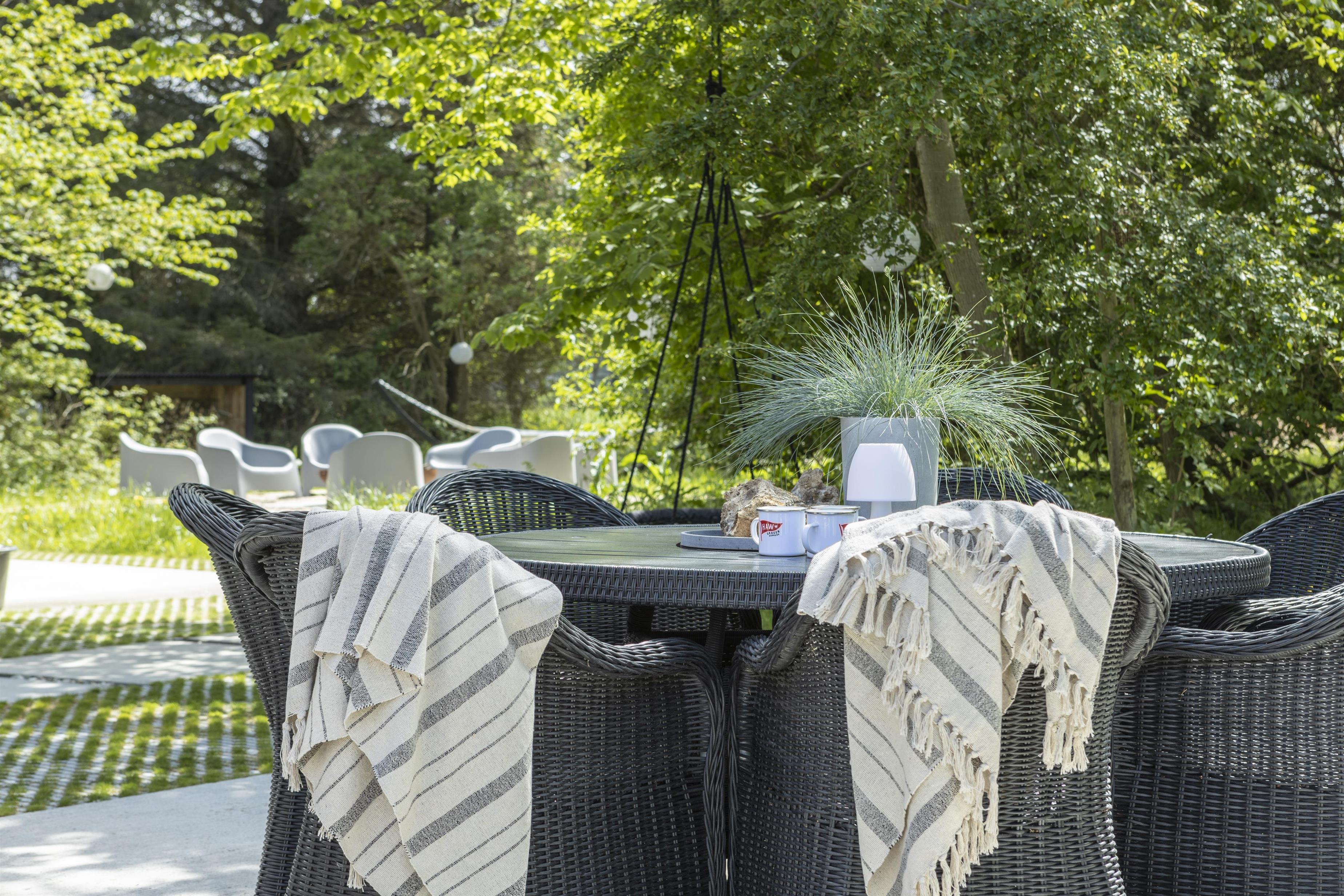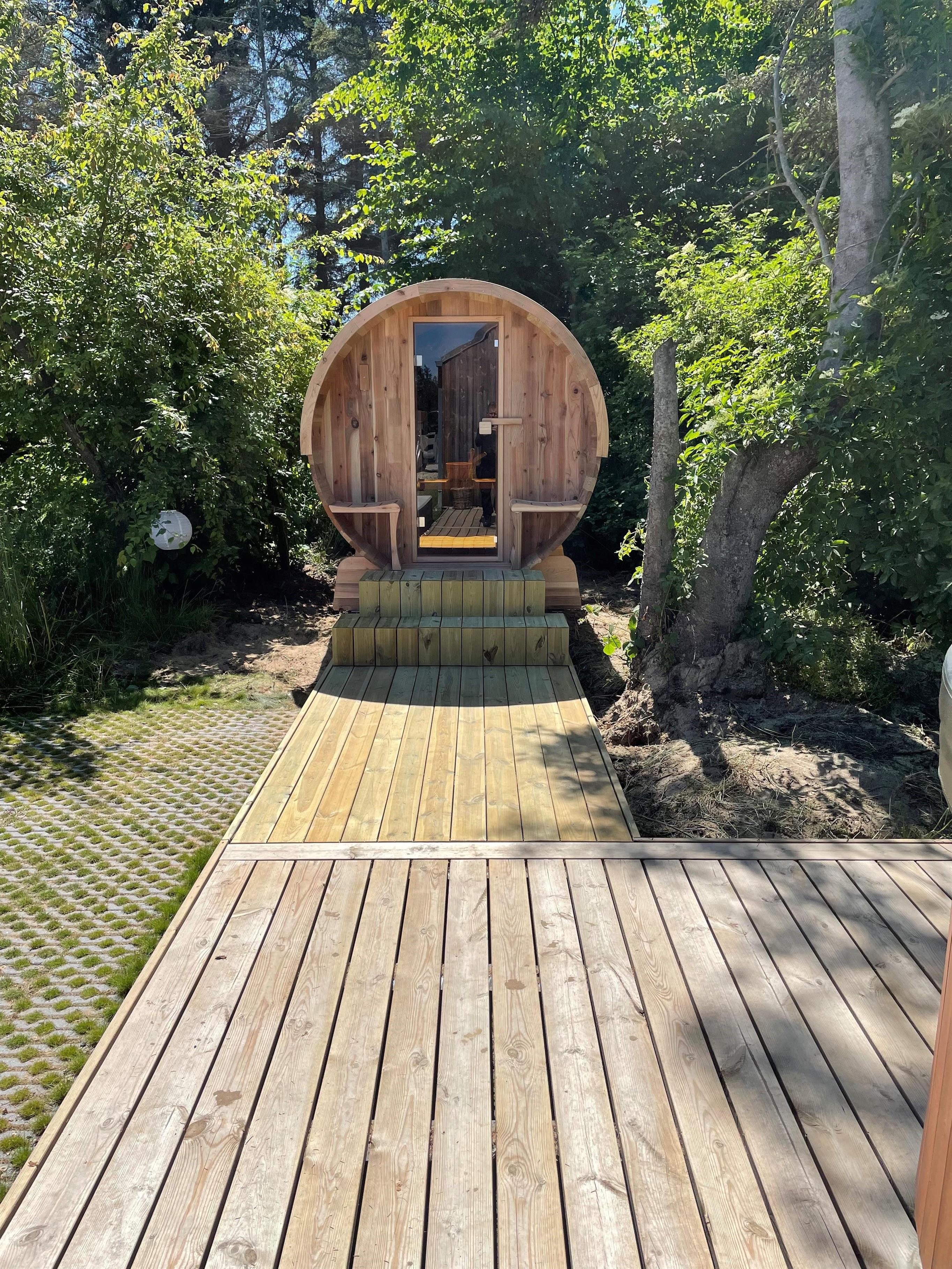 Both living rooms open directly onto a large, private terrace where you can enjoy the peace and natural beauty. With multiple seating areas, you can take in the fresh air at any time. Enjoy a delightful barbecue on the terrace, make a campfire to toast marshmallows, or recline on the sun loungers and bask in the sun. The terrace also provides direct access to the outdoor hot tub and sauna, offering a tranquil space to relax, take in the view, and enjoy each other’s company.
