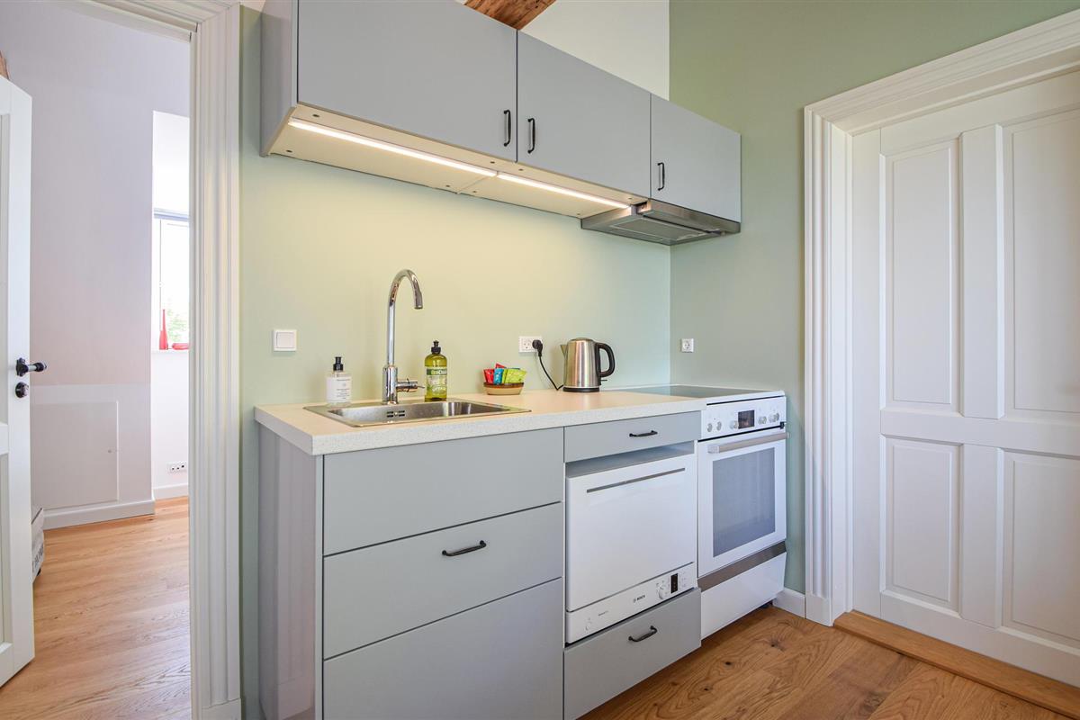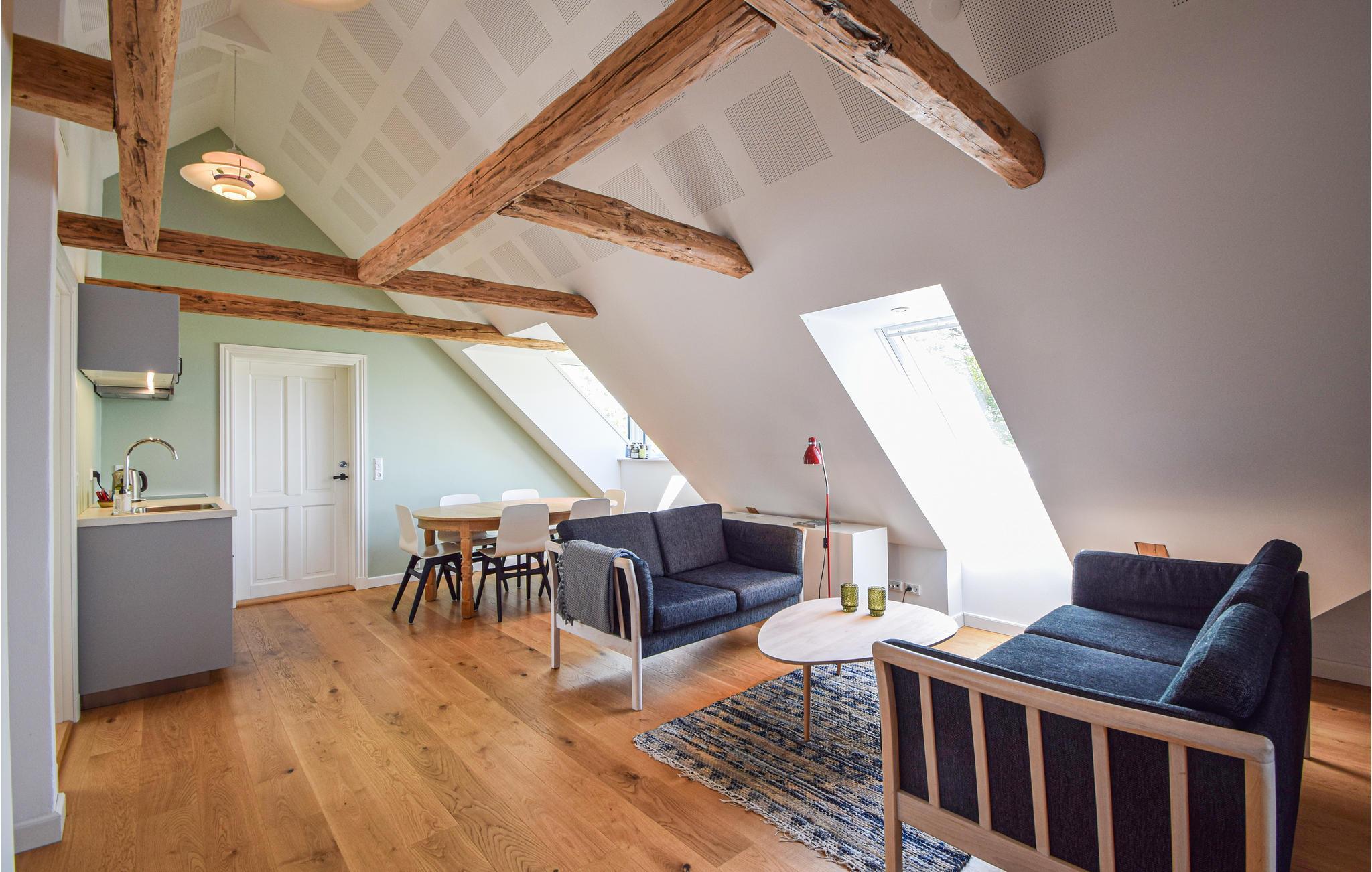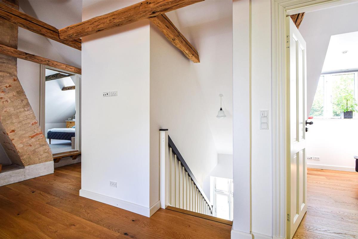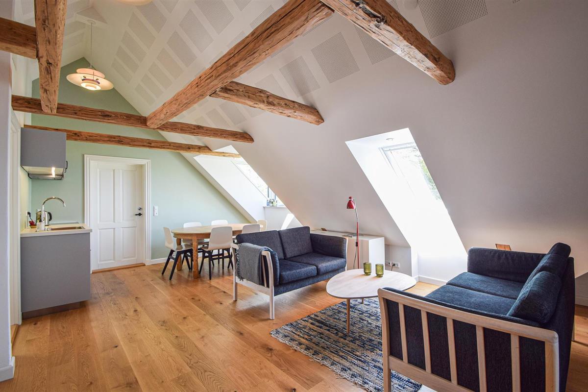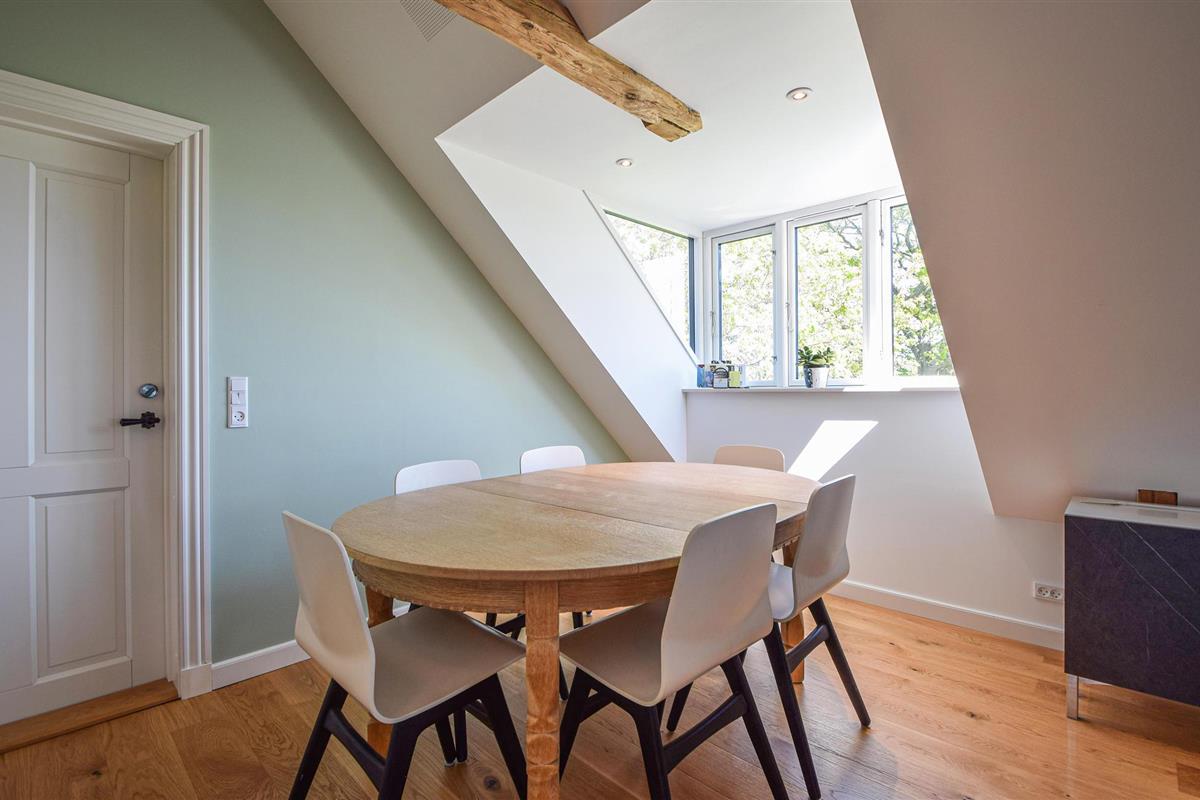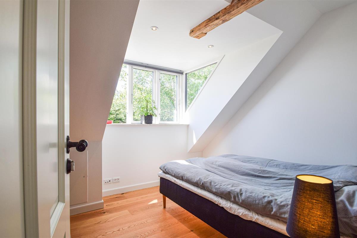 Mooi vakantiehuis in een prachtige omgeving in een huis vol charme en dicht bij Skanderborg. Het is gelegen op de 1e verdieping, die u bereikt via een goede trap. De flat is mooi, ruim en elegant gerenoveerd en er zijn goede materialen gebruikt. Tegelijkertijd is de fantastische sfeer bewaard gebleven. Hier vindt u 3 mooie slaapkamers - allemaal met tweepersoonsbedden en 2 goede badkamers, waarvan één op de begane grond. De mooie keuken is niet groot, maar van alle gemakken voorzien. Er is een grote eettafel en een bankgroep in open verbinding met de keuken. Er is een schuin plafond in de flat met mooie zichtbare balken, en er komt veel licht binnen door de grote dakramen.