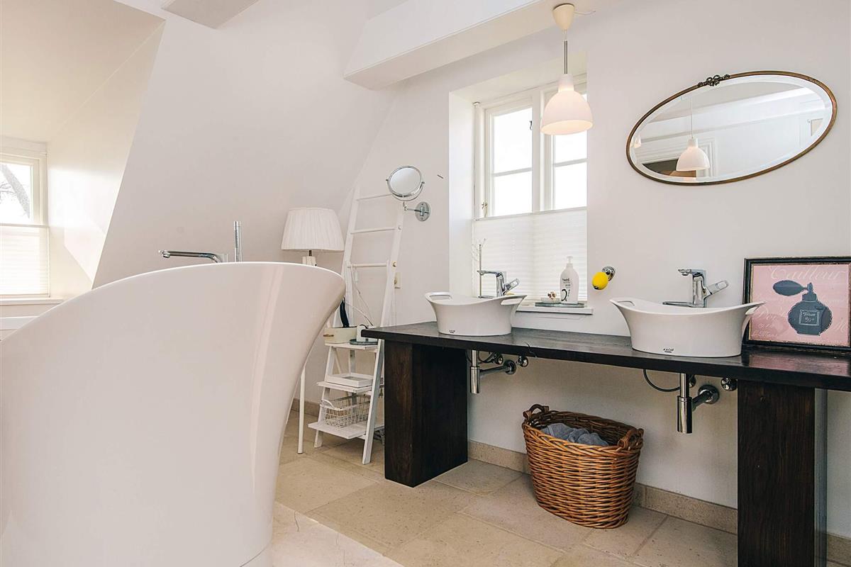 Oben im Dachgeschoss befindet sich ein kombinierter Wohn-/Schlafraum mit Sitzgelegenheit, TV und Doppelbett, sowie ein großes Bad mit strategisch platzierter Badewanne, von der sich ein bezaubernder Meerblick bietet.