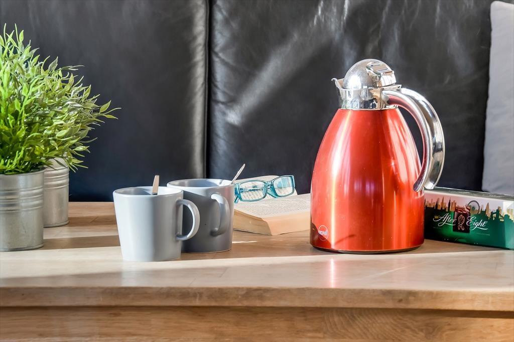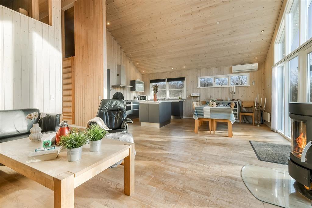 Bereits unmittelbar nach dem ersten Betreten, wird Sie die wunderbar leichte und luftige Wohnatmosphäre unwiderstehlich in den Bann ziehen. Sämtliche Wände sind mit Gemütlichkeit schaffenden, hellen Holzpanelen verkleidet. Besonders der Wohnraum imponiert mit seiner tollen Deckenhöhe und der großen Fensterpartie, die einen herrlichen Tageslichteinfall aus südlicher Richtung erzeugt. Die stilvolle Möblierung des Wohnraumes und die moderne, offen integrierte Küche tragen maßgeblich zum schönen Wohnambiente bei. Für behagliche Raumtemperaturen selbst an kühlen Tagen sorgt neben dem romantisch knisternden Kaminofen auch die Wärmepumpe, die Sie an heißen Sommertagen selbstverständlich auch mit einer zusätzlichen Kühlfunktion verwöhnt. Auch die übrigen Räume des Ferienhauses sind wohl durchdacht eingerichtet. Alle drei vorhandenen Schlafräume empfangen Sie mit komfortablen Doppelbetten und einem Fernseher. Sowohl das Badezimmer, als auch das Gäste-WC befinden sich in einem ansprechenden, gepflegten Zustand. Nach einem langen Urlaubstag, den Sie vielleicht beim Surfen oder mit einem interessanten Ausflug verbracht haben, laden der im Badezimmer platzierte Whirlpool und die Sauna zu traumhaft erholsamen Momenten voller Wellnessflair ein.