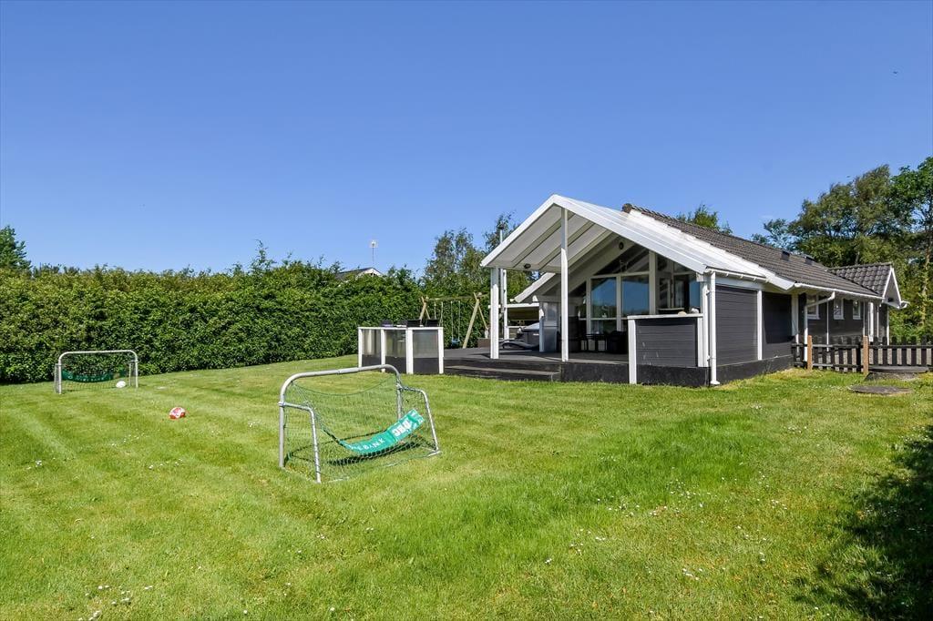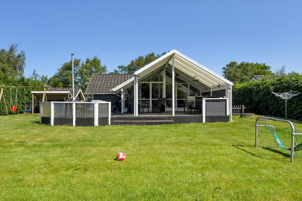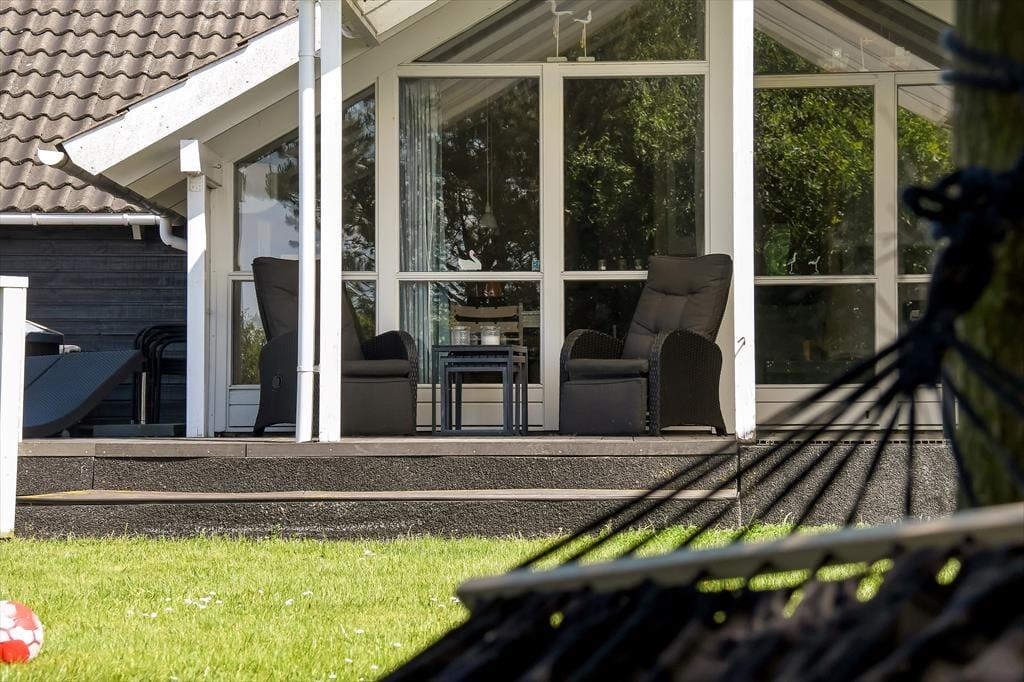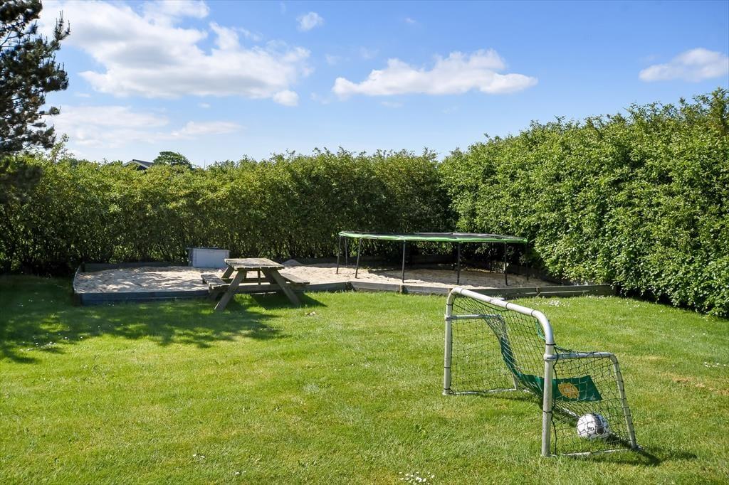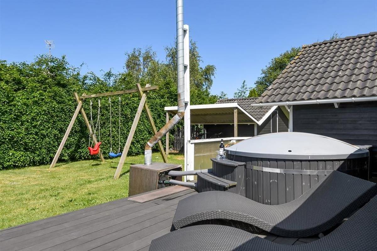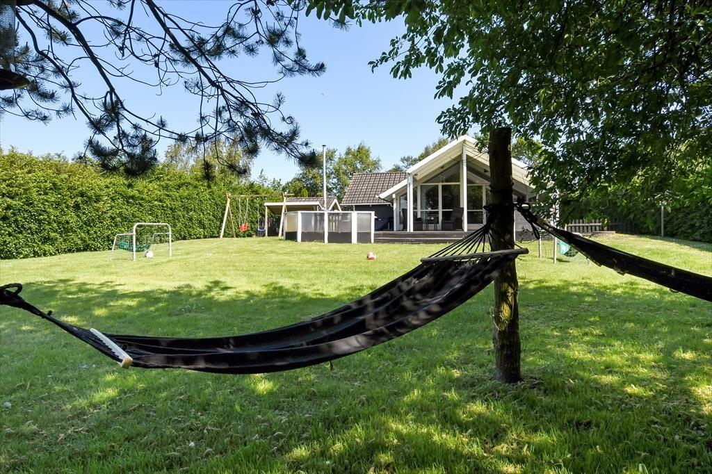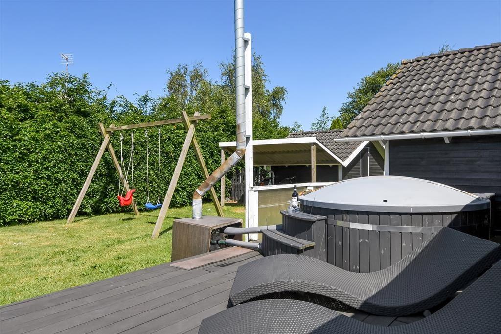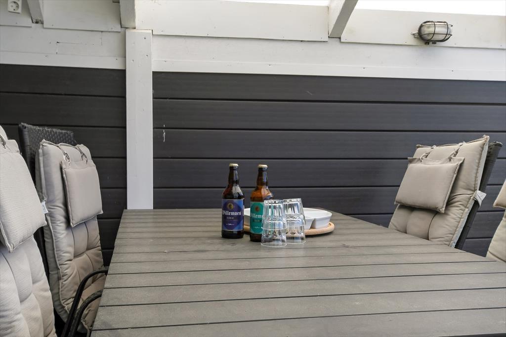 An einem sonnigen Sommertag findet das ganze Leben im grünen Garten statt: Die Kinder können sich beim Schaukeln und Fußballspielen auf dem Rasen vergnügen, und wenn du in ihrer Nähe sein möchtest, während sie auf dem Trampolin springen oder im Sandkasten spielen, kannst du dich am Tisch-Bank-Set direkt daneben niederlassen. Ein Nickerchen in der Hängematte im Schatten der Bäume kann ebenfalls verlockend sein, und wenn ihr grillen oder Eiskaffee trinken möchtet, ist es herrlich, auf der großen Terrasse des Ferienhauses zu sitzen, die sowohl offene als auch überdachte Sitzgelegenheiten bietet. Auf der Terrasse findest du übrigens eine schwedische Badetonne, sodass du selbst bei kühlem Wetter im warmen Wasser entspannen und den Blick auf die grüne Bepflanzung des Gartens genießen kannst.