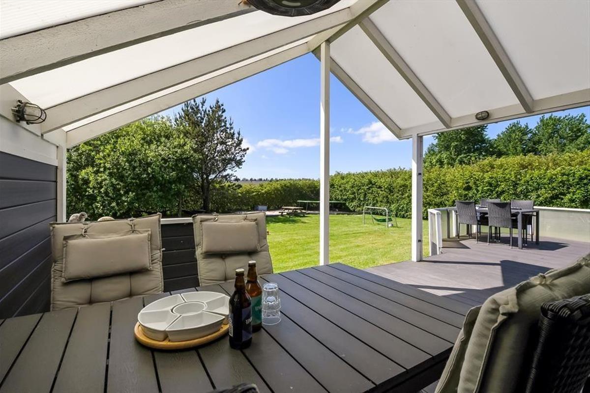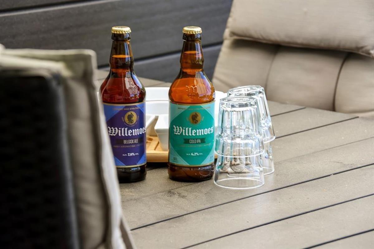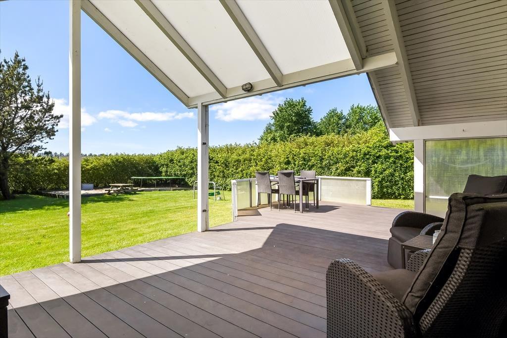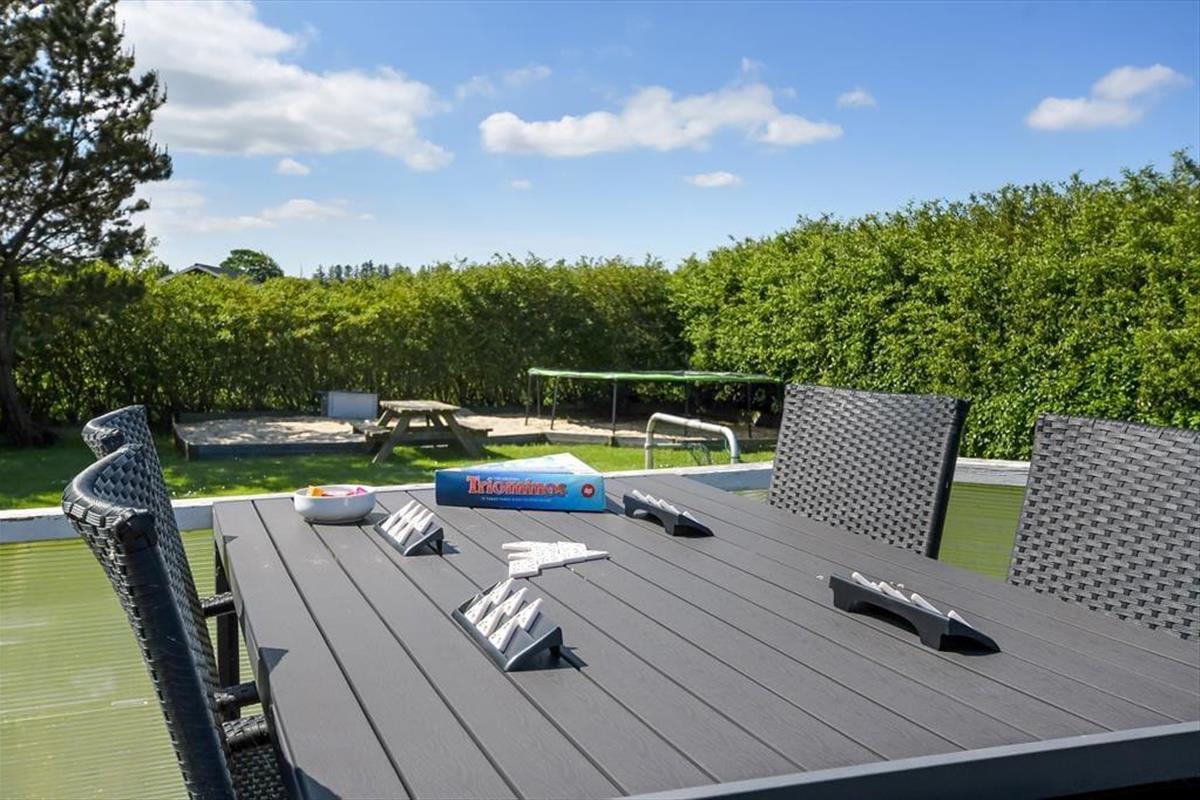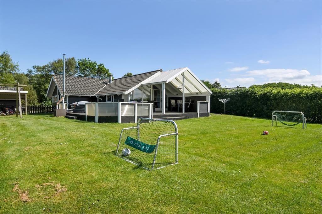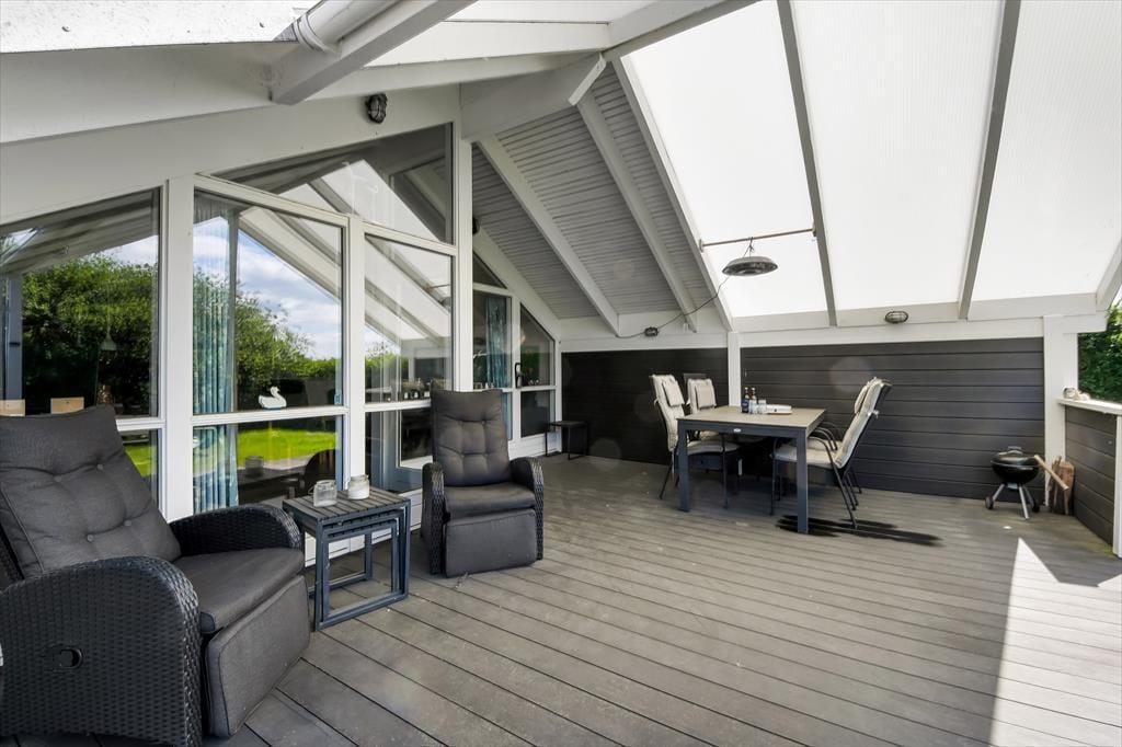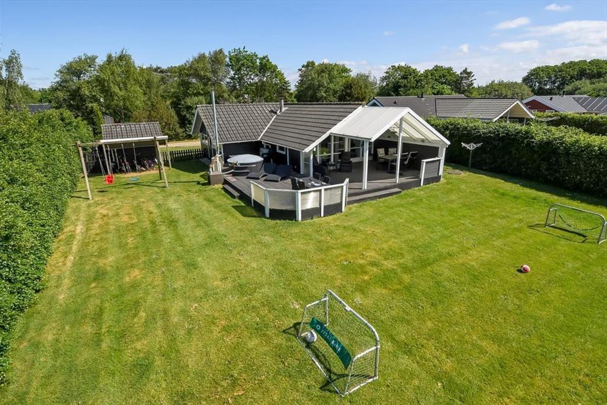 An einem sonnigen Sommertag findet das ganze Leben im grünen Garten statt: Die Kinder können sich beim Schaukeln und Fußballspielen auf dem Rasen vergnügen, und wenn du in ihrer Nähe sein möchtest, während sie auf dem Trampolin springen oder im Sandkasten spielen, kannst du dich am Tisch-Bank-Set direkt daneben niederlassen. Ein Nickerchen in der Hängematte im Schatten der Bäume kann ebenfalls verlockend sein, und wenn ihr grillen oder Eiskaffee trinken möchtet, ist es herrlich, auf der großen Terrasse des Ferienhauses zu sitzen, die sowohl offene als auch überdachte Sitzgelegenheiten bietet. Auf der Terrasse findest du übrigens eine schwedische Badetonne, sodass du selbst bei kühlem Wetter im warmen Wasser entspannen und den Blick auf die grüne Bepflanzung des Gartens genießen kannst.