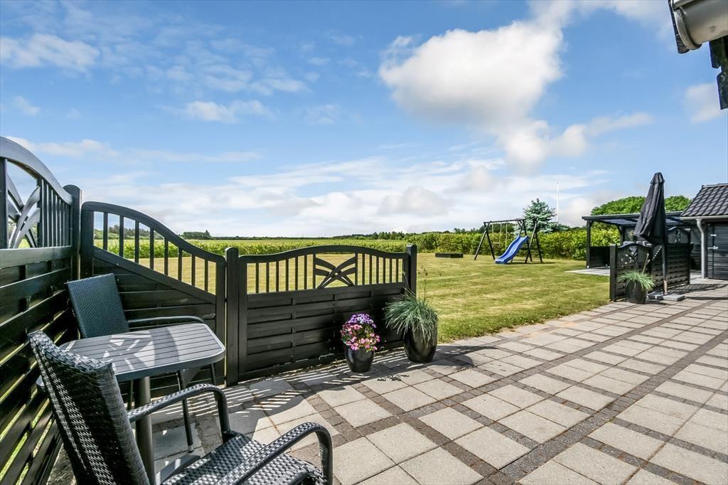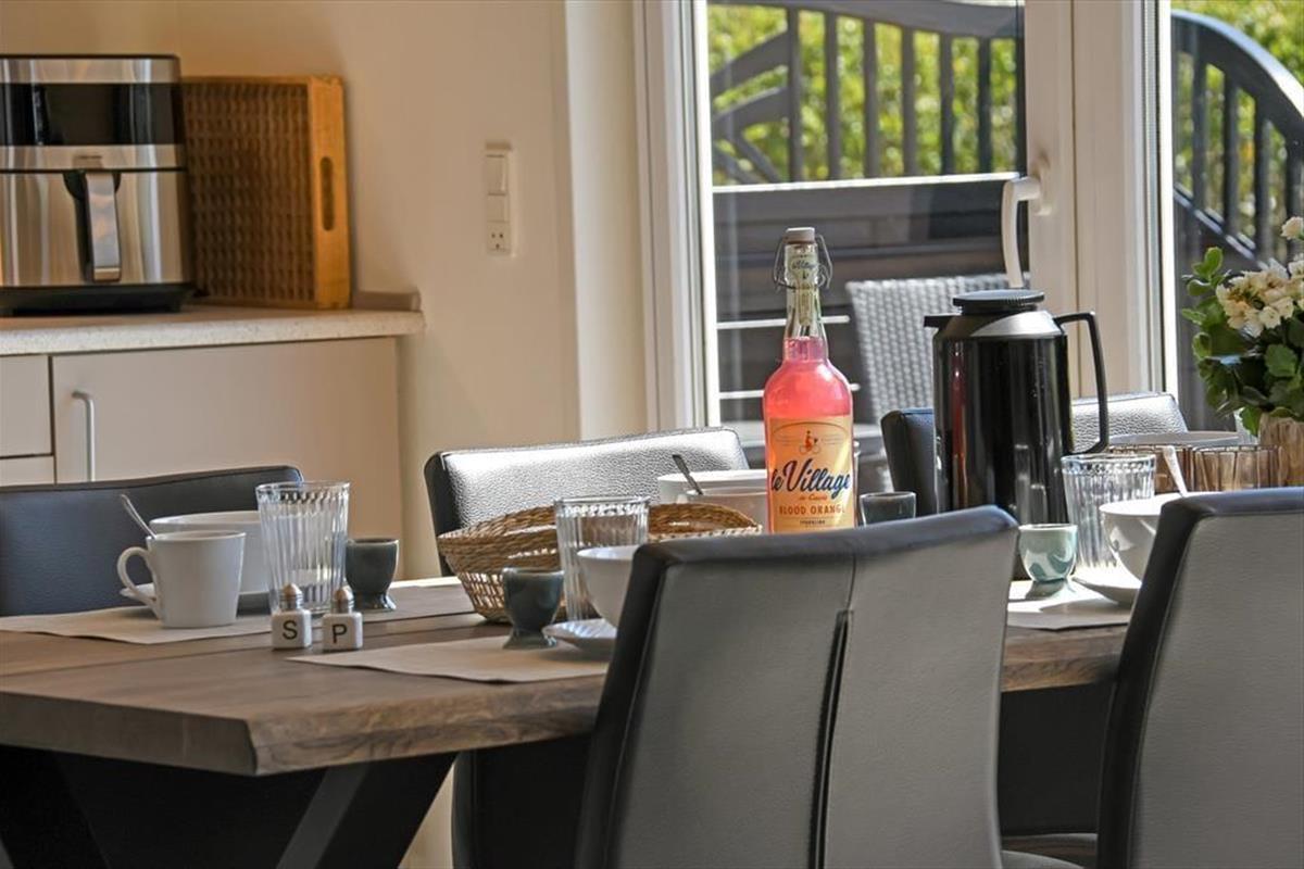 Dein schöner Garten ist aufgrund der Lage am Ende der Sackgasse angenehm ungestört. Die Grasfläche bietet Platz zum Umhertollen und Spielen. Für die kleinsten Urlauber stehen ein Schaukelgerüst mit Rutsche und eine Sandkiste bereit. Während sich deine Kinder vergnügen, lässt du dich in aller Ruhe auf einem der Gartenstühle nieder und genießt den Ausblick über die offenen Felder hinter der Hecke. Die Terrasse ist sonnenverwöhnt und schön abgeschirmt, sodass du meist einen windgeschützten Aufenthaltsplatz findest.