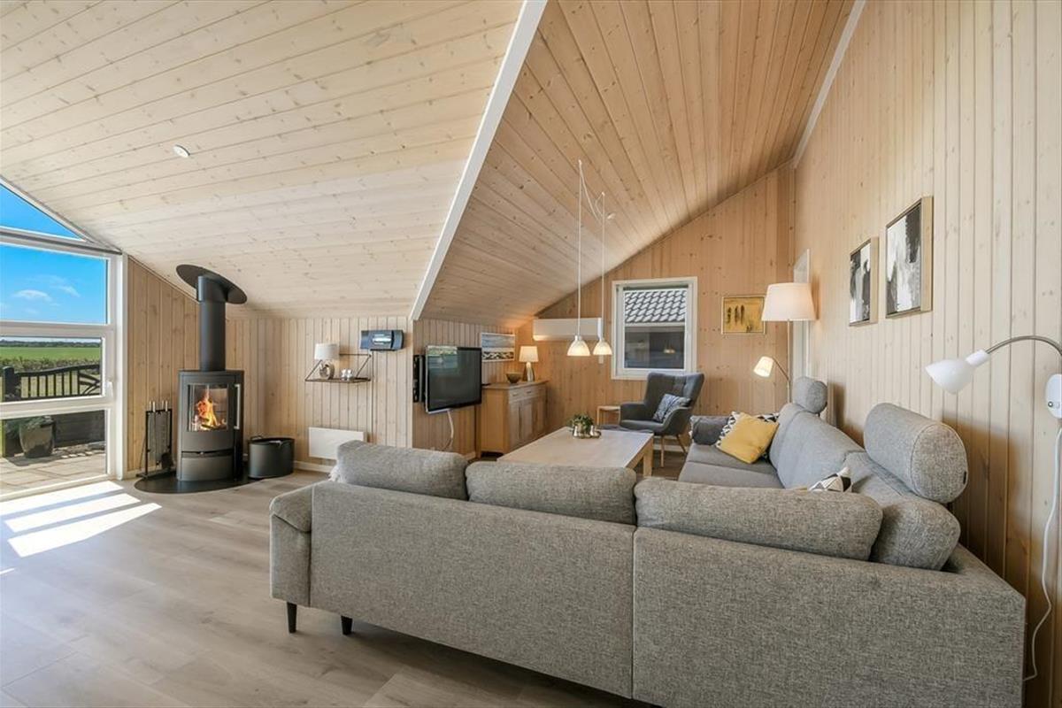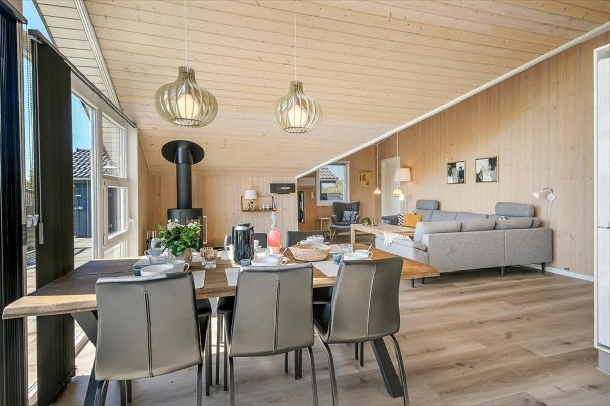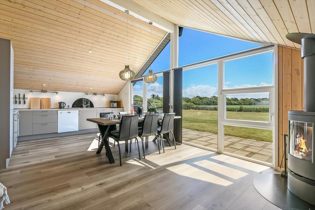 Dank der großen Giebelfenster, die einen tollen Tageslichteinfall bedingen, verschmelzen das Hausinnere und die umliegende Landschaft förmlich miteinander. Der Esstisch ist direkt am Fenster platziert. In der offenen Küche genießt du selbst bei der Zubereitung der Mahlzeiten die Sonnenstrahlen und die Nähe deiner Lieben im Wohnraum. An kühlen Tagen sorgt ein Kaminofen für behagliche Wärme und ein Maximum an Stimmung. Pure Entspannung verspricht der im Badezimmer untergebrachte Whirlpool. Nachts kannst du dich mit deiner Familie in drei guten Schlafräumen bestens ausschlafen.