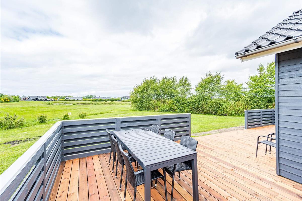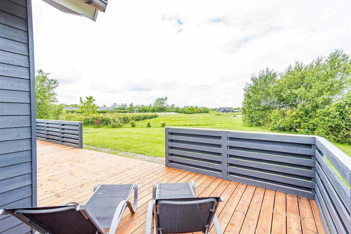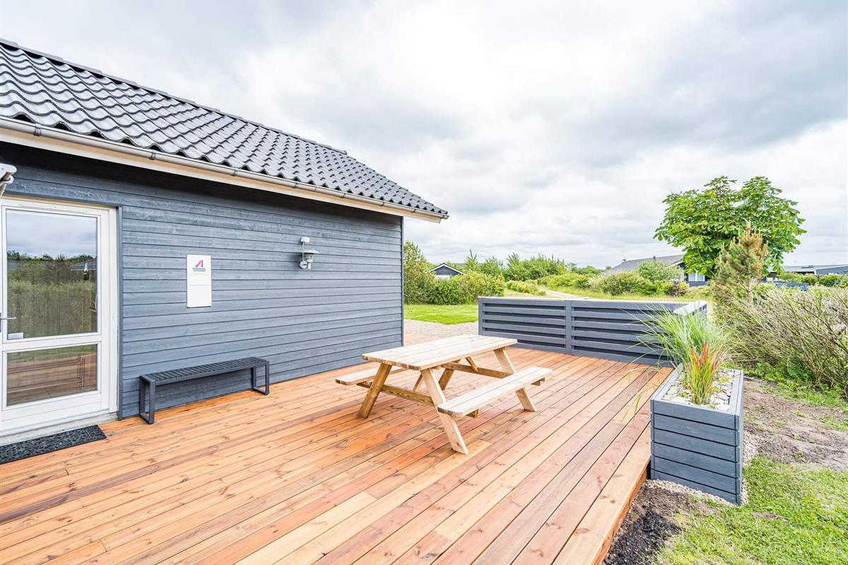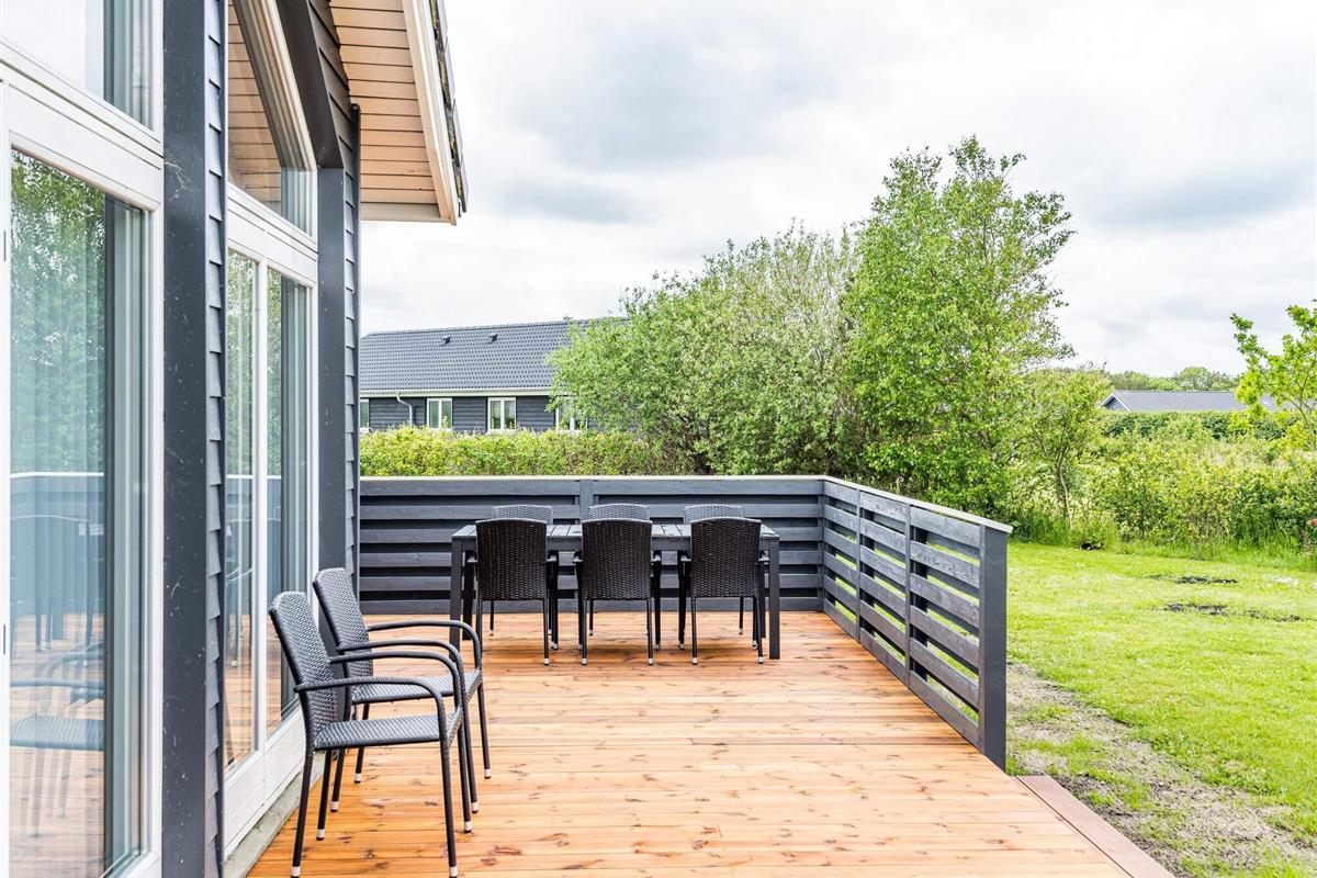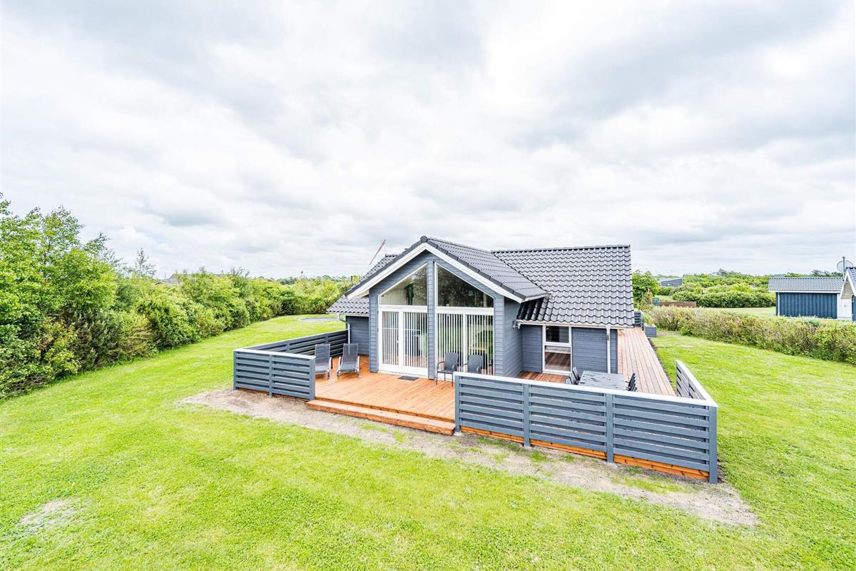 Im Außenbereich findet man eine weitläufige Terrassenfläche mit mehreren gemütlichen Sitzecken. Sie wohnen hier unweit der Küste von Skaven Strand, auf einem schönen, großen Rasengrundstück mit Gartentrampolin (Nutzung nur auf eigenes Risiko) sowie Platz für Spiel und Sport an der frischen Luft.