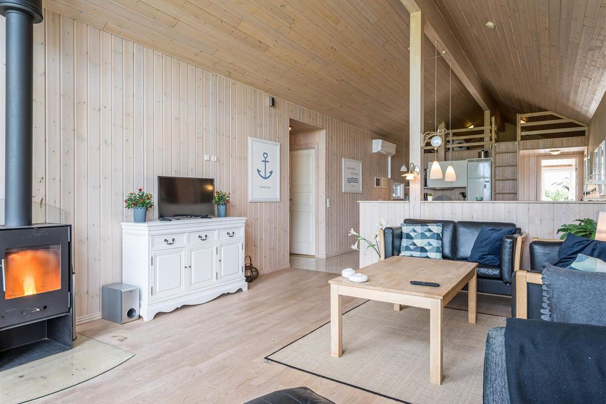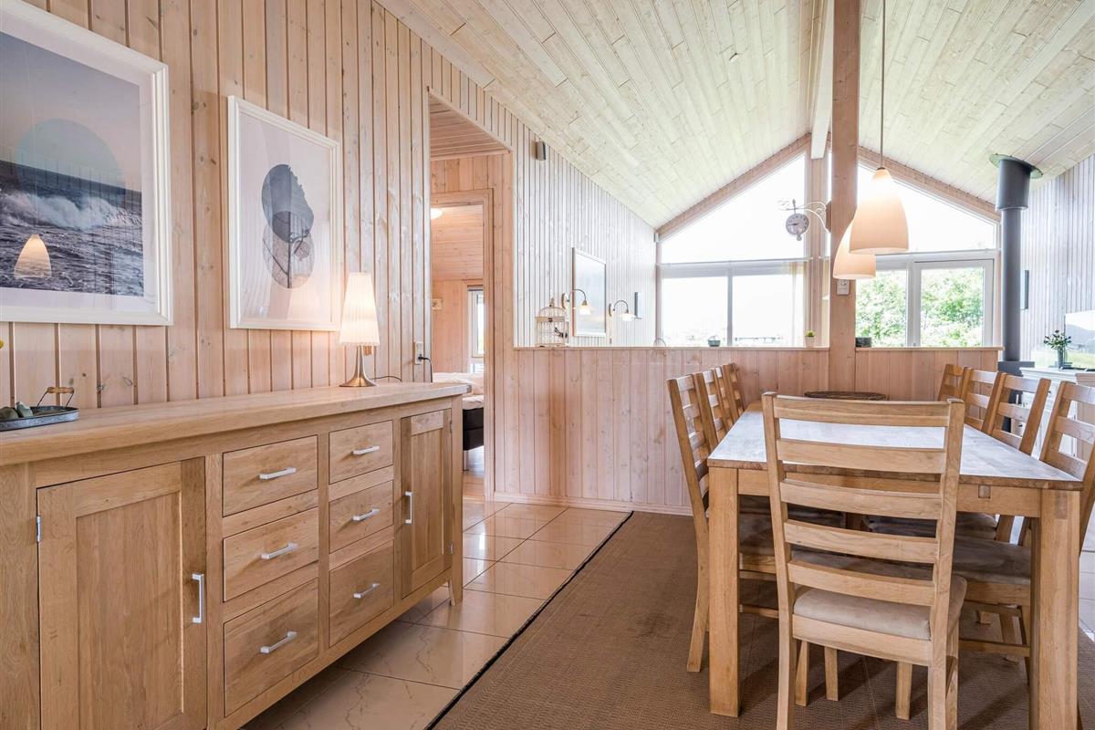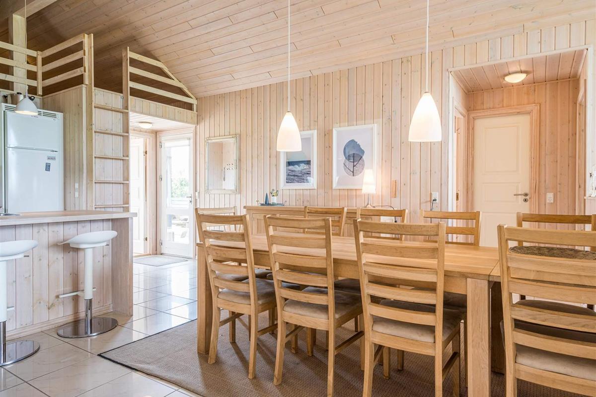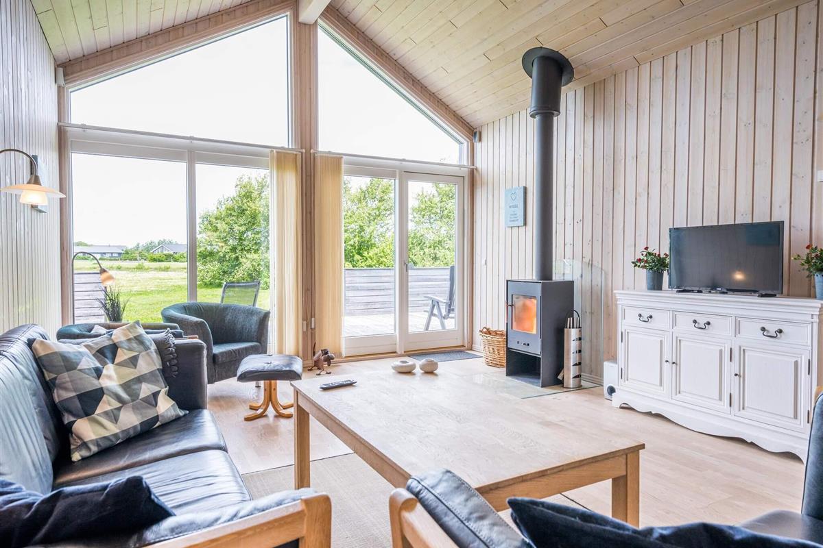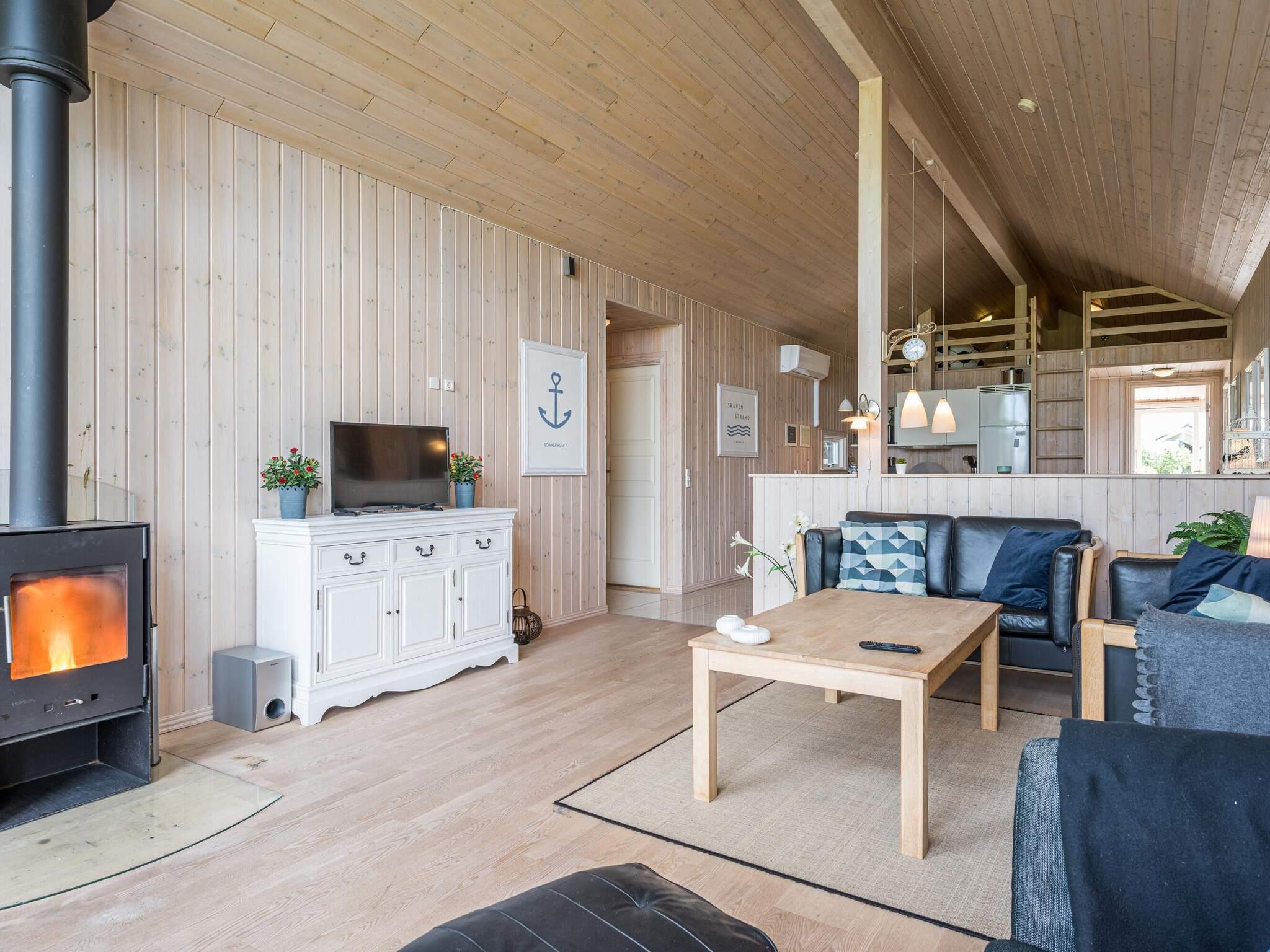 Sehr gemütliches Ferienhaus für bis zu acht Personen bei Skaven Strand! Innen offener, gemütlich eingerichteter Küchen-/Wohnbereich für das Familienleben, inklusive Holzofen und Essplatz. Vom Wohnbereich aus haben Sie Zugang zu einer schönen, großen Holzterrasse, auf der Sie die Sonnentage und Sommerabende genießen können.