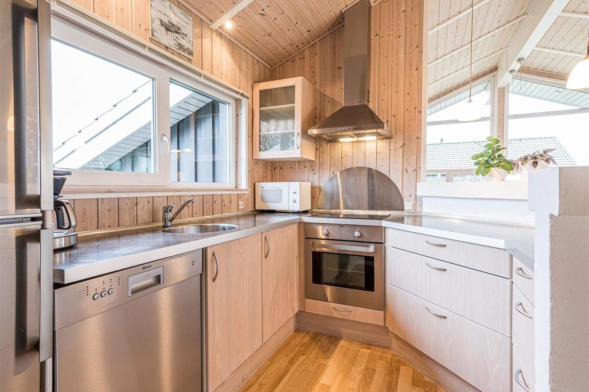 Das Haus ist modern eingerichtet und bietet alles, was Sie für einen entspannten Urlaub brauchen. Die helle, offene Küche ist direkt mit dem gemütlichen Wohnbereich verbunden. Das offene Dach bis zum Giebel sorgt für ein großzügiges Raumgefühl und eine ganz besondere, einladende Atmosphäre – hier fühlt man sich sofort wohl.
