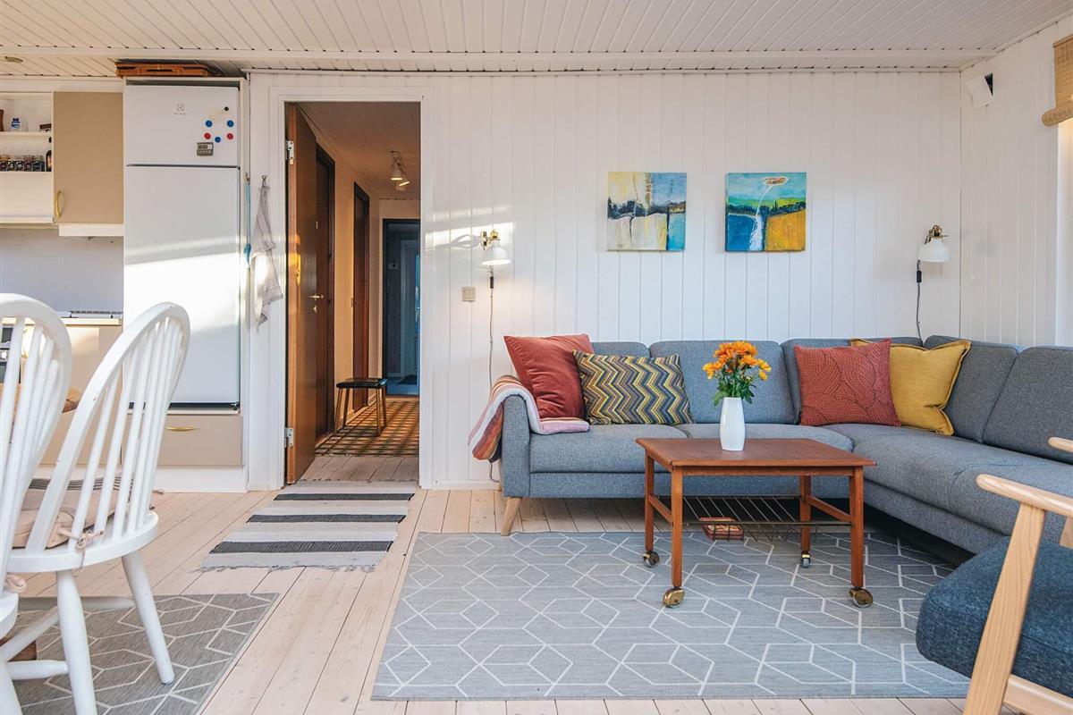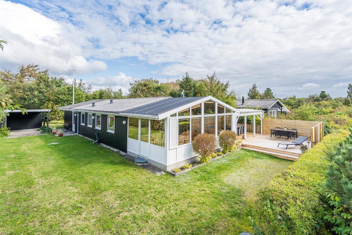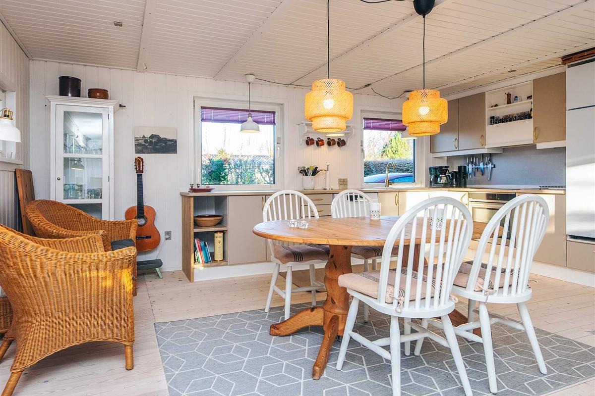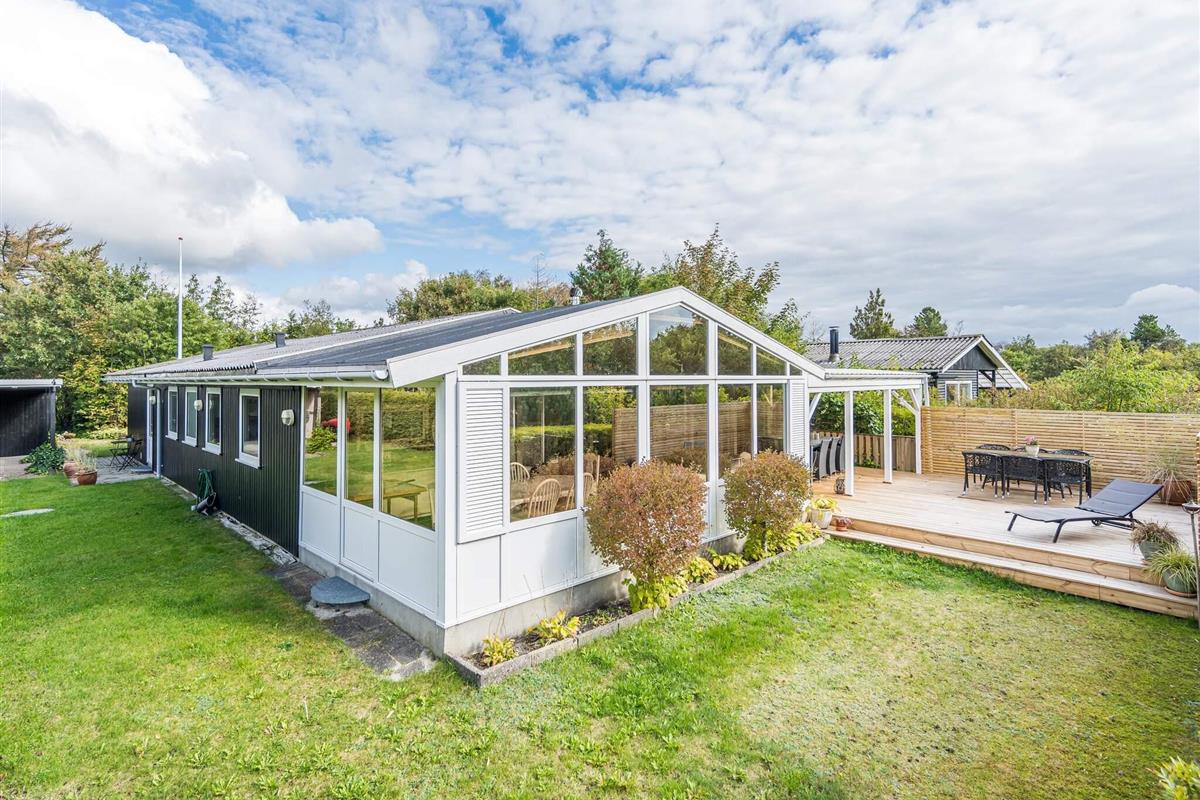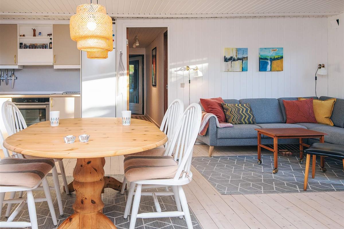 Gemütliches Ferienhaus nur 400 Meter vom Wasser entfernt, im alten und charmanten Teil von Skaven Strand. Das Haus verfügt über ein helles und einladendes Wohnzimmer mit offener Verbindung zur Küche und zum Essbereich, der um einen Holzofen herum angeordnet ist. Vom Wohnzimmer aus gelangt man in den hellen und luftigen Wintergarten, der direkt auf eine große, teilweise überdachte Holzterrasse mit Gartenmöbeln führt – ideal zum Entspannen oder Essen im Freien.