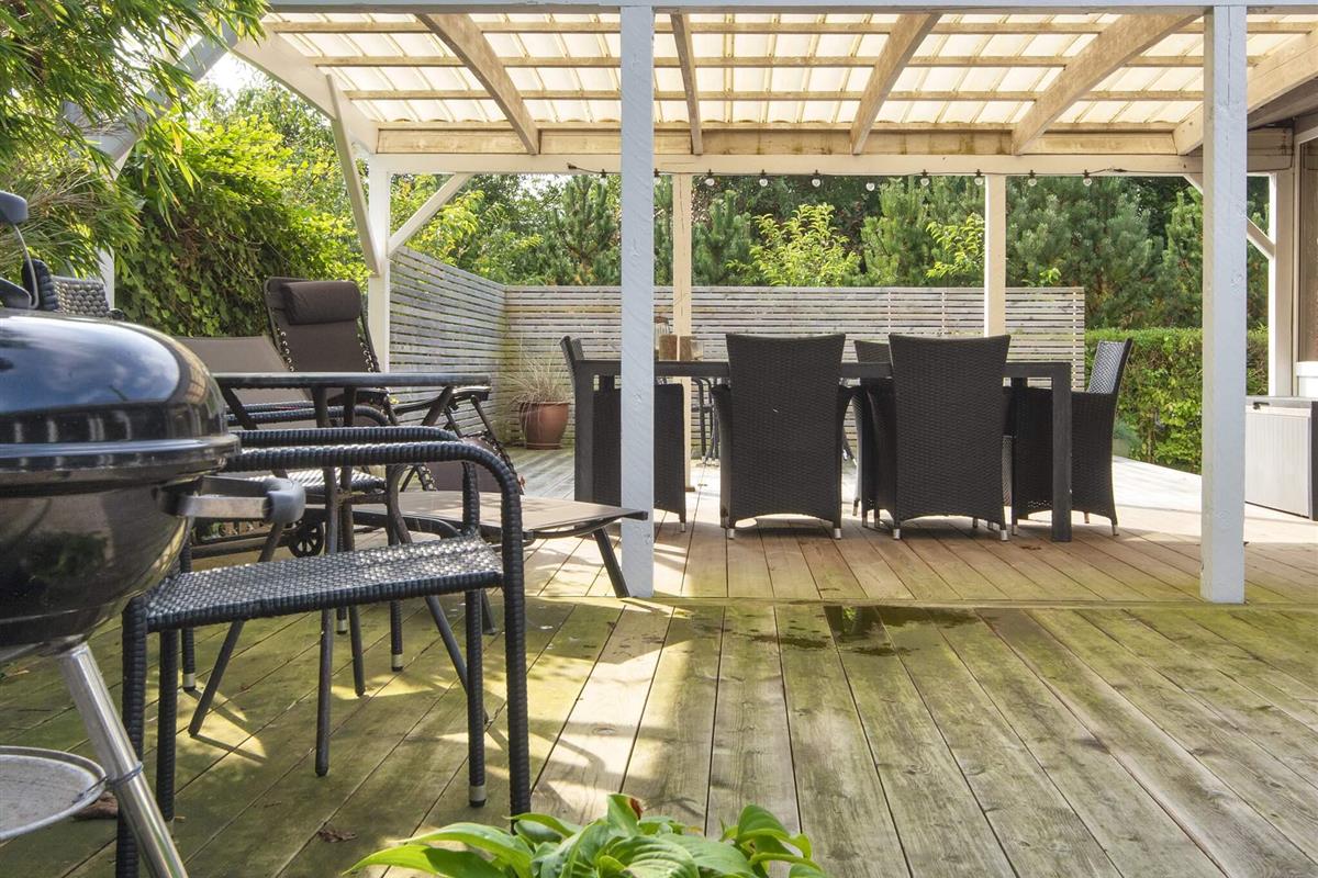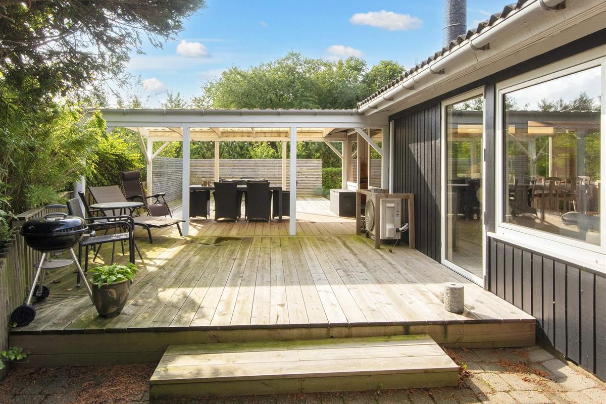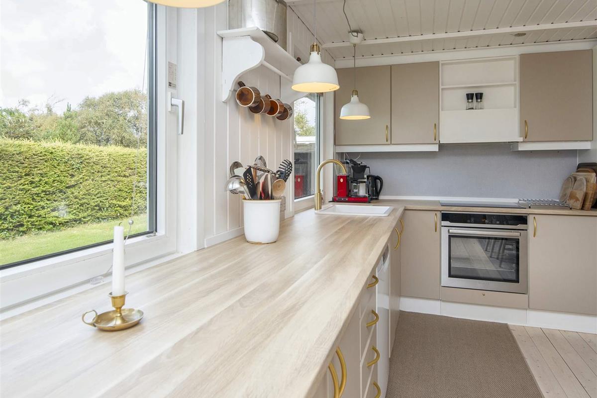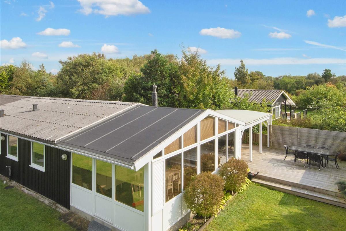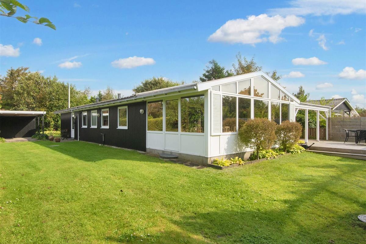Gemütliches Ferienhaus nur 400 Meter vom Wasser entfernt, im alten und charmanten Teil von Skaven Strand. Das Haus verfügt über ein helles und einladendes Wohnzimmer mit offener Verbindung zur Küche und zum Essbereich, der um einen Holzofen herum angeordnet ist. Vom Wohnzimmer aus gelangt man in den hellen und luftigen Wintergarten, der direkt auf eine große, teilweise überdachte Holzterrasse mit Gartenmöbeln führt – ideal zum Entspannen oder Essen im Freien.