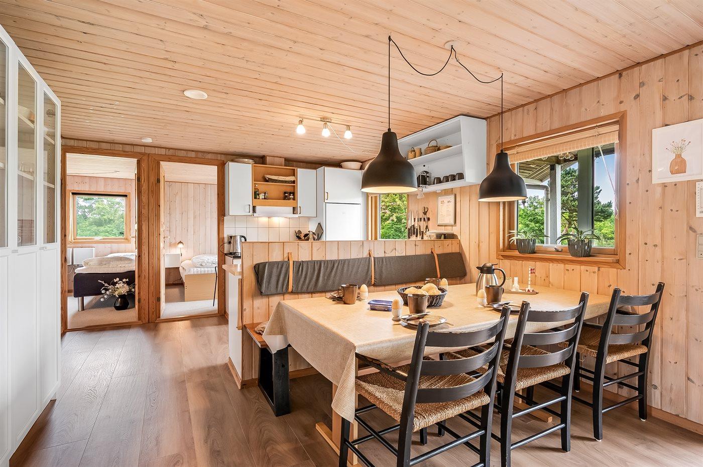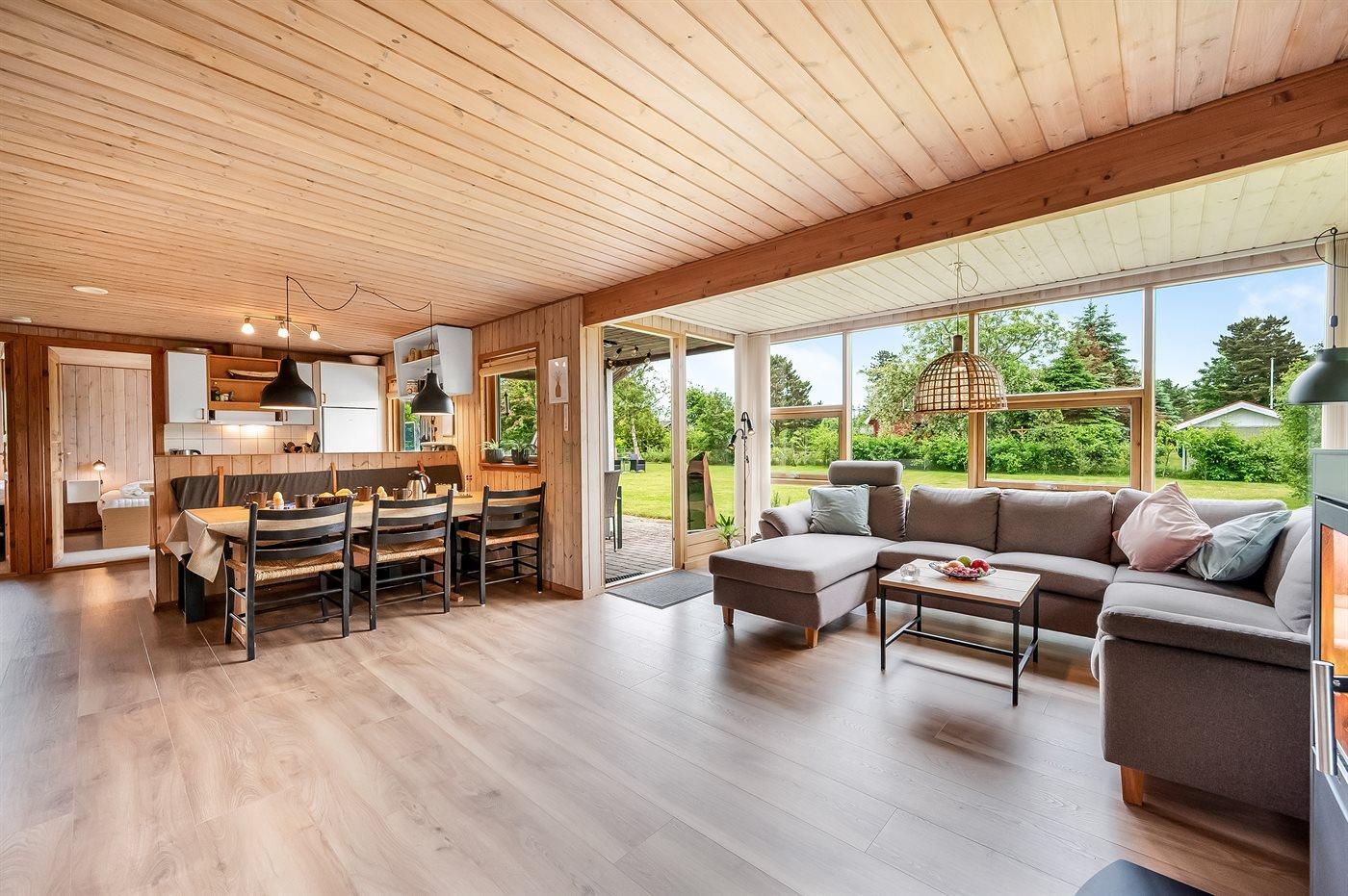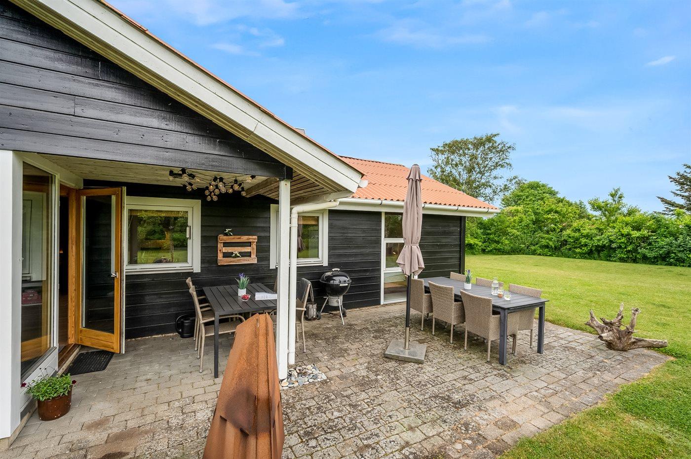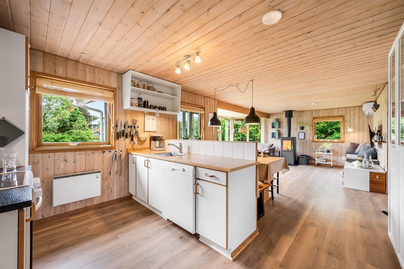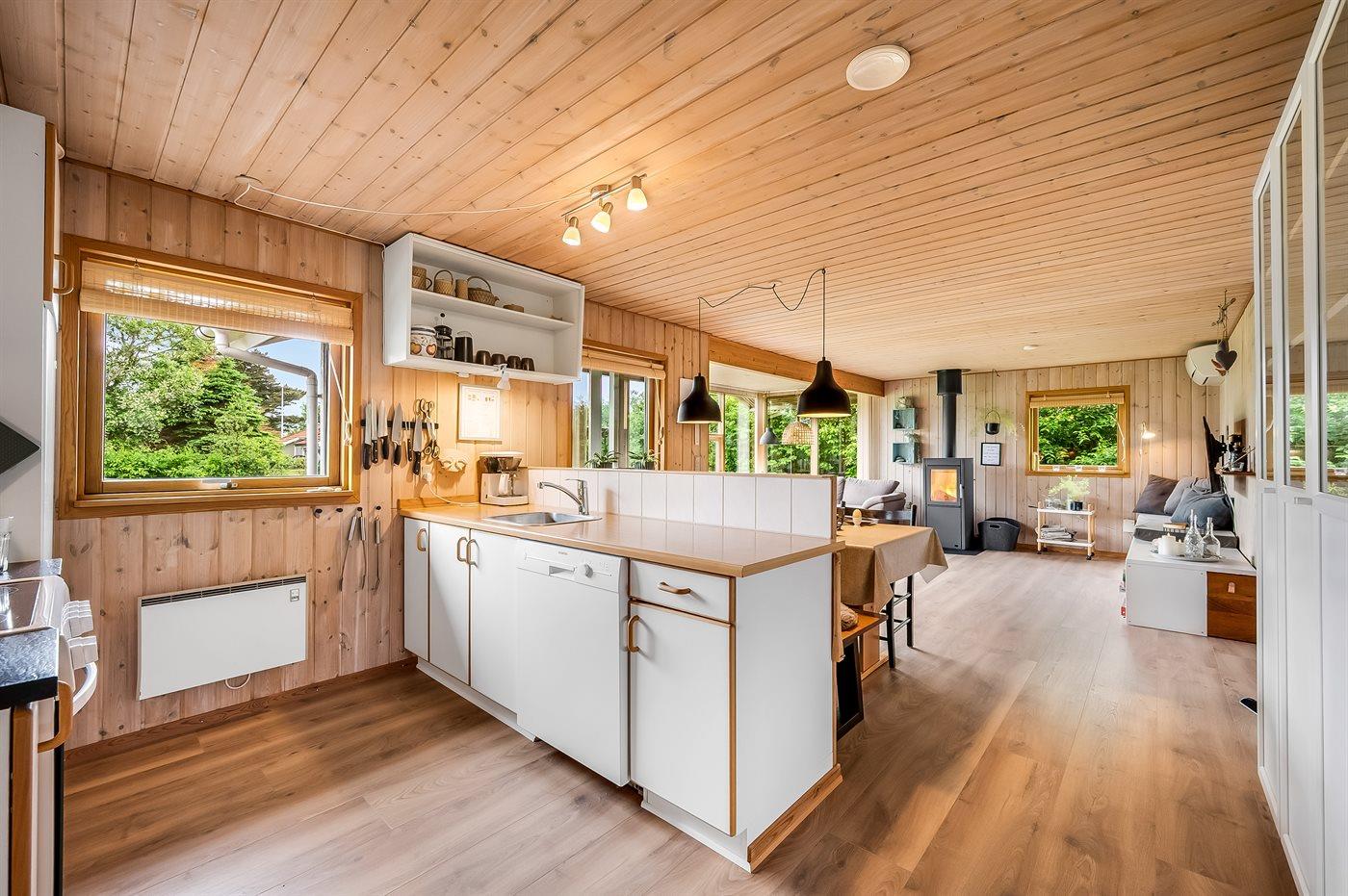De vakantiewoning is gelegen op een 1350 m² groot aangelegde tuin. De grond is omheind. Afstand tot de zee 13200 m. Afstand tot de fjord 400 m. Dichtstbijzijnde winkel 100 m. Bij de vakantiewoning hoort terras. Daarnaast is er een overdekt terras. Voetbaldoel.Vuurplaats. Op zwoele avonden zorgt de buitenhaard voor een gezellige sfeer. Parkeerplaats bij het huis.