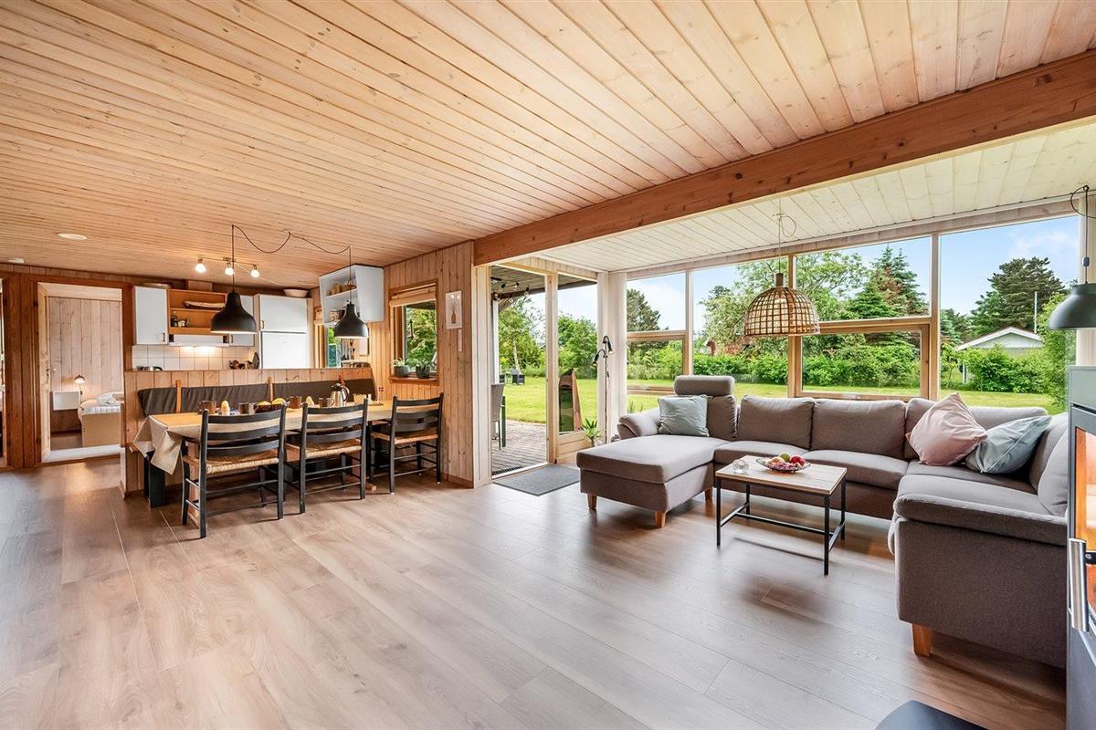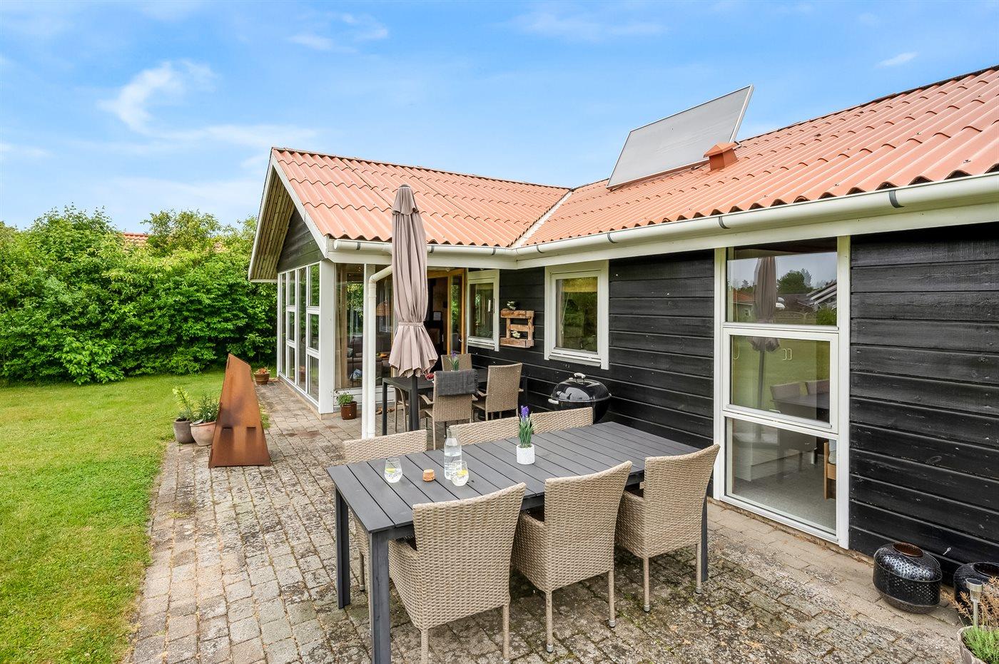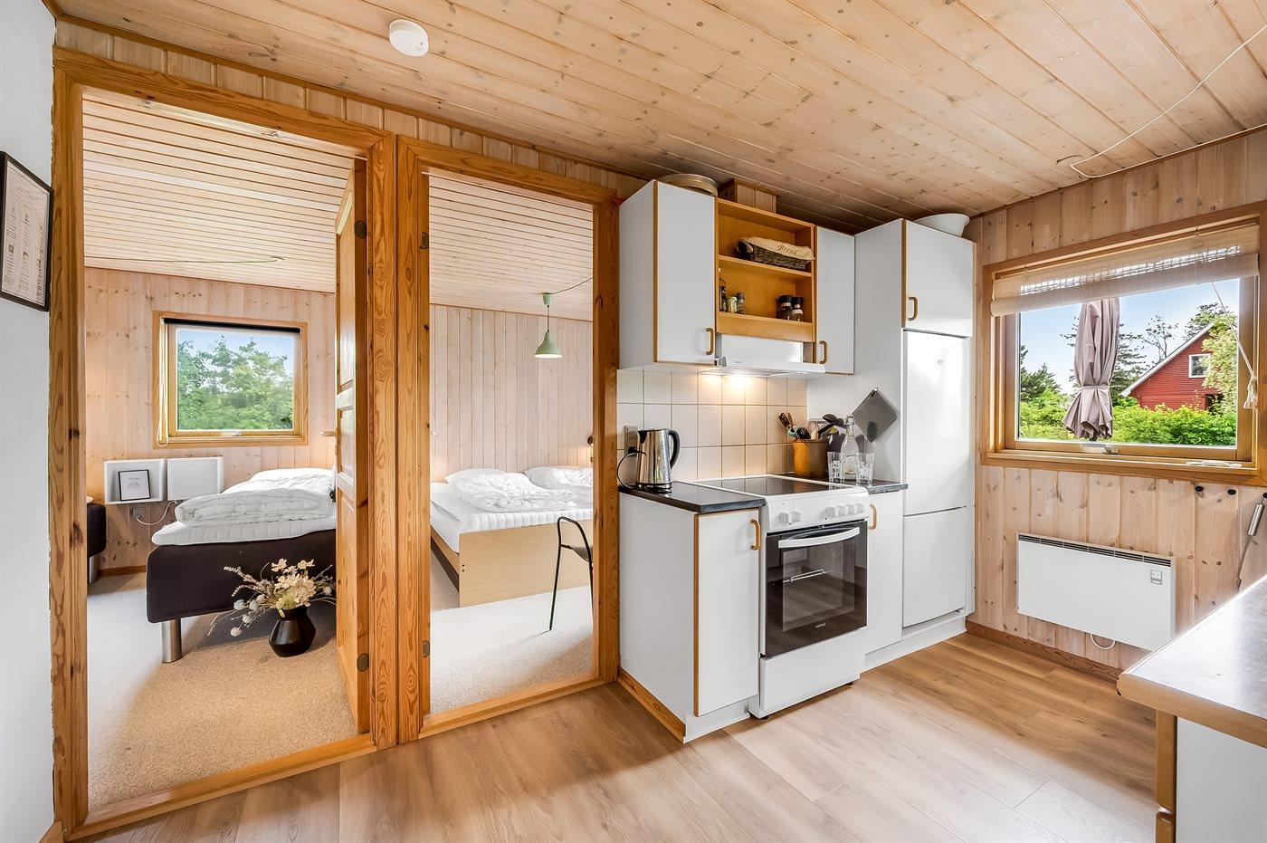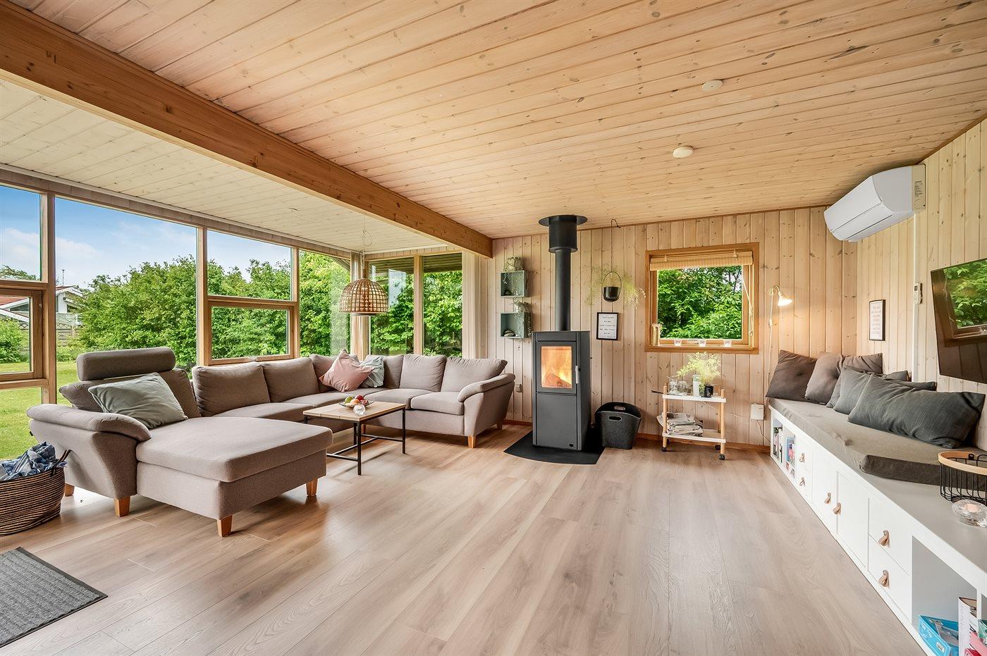 De vakantiewoning is gelegen op een 1350 m² groot aangelegde tuin. De grond is omheind. Afstand tot de zee 13200 m. Afstand tot de fjord 400 m. Dichtstbijzijnde winkel 100 m. Bij de vakantiewoning hoort terras. Daarnaast is er een overdekt terras. Voetbaldoel.Vuurplaats. Op zwoele avonden zorgt de buitenhaard voor een gezellige sfeer. Parkeerplaats bij het huis.