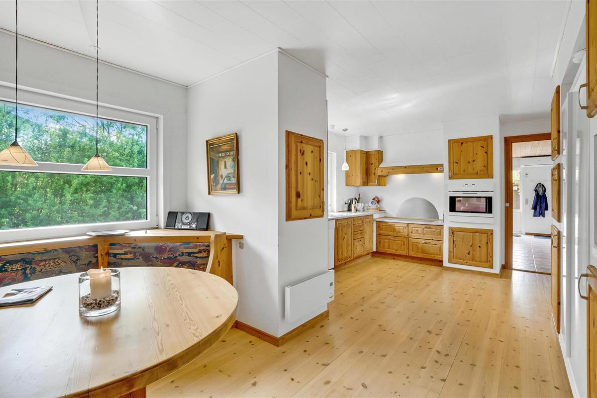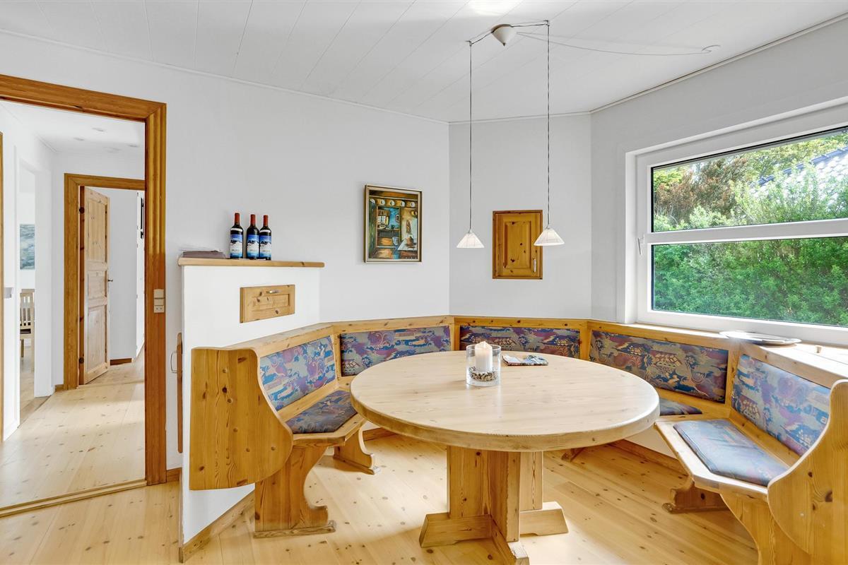 Maak het jezelf gemakkelijk in de grote woonkamer. De lichtovergoten woonkamer met houtkachel en tv biedt ruimte voor gezellige avonden, terwijl de lange eettafel ideaal is voor gezamenlijke maaltijden of spelletjes. De keuken is charmant ingericht in landhuisstijl. Begin de dag met een ontbijt in de gezellige eethoek bij het raam en geniet van het uitzicht op het groen.