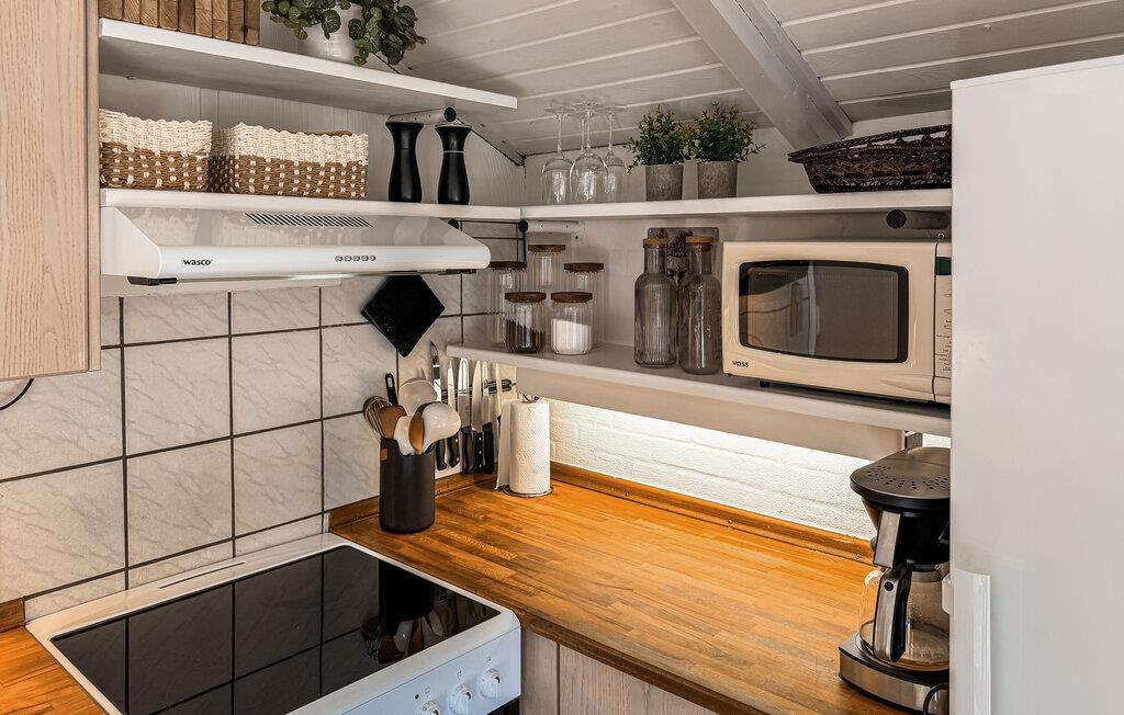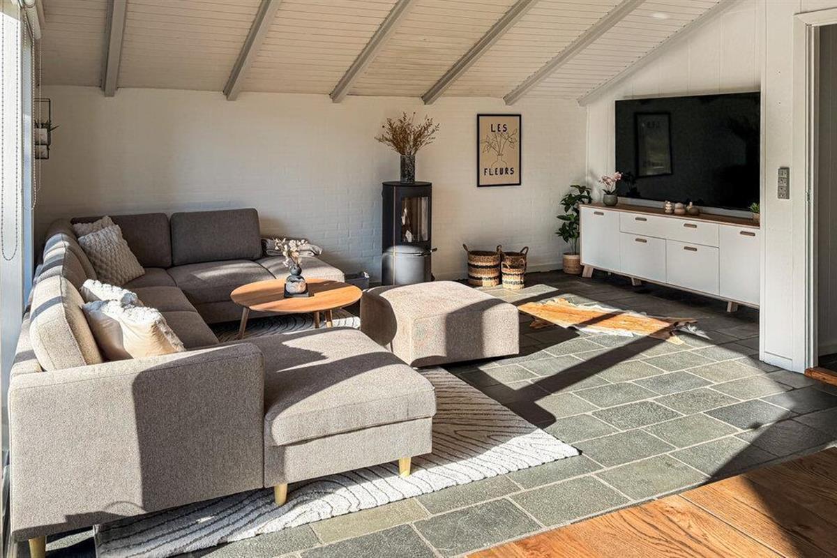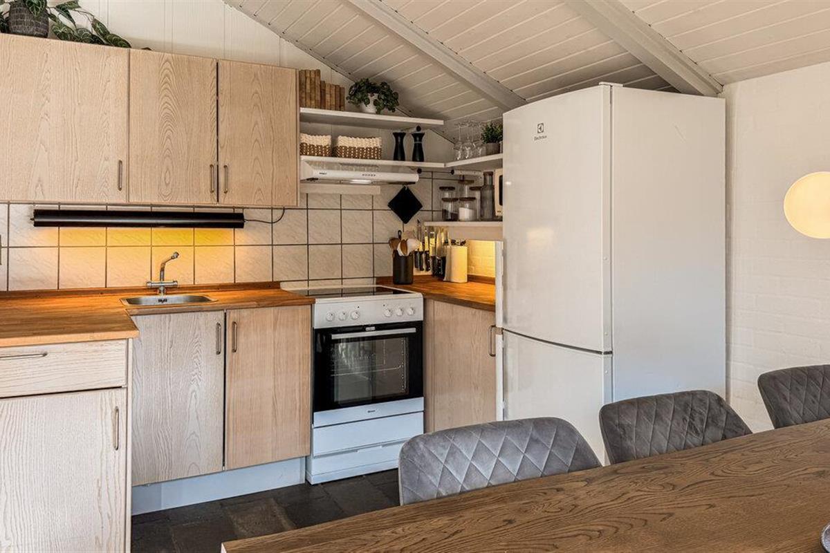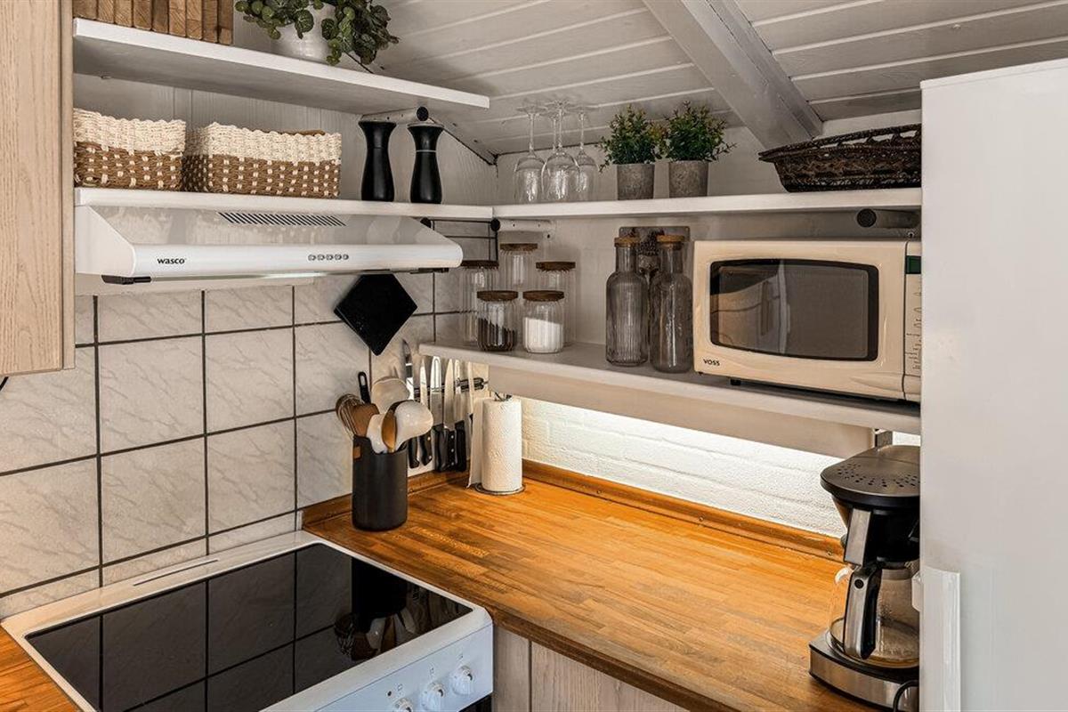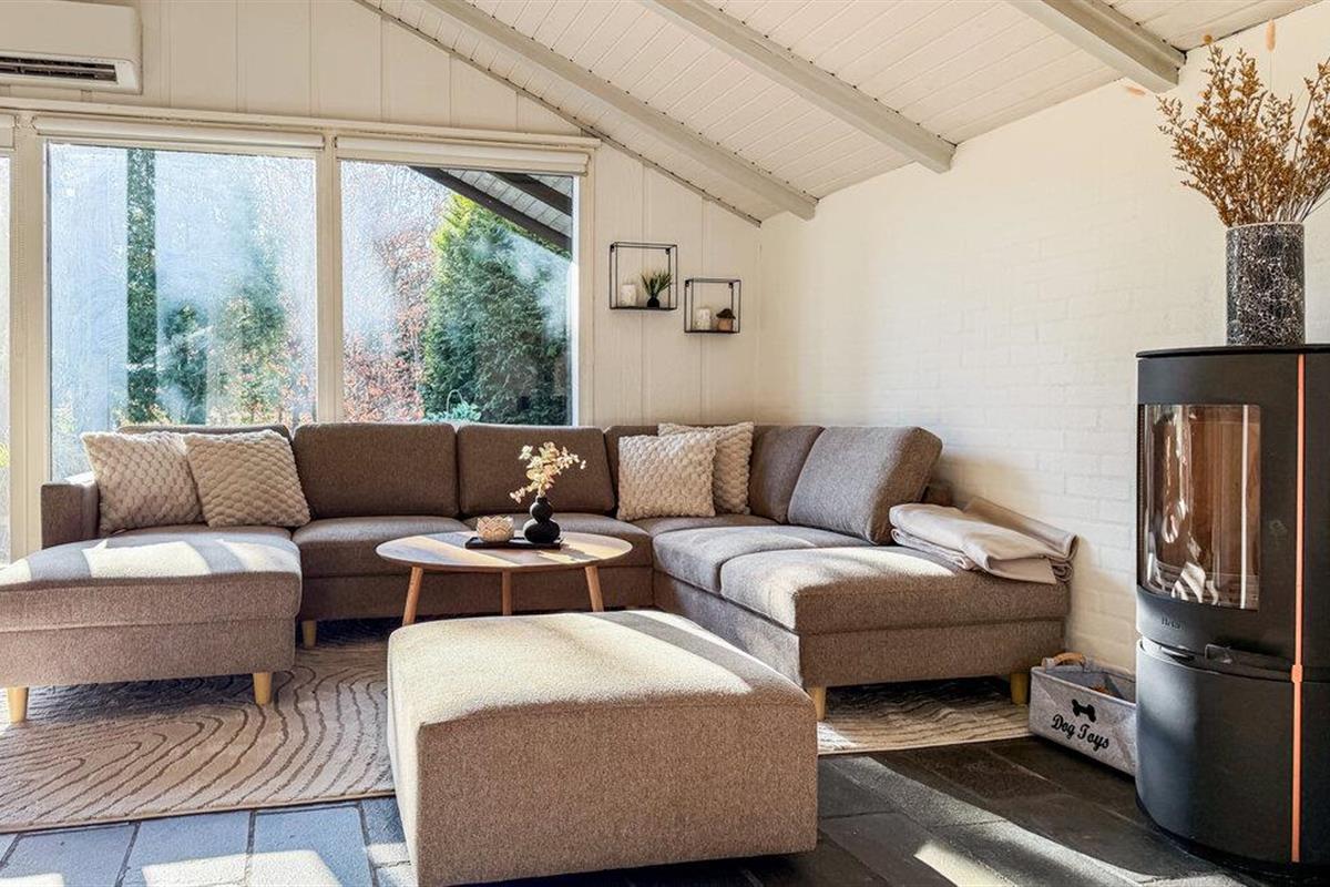 Geniet van een ontspannen vakantie in dit comfortabel ingerichte vakantiehuis, dat je de beste omstandigheden voor gezelligheid biedt. Kook samen in de open keuken, die naadloos overloopt in de eethoek. De grote eettafel is perfect voor lange maaltijden met familie of vrienden. De ramen van vloer tot plafond laten veel licht binnen en bieden uitzicht op het groene landgoed. Sluit de avond af in de gezellige zithoek.