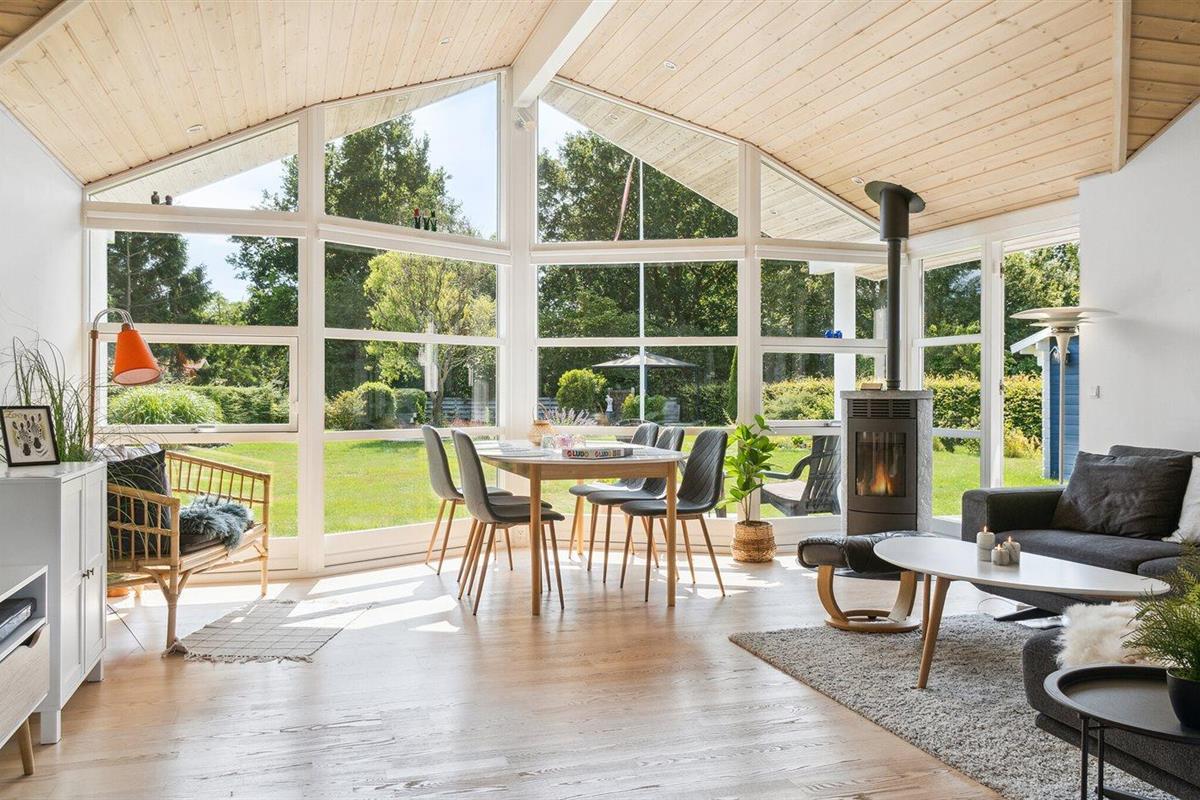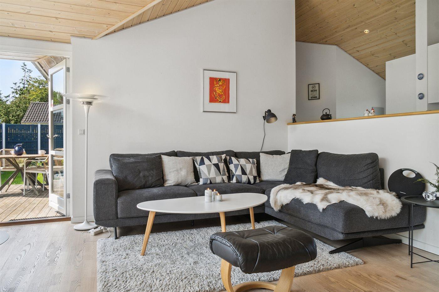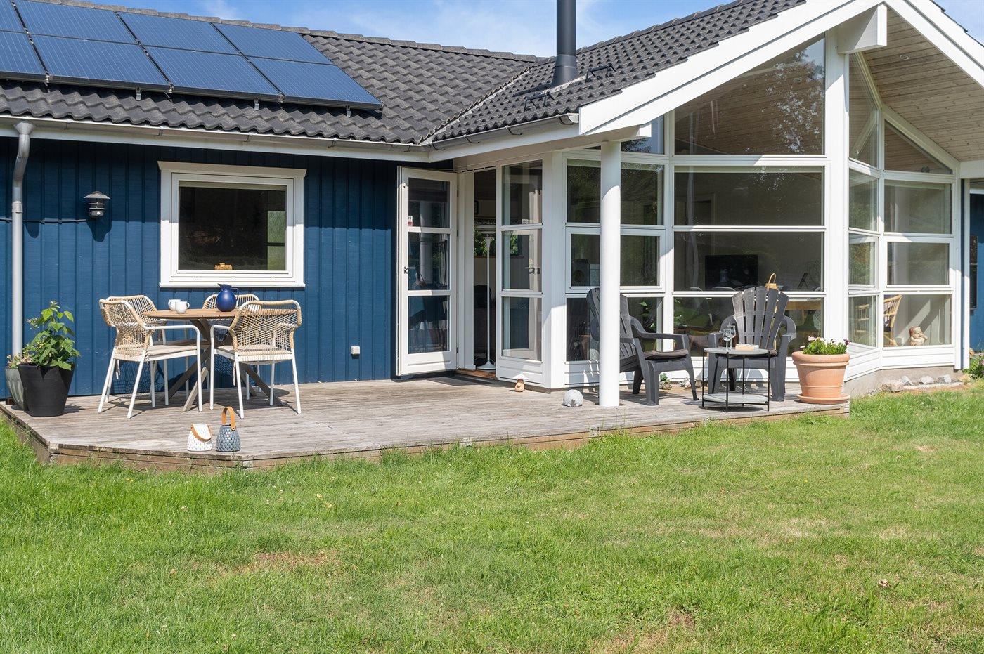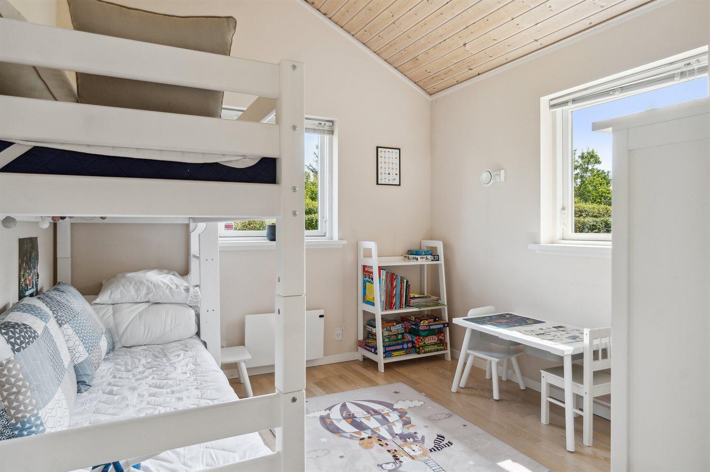 De vakantiewoning is gelegen op een 1200 m² groot natuural grond. Afstand tot de fjord 200 m. Dichtstbijzijnde winkel 3000 m. Bij de vakantiewoning hoort terras. Gereedschapsruimte. Zandbak. Trampoline.Vuurplaats. Barbecue. Carport ter beschikking. Parkeerplaats bij het huis.