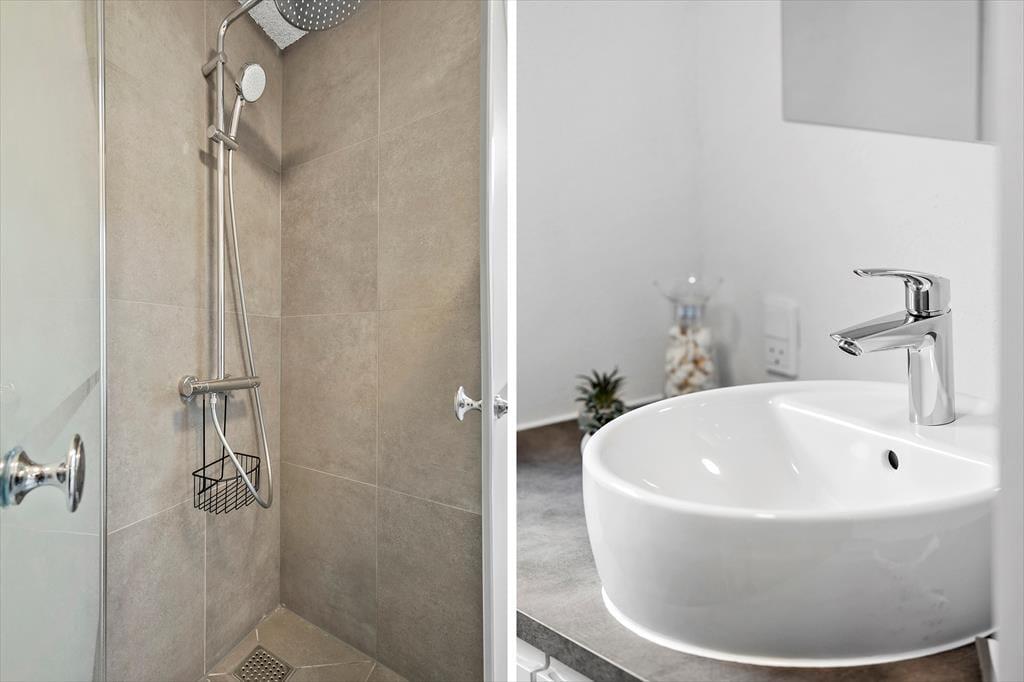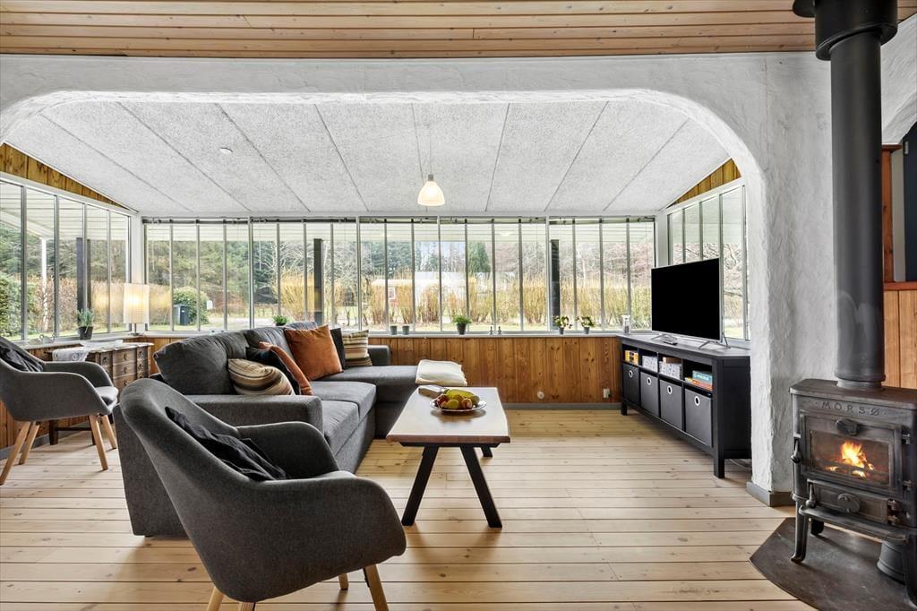 Die 80 m² große Wohnfläche dieses Urlaubsdomizils beherbergt ohne weiteres bis zu sechs übernachtende Urlaubsgäste. Ihnen stehen zwei Schlafräume zur Verfügung. Einer der Schlafräume ist mit einem Doppelbett ausgestattet, der andere mit zwei Einzelbetten und einem Etagenbett. Zusätzlich besteht die Möglichkeit, das Sofa im Wohnbereich in ein Schlafsofa zu verwandeln. Neben der komfortablen Polstergarnitur erwarten Sie im Wohnraum ein Essplatz und ein Kamin. Die Küche des Hauses ist ebenfalls offen in den Wohnbereich integriert. Der wunderbare Lichteinfall sorgt im Wohnbereich für ein wunderschönes Wohnambiente. Durch die nach Nordosten gerichteten Fenster blicken Sie bis auf den Fjord. Selbstverständlich beinhaltet dieses Objekt auch ein Badezimmer. Beachten Sie bitte, das Ihnen zusätzlich die Waschmaschine und der Wäschetrockner des Campingplatzes zur Verfügung stehen.