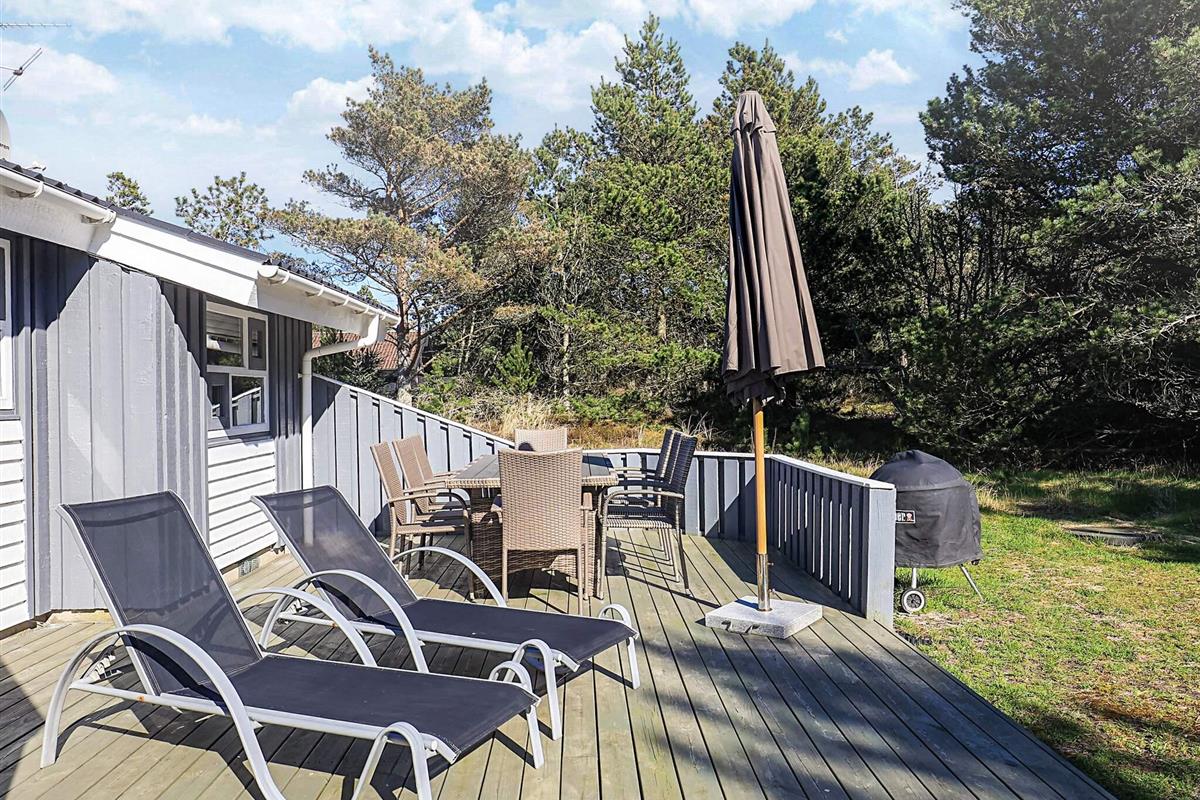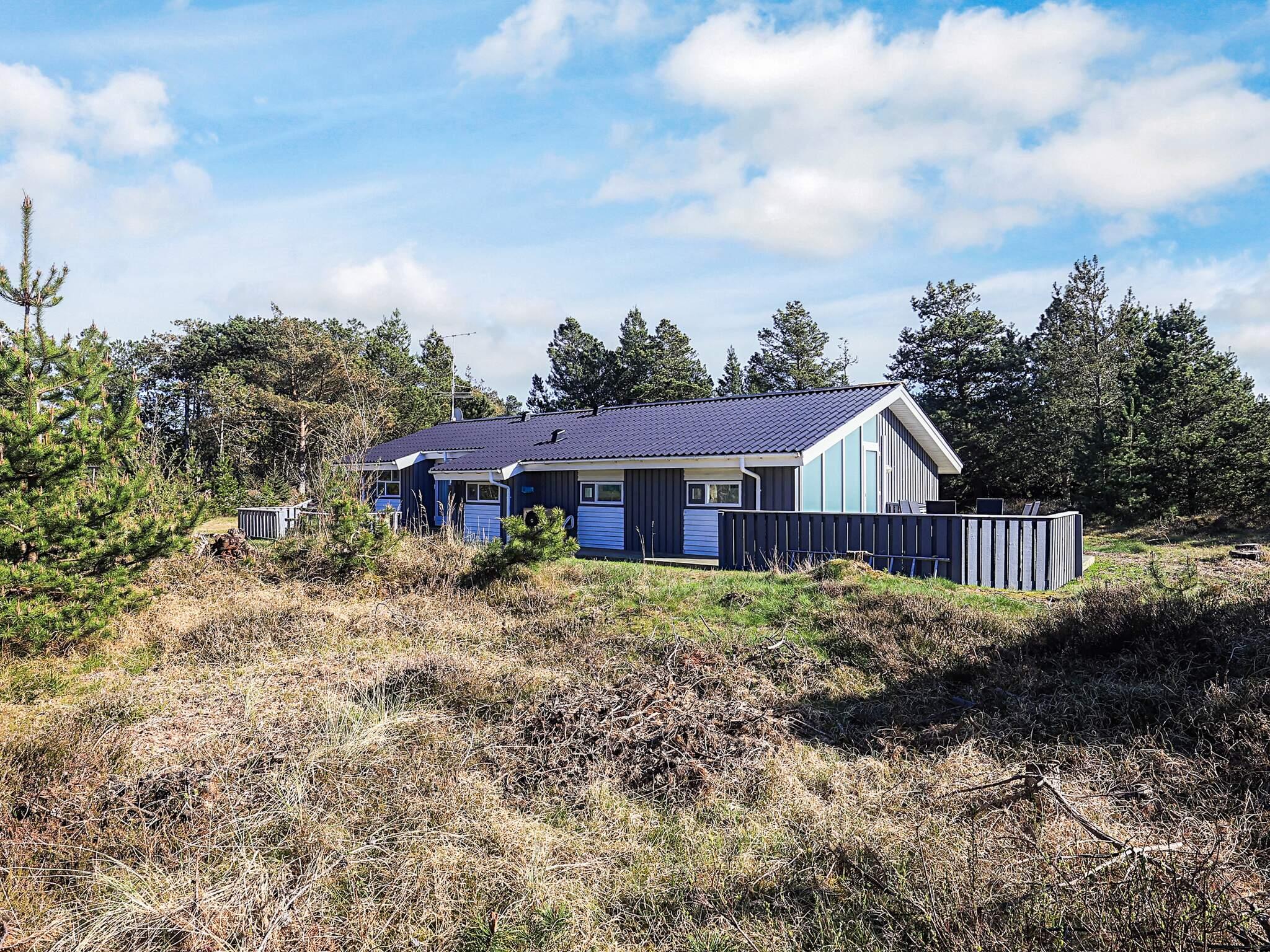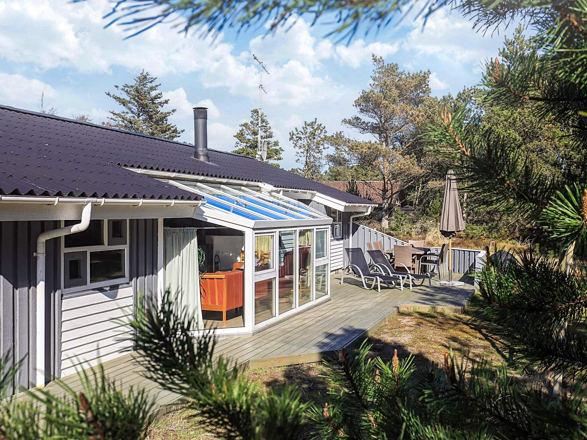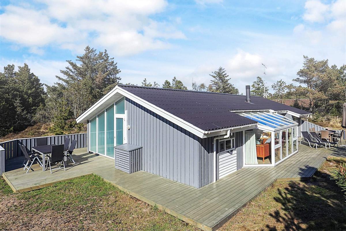 Auf einem großen, heidebewachsenen Dünengrundstück liegt dieses Ferienhaus mit Swimmingpool, ca. 500 m vom Skiveren Strand entfernt. Das Haus wird von großen Terrassen umgeben, von wo aus Sie herrlich das Wetter und die schöne Natur genießen können. Im Garten gibt es einen Sandkasten. In dem niederiger liegenden Aufenthaltsbereich können Sie es sich vor dem Holzofen mit einem guten Film gemütlich machen. Der Essbereich liegt in offener Verbindung mit der Küche, die praktisch eingerichtet und gut ausgestattet wurde. Es gibt zwei Bäder mit Dusche und einen separaten Bereich, wo sich der Pool befindet.