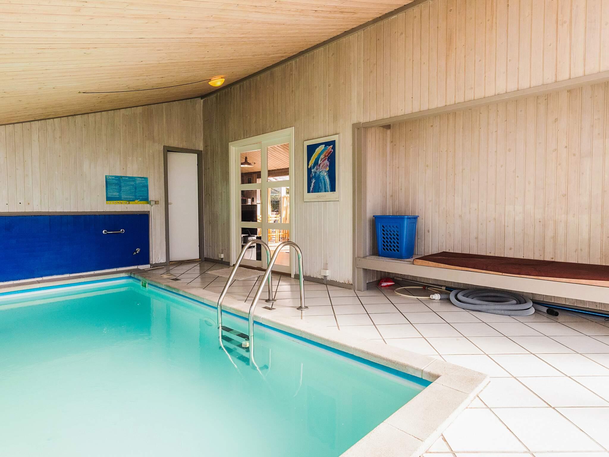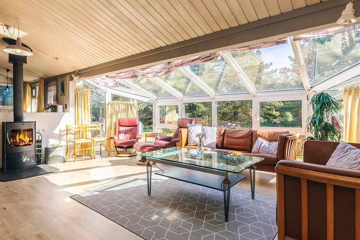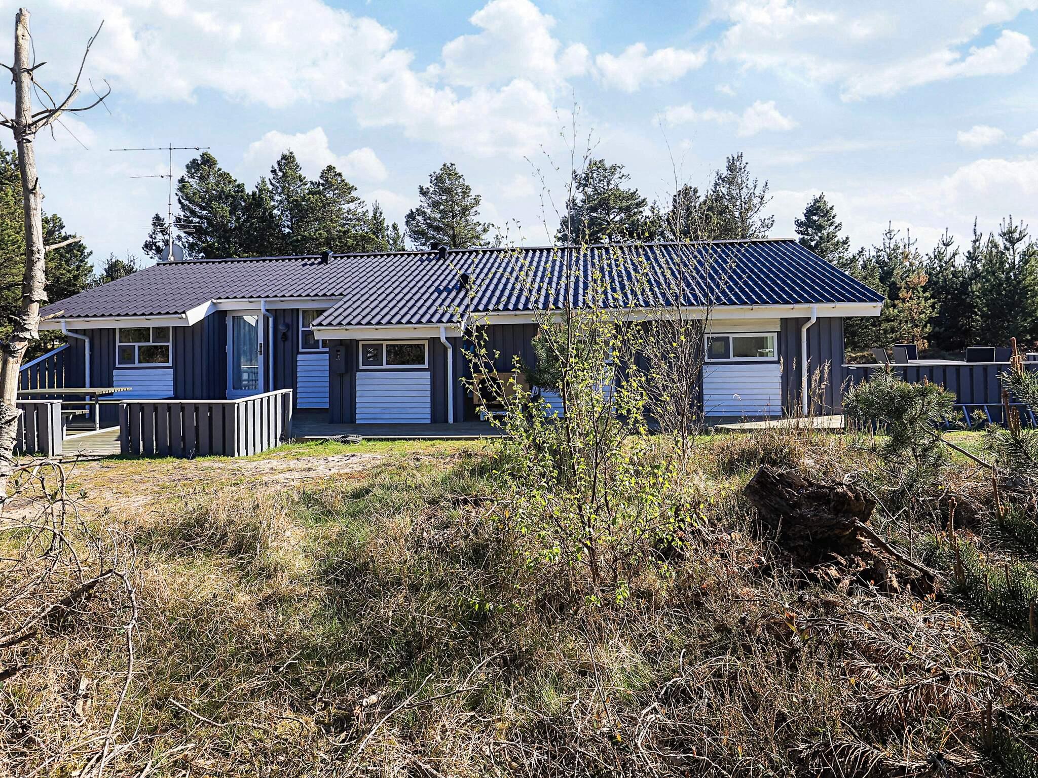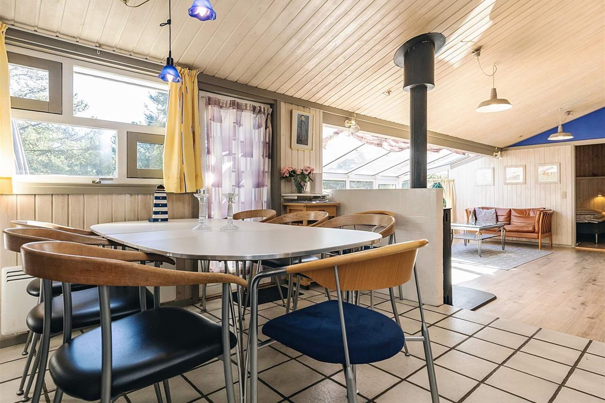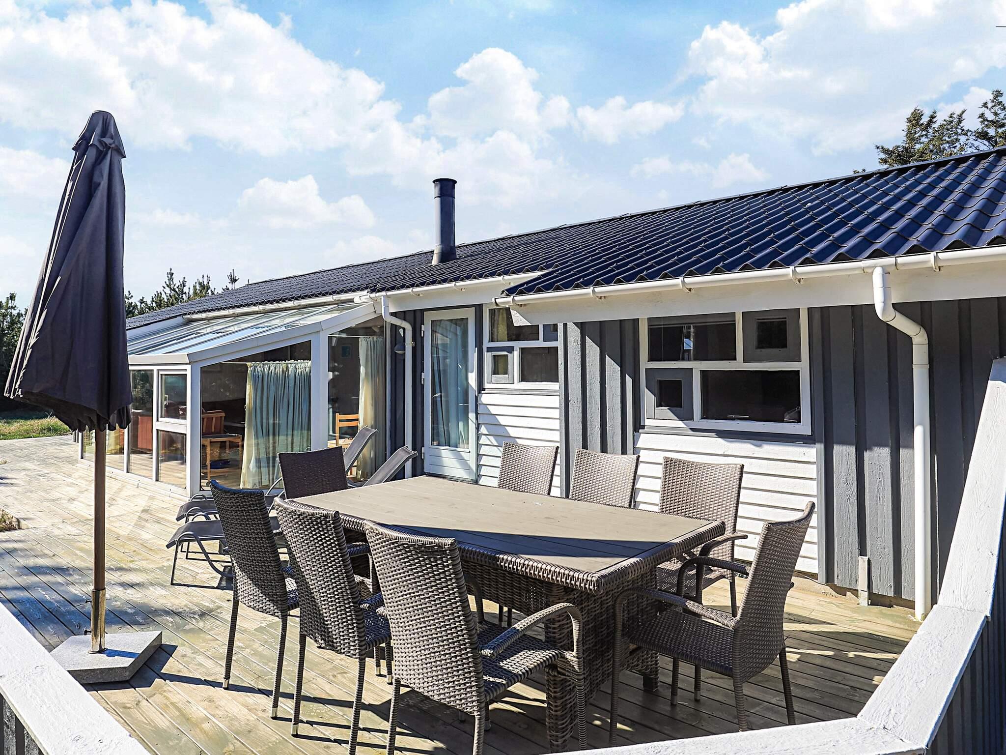 Auf einem großen, heidebewachsenen Dünengrundstück liegt dieses Ferienhaus mit Swimmingpool, ca. 500 m vom Skiveren Strand entfernt. Das Haus wird von großen Terrassen umgeben, von wo aus Sie herrlich das Wetter und die schöne Natur genießen können. Im Garten gibt es einen Sandkasten. In dem niederiger liegenden Aufenthaltsbereich können Sie es sich vor dem Holzofen mit einem guten Film gemütlich machen. Der Essbereich liegt in offener Verbindung mit der Küche, die praktisch eingerichtet und gut ausgestattet wurde. Es gibt zwei Bäder mit Dusche und einen separaten Bereich, wo sich der Pool befindet.