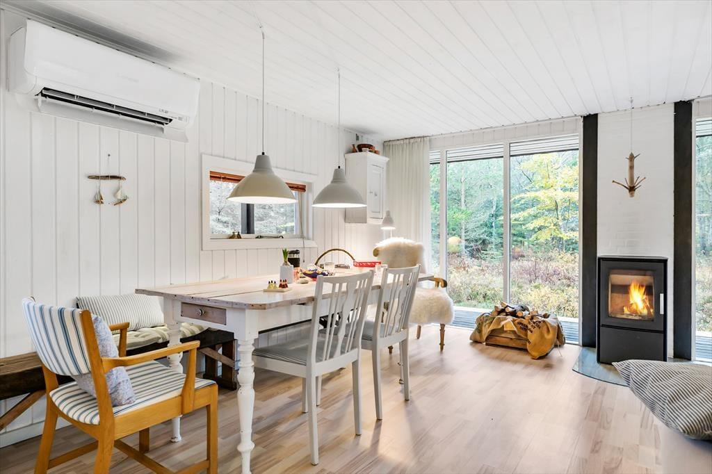 Im Inneren erwartet dich eine gemütliche Atmosphäre, in der die großen Fensterfronten den Raum öffnen und den Blick auf Heide und Wald direkt ins Haus holen. Die Einrichtung ist hell und freundlich, sodass es leichtfällt, sich wohlzufühlen – egal, ob du an einem sonnigen Sommertag oder an einem kühlen Herbstabend ankommst. Im Wohnzimmer sorgt der Kaminofen für wohlige Wärme und knisternde Gemütlichkeit, wenn draußen der Wind weht, während der Küchen- und Essbereich ein natürlicher Treffpunkt für die Mahlzeiten des Tages und kleine, gesellige Momente ist. Hier kannst du den Tag mit dem Duft von frisch gebrühtem Kaffee und dem sanften Morgenlicht über der Landschaft beginnen oder den Abend mit Spielen und Gesprächen ausklingen lassen, während das Feuer im Kamin eine behagliche Stimmung verbreitet.