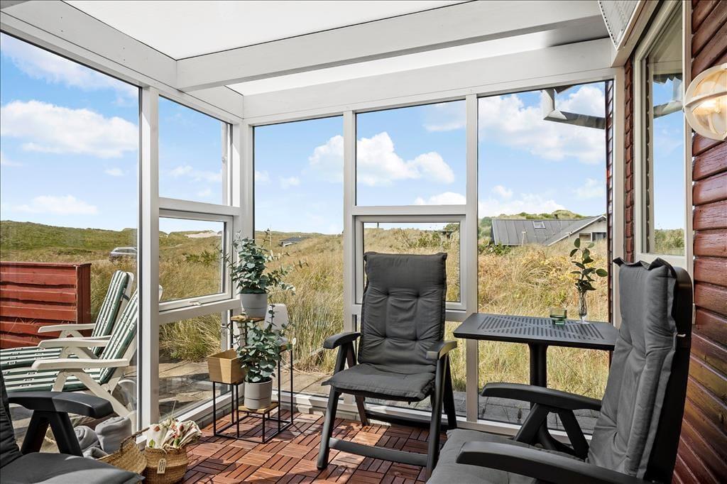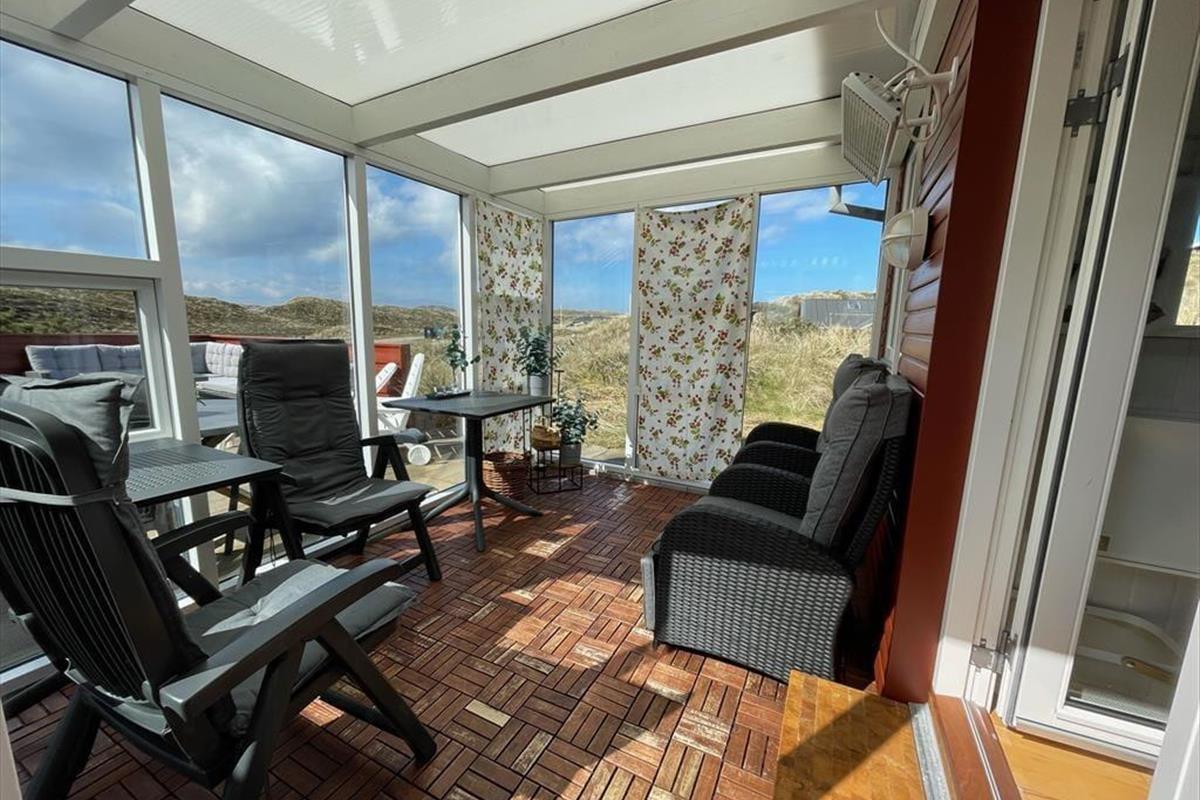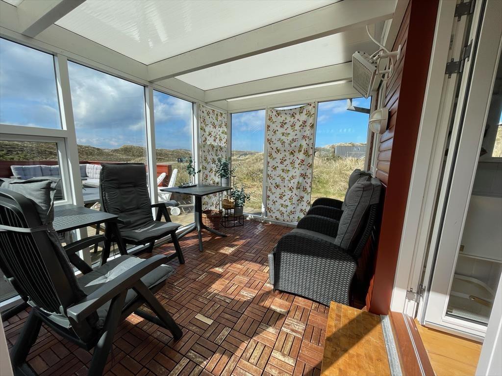 Das klassische Holzferienhaus verzaubert mit echtem, ganz authentischem Ferienhauscharme, der über Jahrzehnte hinweg bei den Urlaubern in diesem Haus für schöne Urlaubstage und unvergessliche Erinnerungen gesorgt hat. Das über Eck gebaute Haus verfügt über einen Schlafbereich mit zwei Schlafzimmern und insgesamt vier Schlafplätzen. Aufgrund der nach Osten ausgerichteten Fenster werden Sie am Morgen von der aufgehenden Sonne geweckt. Dieser Teil des Hauses umfasst darüber hinaus ein kleineres, aber gut ausgestattetes Badezimmer mit Dusche und Fußbodenheizung. Die Küche und der Wohnraum bilden eine offene Einheit. In der gut ausgestatteten Küche wird die Zubereitung der Mahlzeiten zum reinen Vergnügen. Eine Waschmaschine steht in der Küche ebenfalls zur Verfügung. Die schrägen Decken und die offenliegenden Balken verleihen dem Wohnraum eine luftige, einladende Atmosphäre. Angenehme Temperaturen garantieren die Wärmepumpe und der gemütliche Kaminofen. Der Wohnraum umfasst einen Esstisch und Polstersitzmöbel. Für Unterhaltung und Abwechslung sorgt ein Fernseher mit Apple-TV und Parabolempfang. Große Fensterpartien gewähren einen reizvollen Ausblick auf die schöne Dünenlandschaft. Diesen Ausblick genießen Sie auch im komplett verglasten Wintergarten. Hier befindet sich eine Terrassenheizung, sodass Sie auch an einem kühlen Tag hier entspannen und bei einer Tasse Kaffee die Aussicht genießen können.