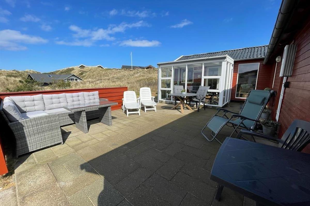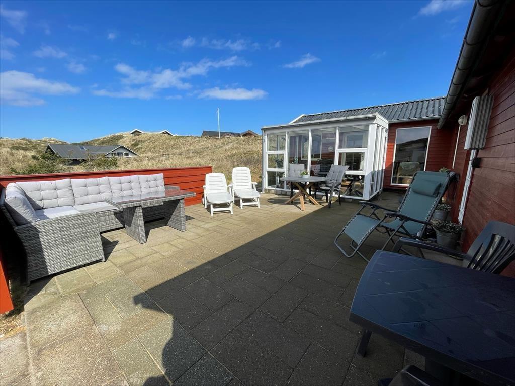 Frühaufsteher werden auf der Ostterrasse mit schönen Sonnenaufgängen über dem Ringkøbing Fjord belohnt. Das offene, gen Süden und Westen ausgerichtete Terrassenareal mit einem halbhohen Holzwindschutz verwöhnt im Tagesverlauf mit viel Sonne. Es bietet ausreichend Platz für Sonnenliegen, einen Gartentisch und den hauseigenen Grill. Auf dem Naturgrundstück können zwei Pkws abgestellt werden.