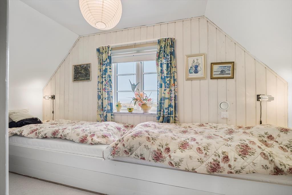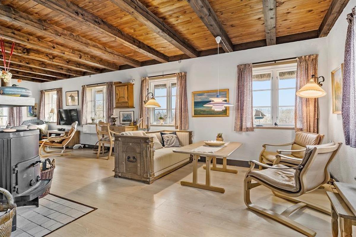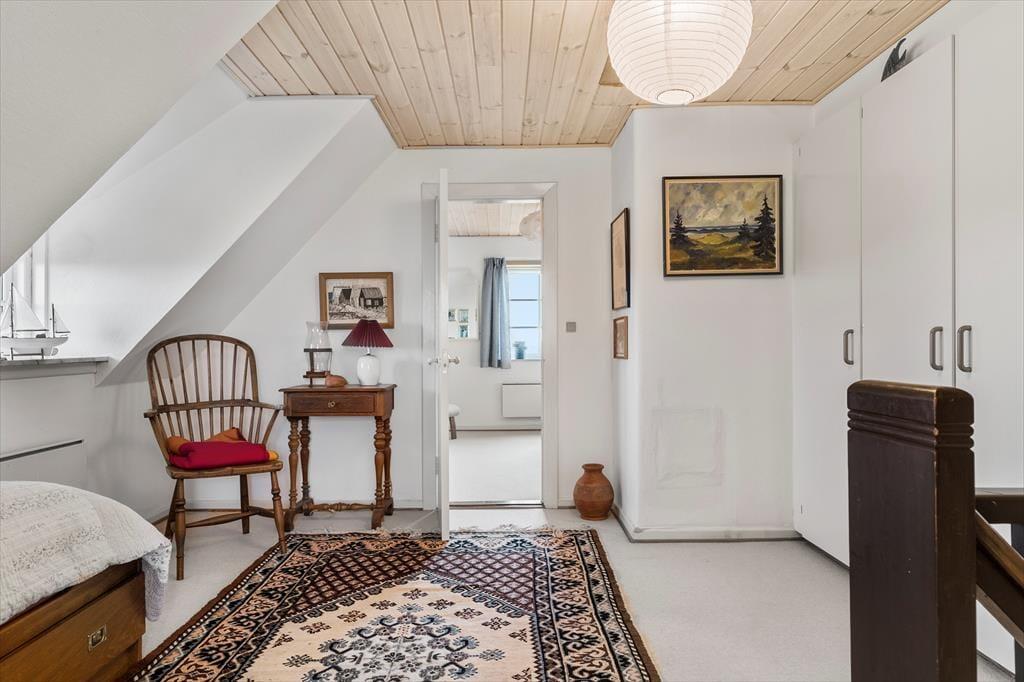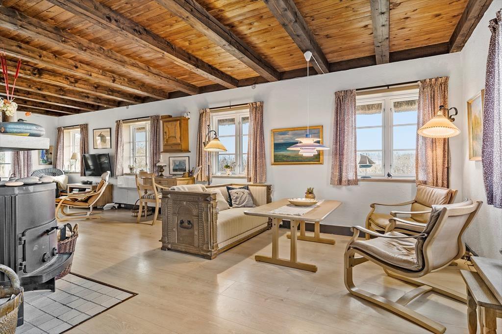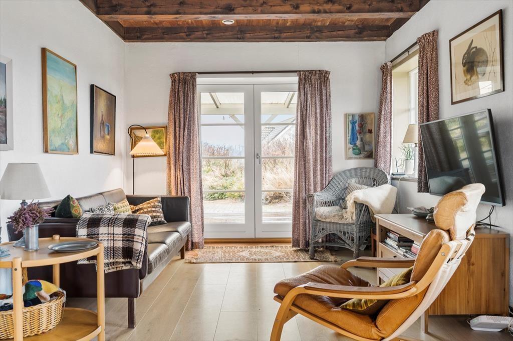 Dieses Ferienhaus ist der Inbegriff von Stimmung und Atmosphäre. Die Einrichtung zeugt von der maritimen Geschichte dieser Region und deren Verbindung zu Meer und Fjord. Die Außen- und Innentüren sowie weitere Teile des Innenraums stammen von der Fregatte Galathea, die 1950 von Kopenhagen aus zu einer Forschungsexpedition aufbrach, die unter anderem das Leben in den Tiefen der Ozeane kartieren sollte. Im Jahr 2018 wurde das Mietobjekt einer behutsamen Renovierung unterzogen. Hierbei wurde großer Wert darauf gelegt, die ursprüngliche Wohnatmosphäre zu bewahren. Das Erdgeschoss beinhaltet ein Badezimmer mit Duschnische, einen Eingangsbereich und einen großen, offenen Aufenthaltsbereich mit einer wunderschönen Holzdecke, einem Kaminofen und Aussicht auf den Fjord und die Dünen. Im Wohnraum stehen Ihnen ein Esstisch, ein Sofa beim Fernseher und eine zusätzliche Polstergarnitur beim Kaminofen zur Verfügung. Die Polstergarnitur setzt sich aus Lehnstühlen und einem Sofa zusammen. Die gut ausgestattete Küche umfasst einen Geschirrspüler. Im Obergeschoss begrüßen Sie zwei gute Schlafzimmer mit Schlafplätzen für insgesamt vier Personen. Das Obergeschoss glänzt mit einer exquisiten Aussicht.