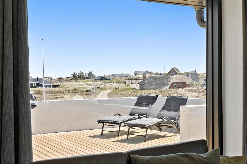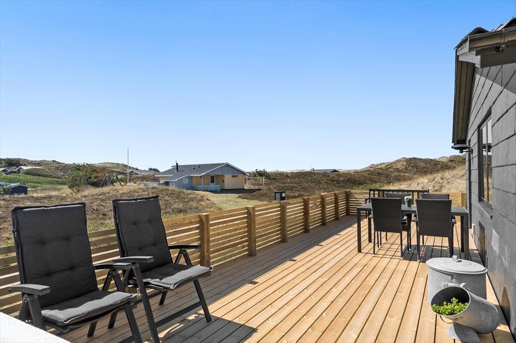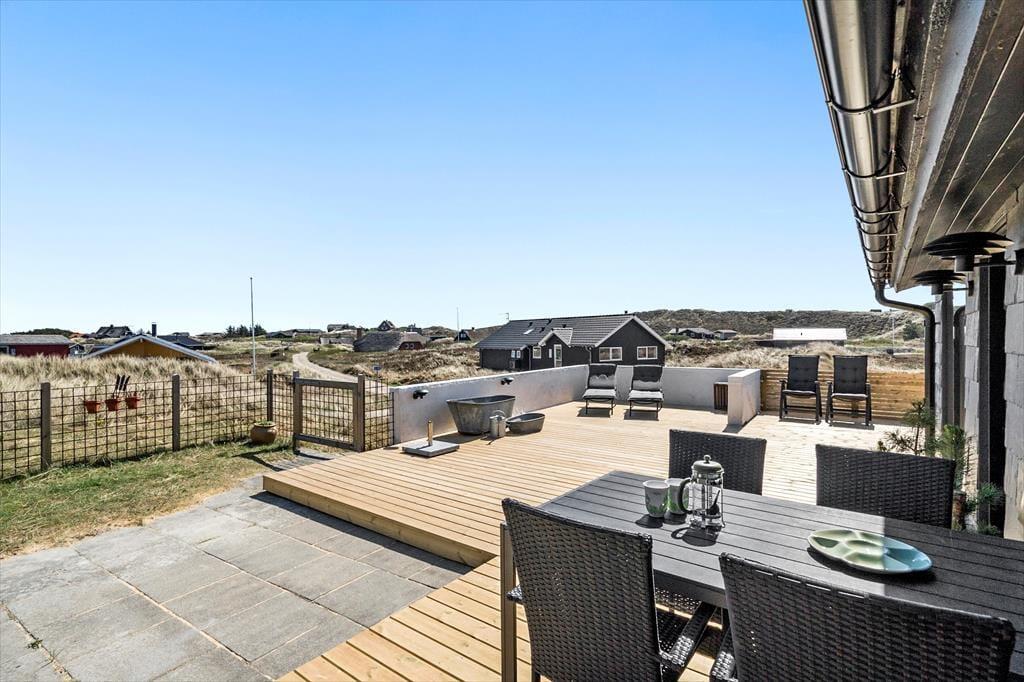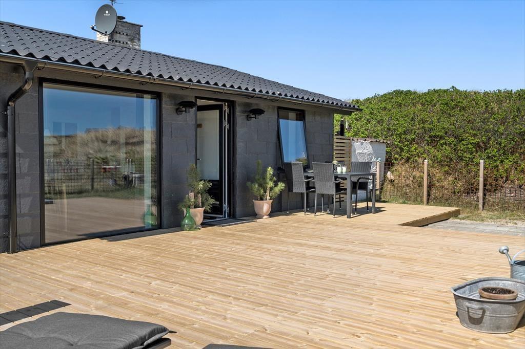 Das große Terrassenareal erstreckt sich rund um die Süd- und die Ostseite des Hauses. Von morgens bis abends verleben Sie hier herrliche Stunden in der Sonne. Sie genießen einen Ausblick auf die hügelige Dünenlandschaft, der Ihre gemeinsamen Frühstücke, Mittagessen und Grillabende wunderbar untermalt. Die Terrasse ist komplett umzäunt, sodass Sie Ihren Hund problemlos ohne Leine laufen lassen können. Unter der Terrasse befindet sich eine praktische Garage, die sich zum Abstellen Ihrer Fahrräder und zum Aufbewahren Ihrer Angel- oder Surfausrüstung eignet.