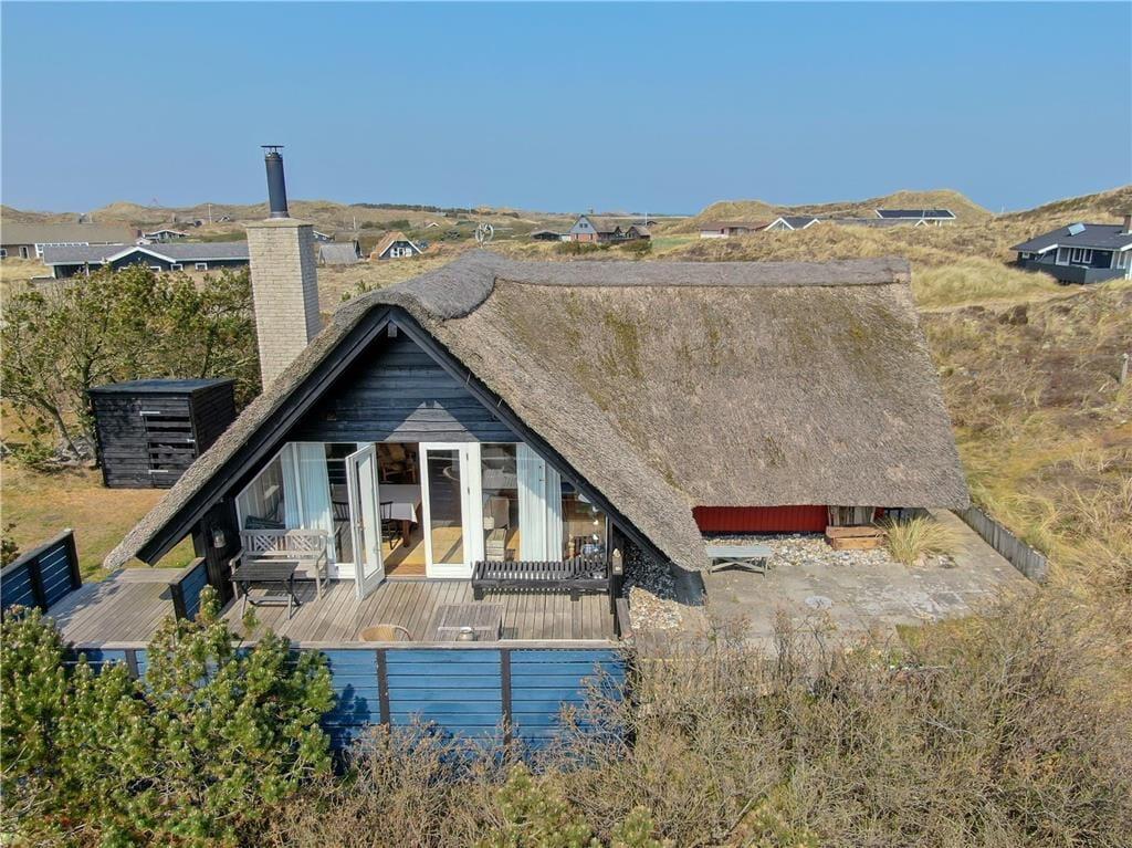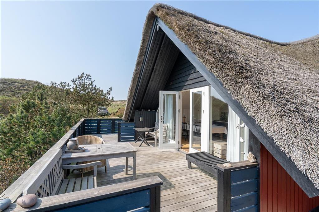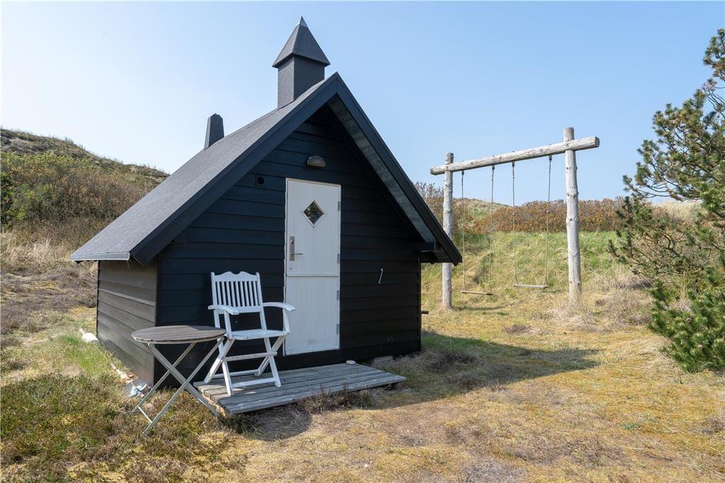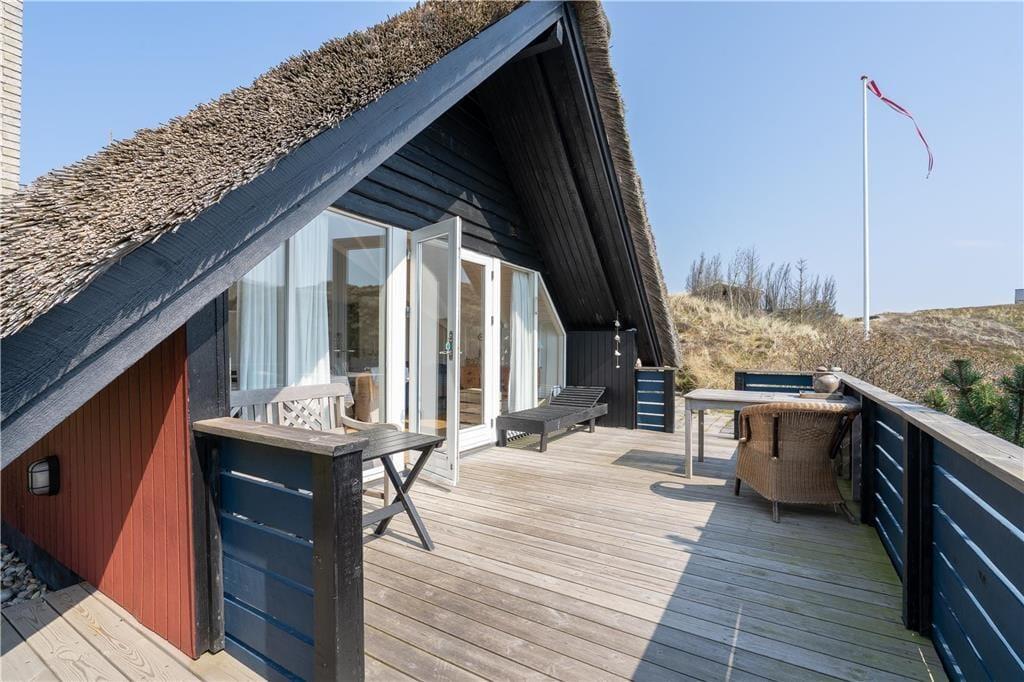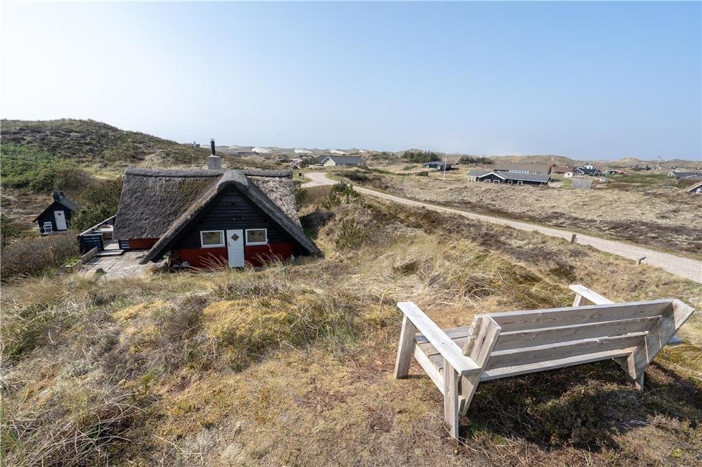 Ein großes, nach Süden gerichtetes Terrassenareal lädt zu entspannten Stunden auf dem Liegestuhl ein. Dank der Gartenmöbel werden Sie auf der Terrasse gerne und oft Ihre Mahlzeiten genießen. Das Haus ruht gut vor Wind geschützt in einer Senke zwischen mehreren Dünen. Auf dem Wipfel der nächstgelegenen Düne erwartet Sie eine Aussichtsbank, die mit einem schönen Blick über die Dünen in Richtung Ringkøbing Fjord verzaubert.