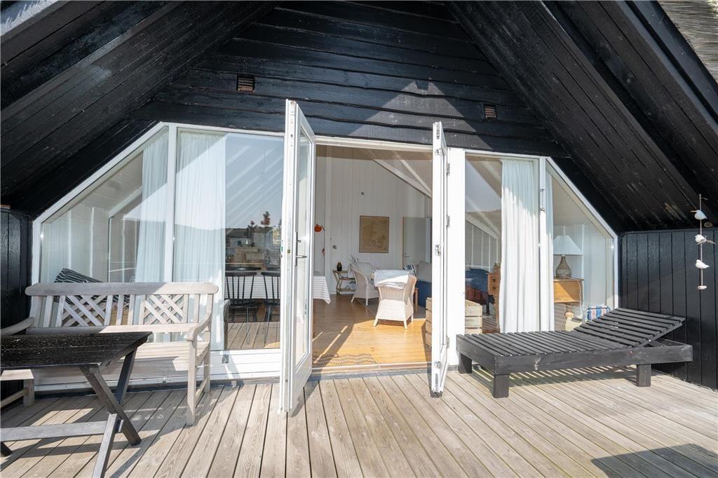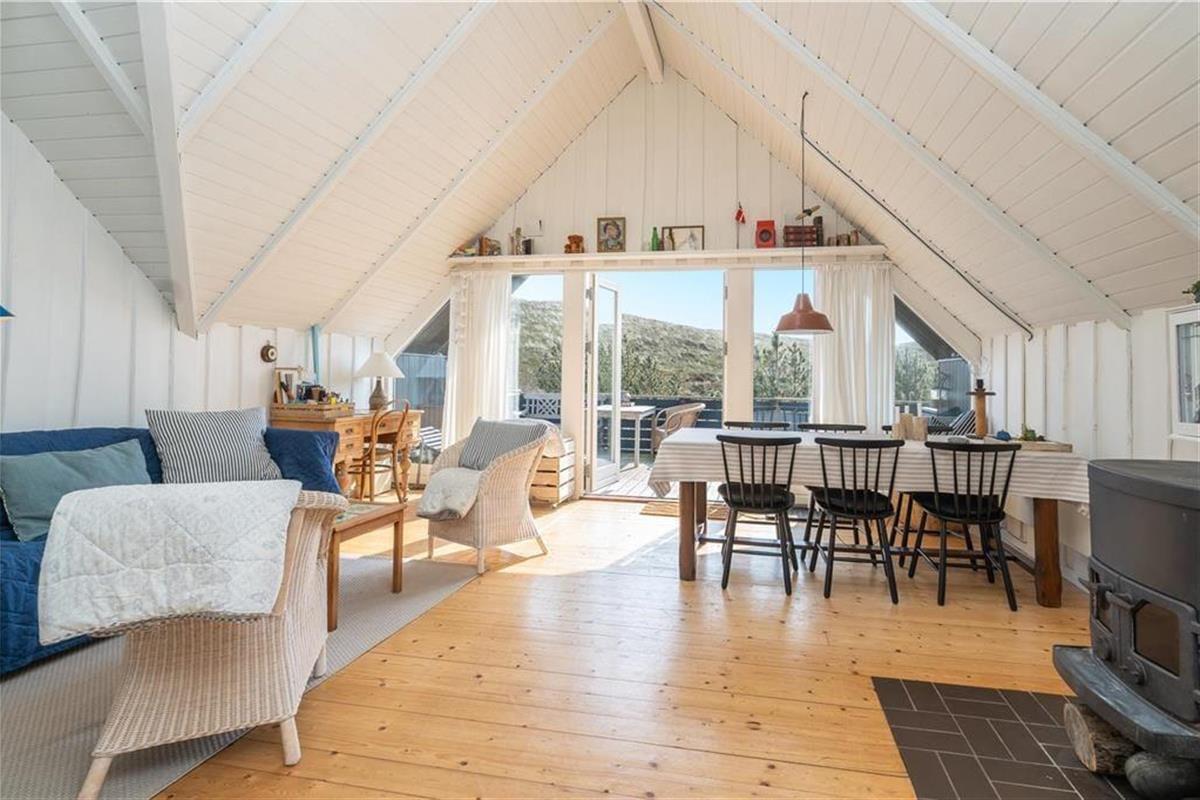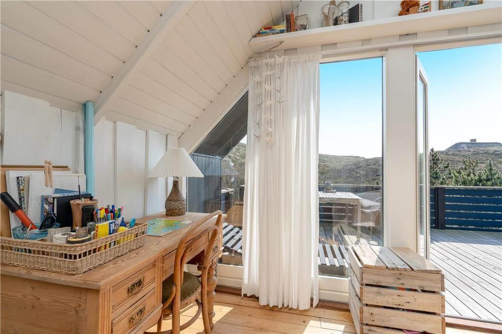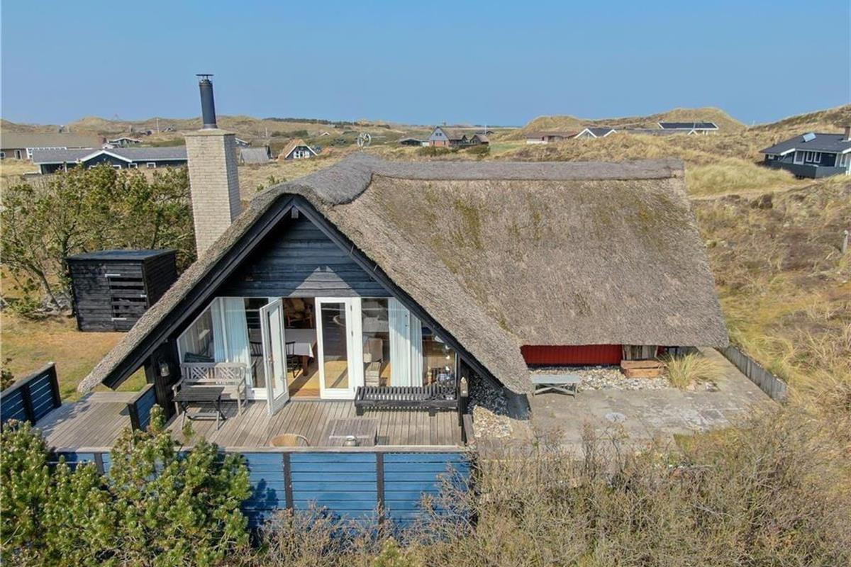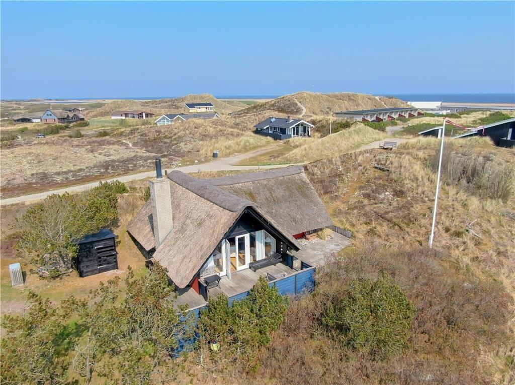 Ein großes, nach Süden gerichtetes Terrassenareal lädt zu entspannten Stunden auf dem Liegestuhl ein. Dank der Gartenmöbel werden Sie auf der Terrasse gerne und oft Ihre Mahlzeiten genießen. Das Haus ruht gut vor Wind geschützt in einer Senke zwischen mehreren Dünen. Auf dem Wipfel der nächstgelegenen Düne erwartet Sie eine Aussichtsbank, die mit einem schönen Blick über die Dünen in Richtung Ringkøbing Fjord verzaubert.