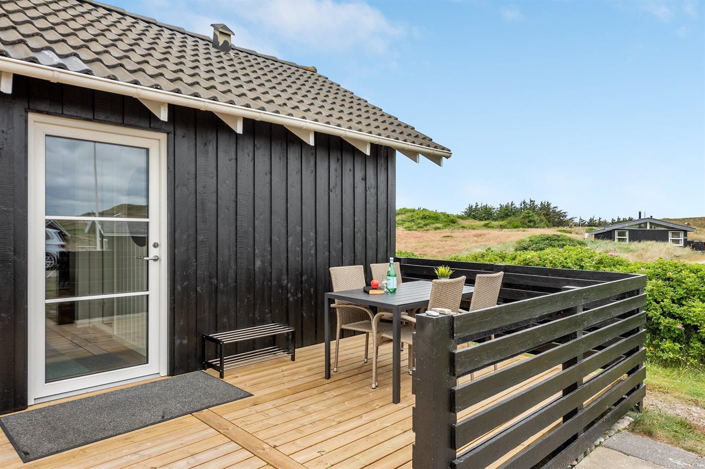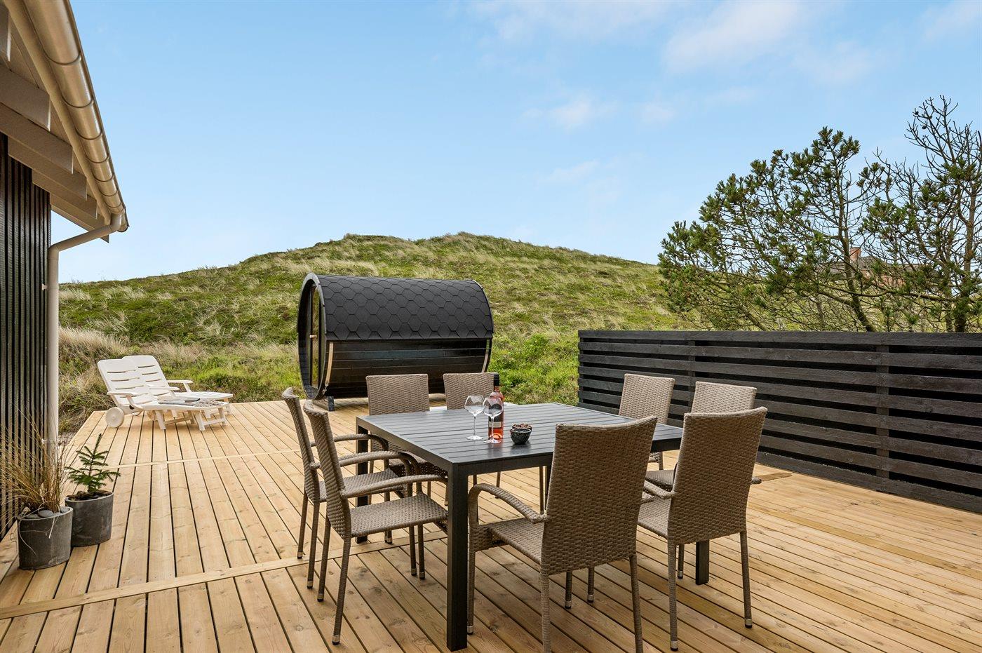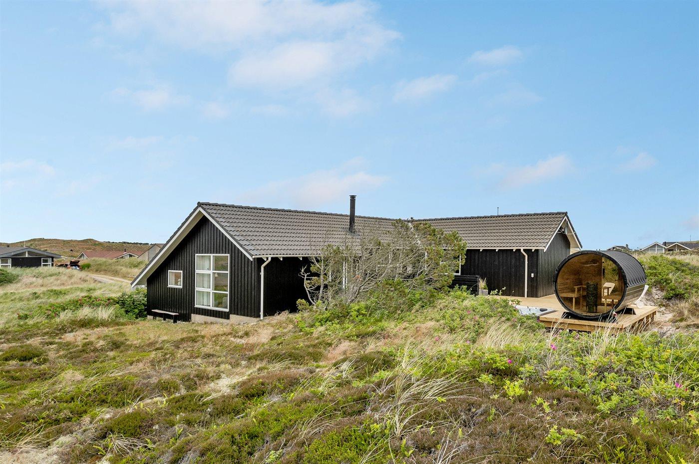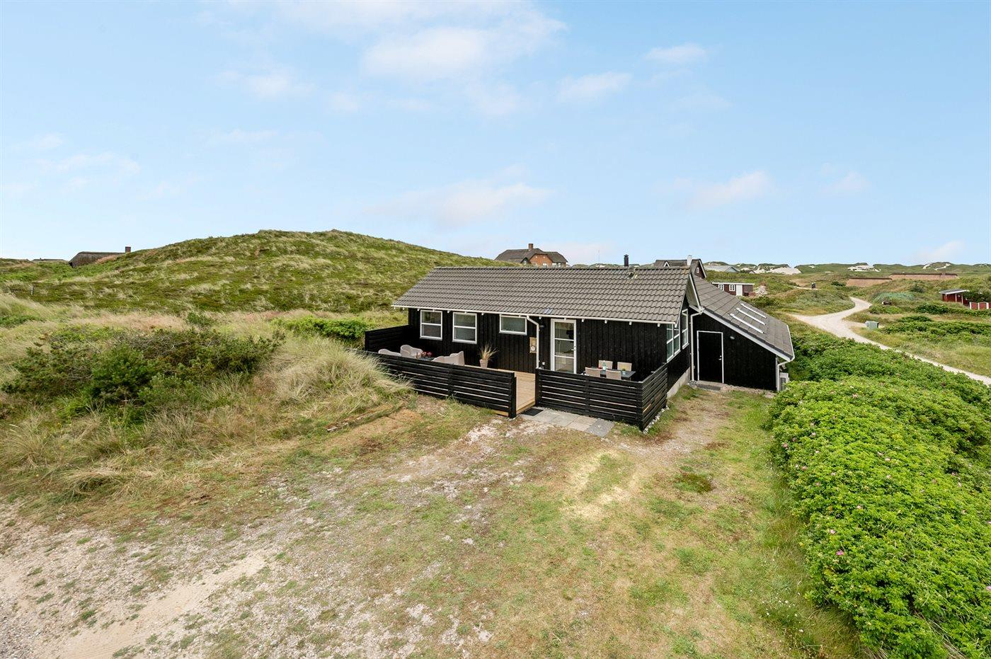 De vakantiewoning is gelegen op een 4185 m² groot Duingrond. Afstand tot de zee 400 m. Afstand tot de fjord 5000 m. Dichtstbijzijnde winkel 3800 m. Bij de vakantiewoning hoort 120 m² terras. Gereedschapsruimte. Afstand tot speelplaats 3800 m. Buitensauna. Parkeerplaats bij het huis.
