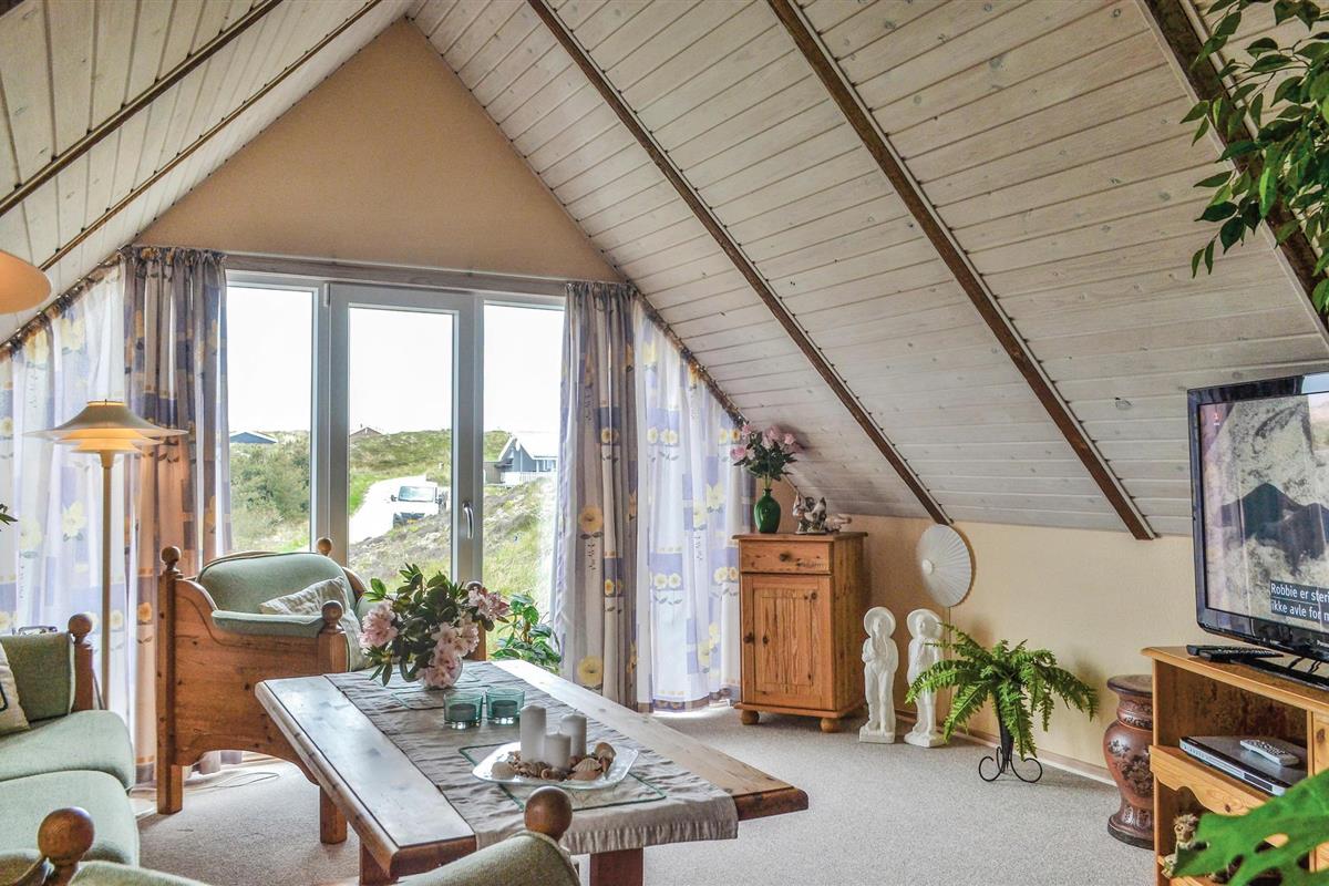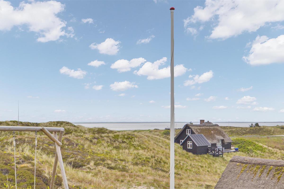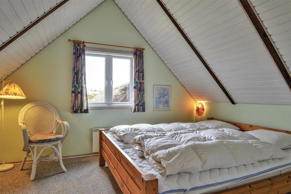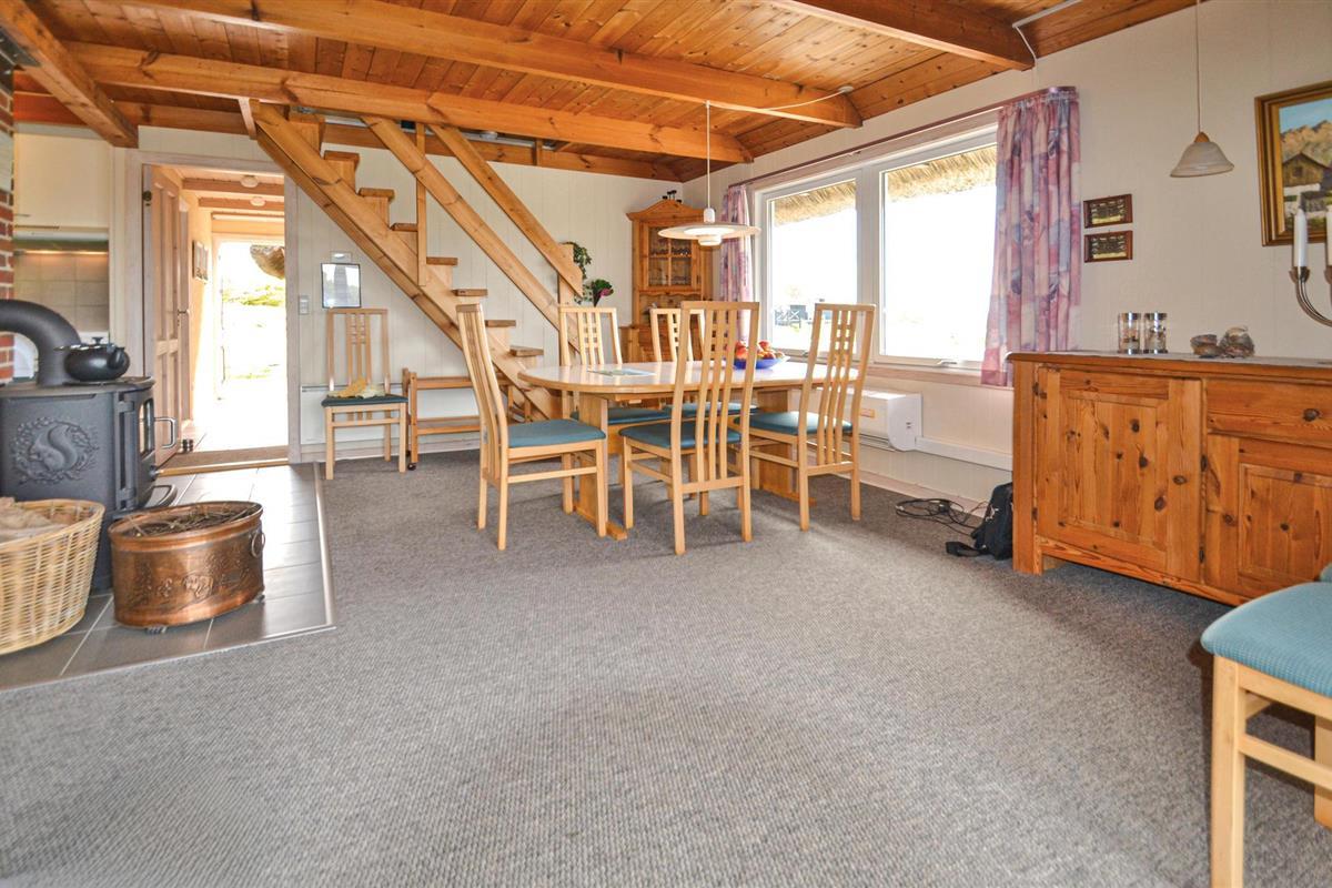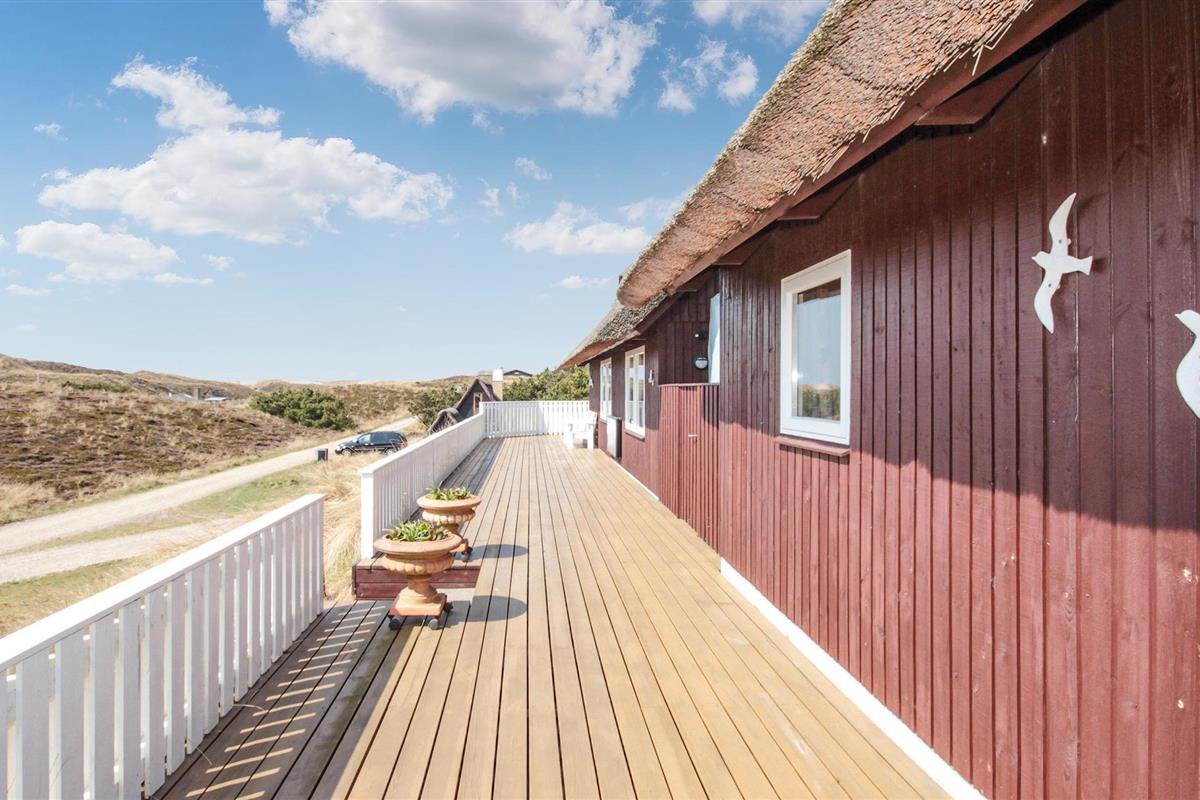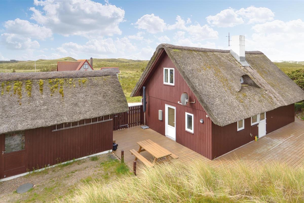 Een zeer gezellig vakantiehuis met rieten dak, gelegen in Skodbjerge op een prachtig natuurperceel. Vanaf hier heeft u een prachtig panoramisch uitzicht op het landschap en de fjord. De grote kwelders die zich als een schiereiland uitstrekken tot in het zuidelijke deel van de Ringkøbing Fjord zijn een natuurgebied van internationaal belang. In het voor- en najaar zijn Tipperne en Værnengene landingsplaatsen voor duizenden eenden, ganzen en waadvogels.