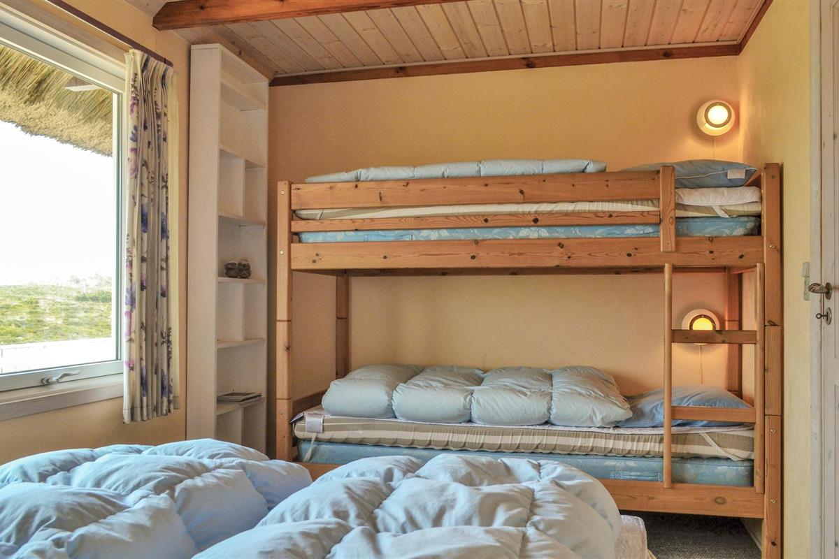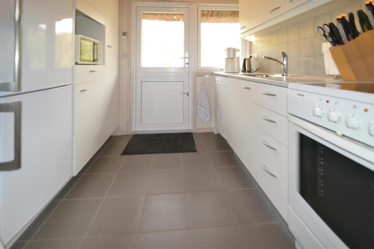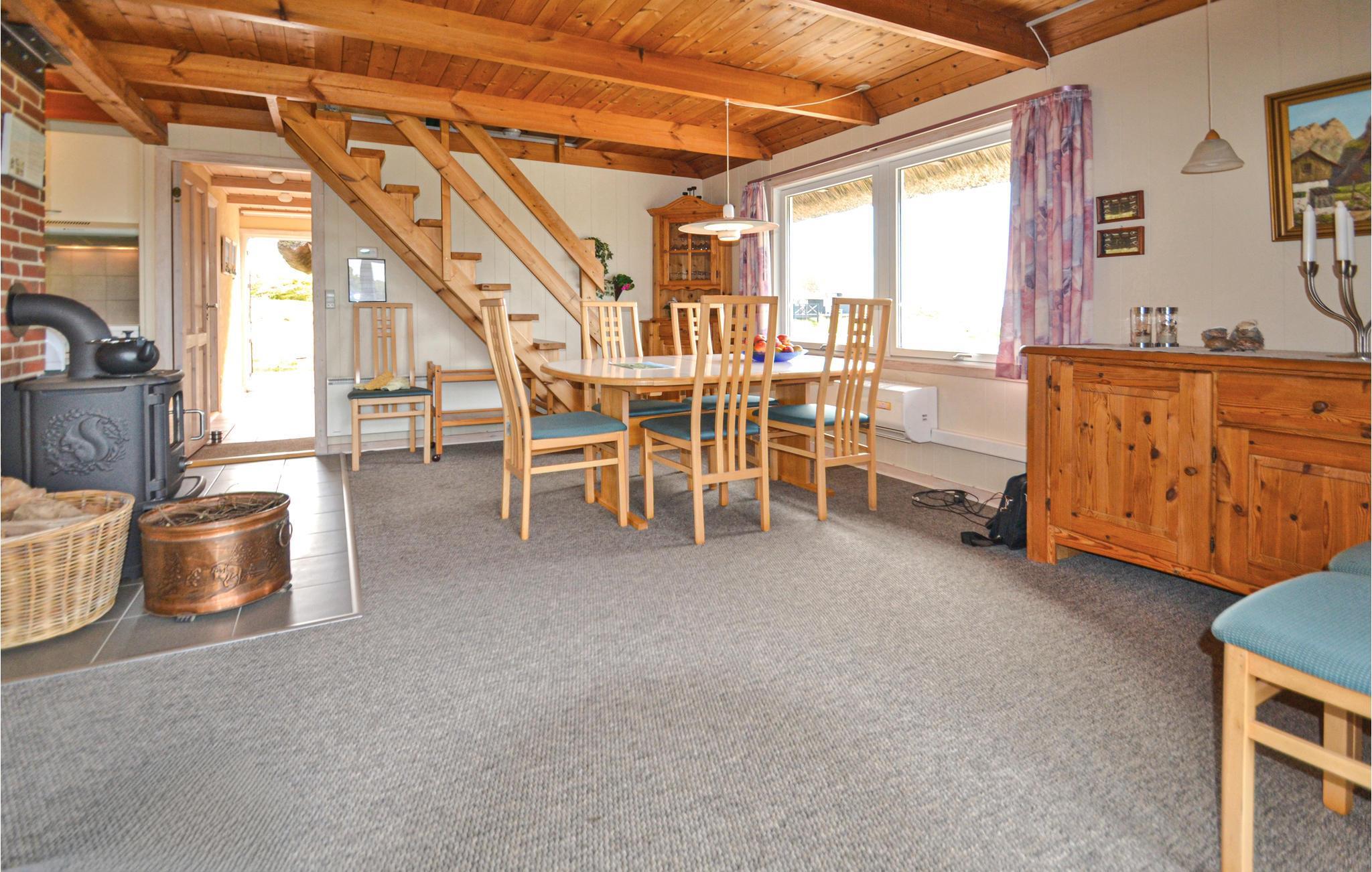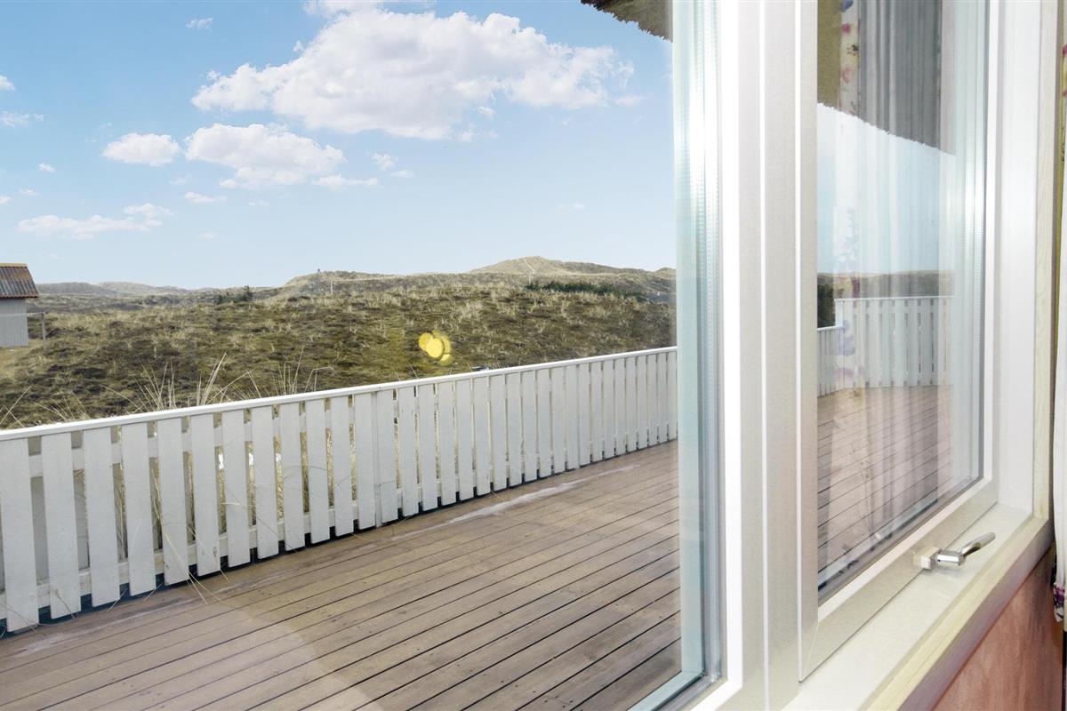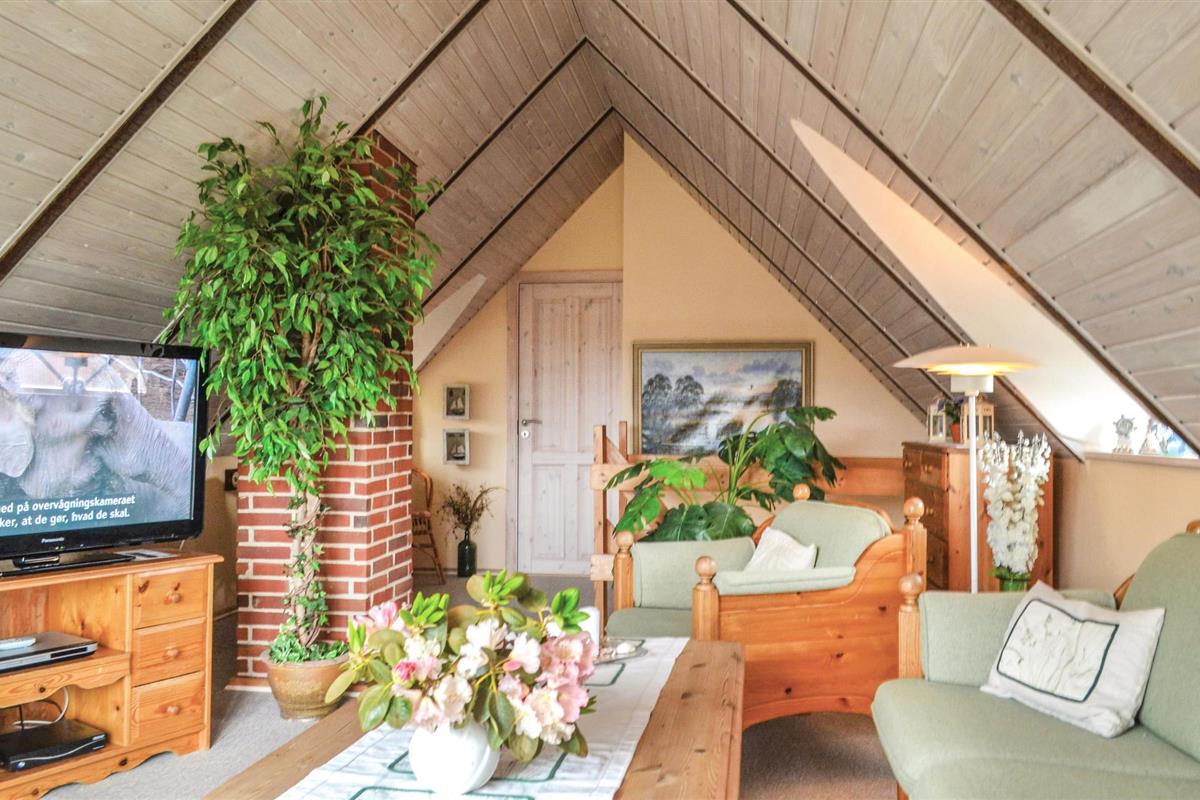 Een zeer gezellig vakantiehuis met rieten dak, gelegen in Skodbjerge op een prachtig natuurperceel. Vanaf hier heeft u een prachtig panoramisch uitzicht op het landschap en de fjord. De grote kwelders die zich als een schiereiland uitstrekken tot in het zuidelijke deel van de Ringkøbing Fjord zijn een natuurgebied van internationaal belang. In het voor- en najaar zijn Tipperne en Værnengene landingsplaatsen voor duizenden eenden, ganzen en waadvogels.