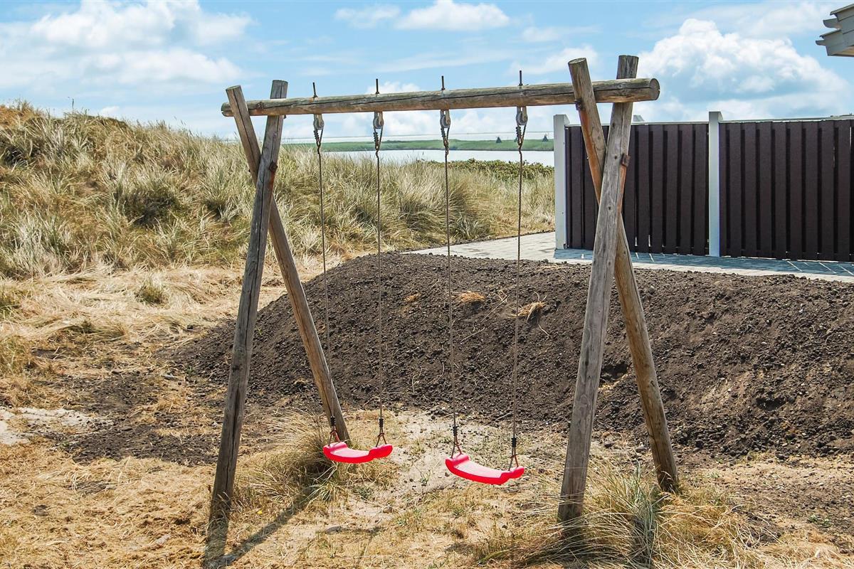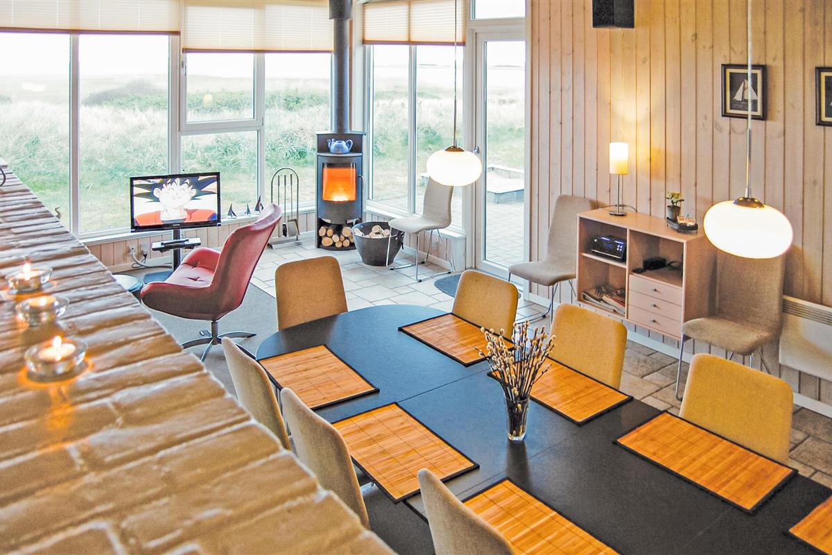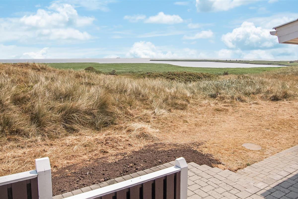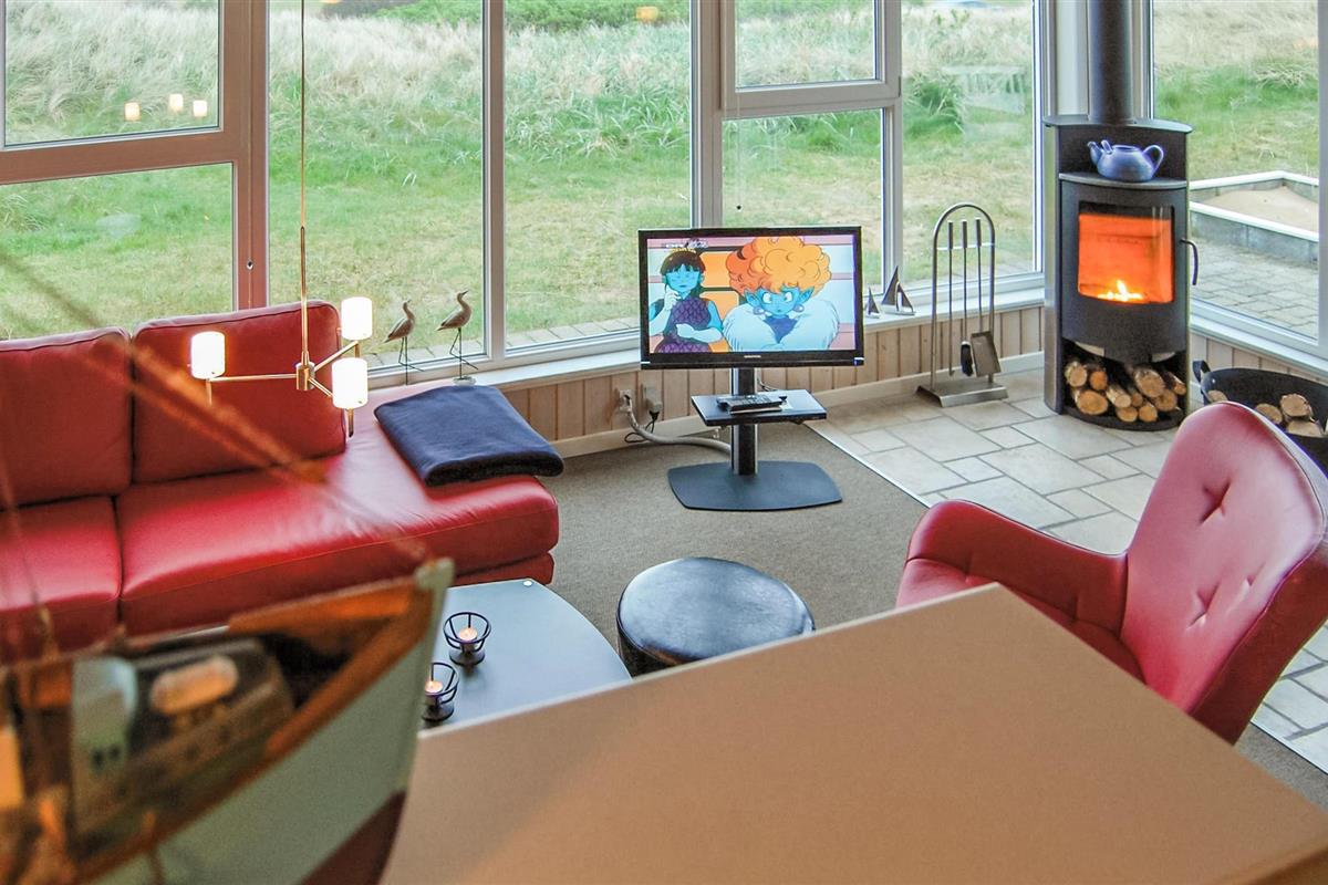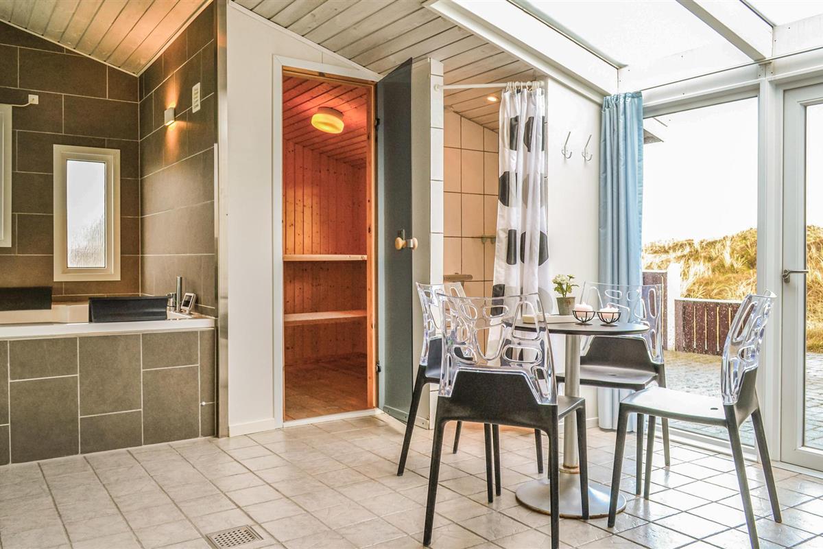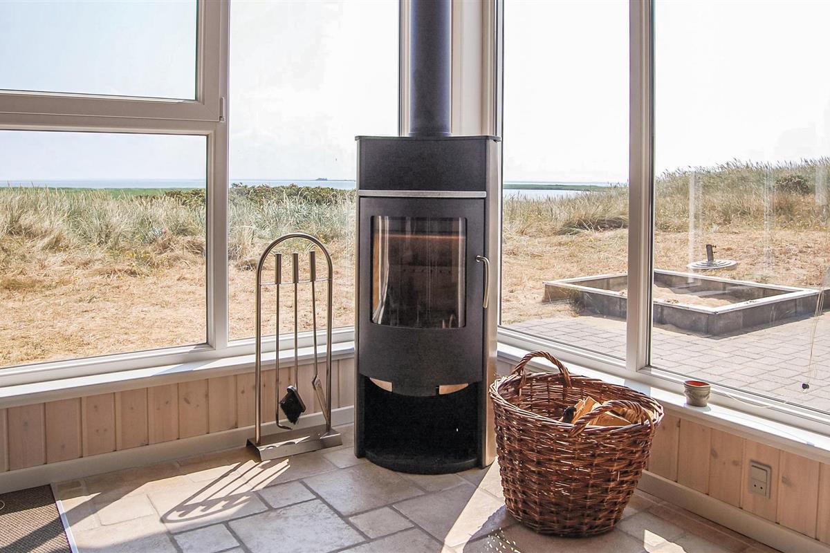 Dit mooie en verspringende vakantiehuis ligt hoog in de duinen. Vanuit de woonkamer en het zuidelijke of oostelijke terras heeft u uitzicht op het Ringkøbing fjord op slechts 100 meter van het huis. De goed uitgeruste keuken is modern en stijlvol ingericht. Het huis heeft deels betegelde vloeren, deels vloerbedekking, dus het is zowel praktisch als gezellig. Plons rond in het 17 vierkante meter grote zwembad of ontspan in de whirlpool voor twee. Als je een sauna neemt, heb je ook uitzicht op het fjord. Vanaf de zuidelijke en oostelijke terrassen heeft u ook uitzicht op de fjord en op het gedeeltelijk overdekte westelijke terras kunt u ook genieten van de avondzon. Op verschillende stukken strand vindt u hier goede omstandigheden om te windsurfen.