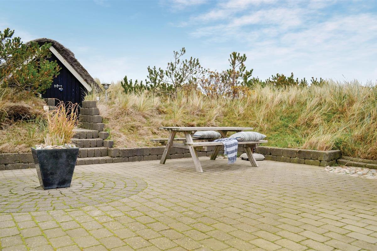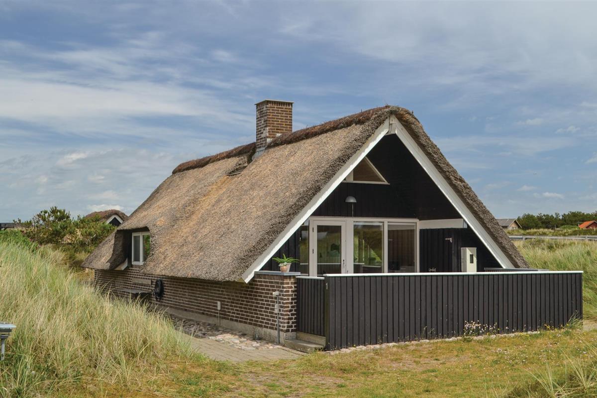 Charmant rietgedekt vakantiehuis in Hvide Sande met terras en uitzicht op de duinen, perfect voor een ontspannen vakantie.