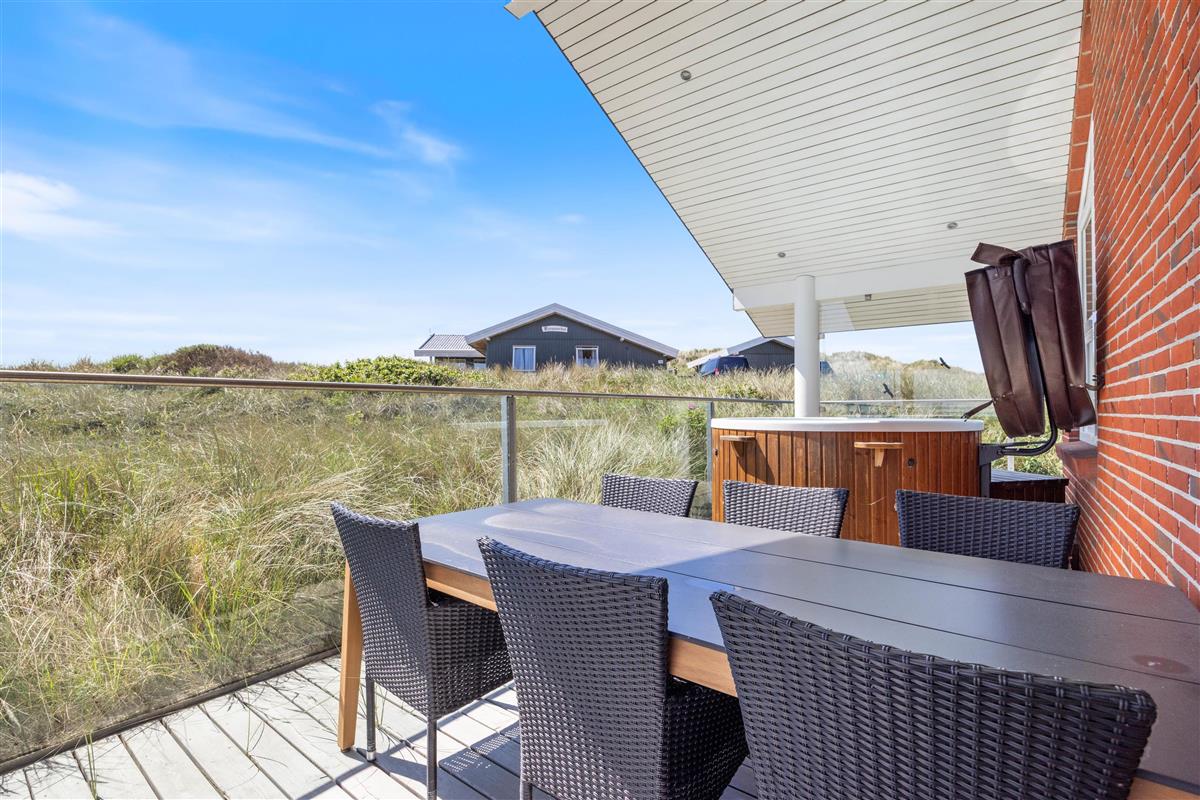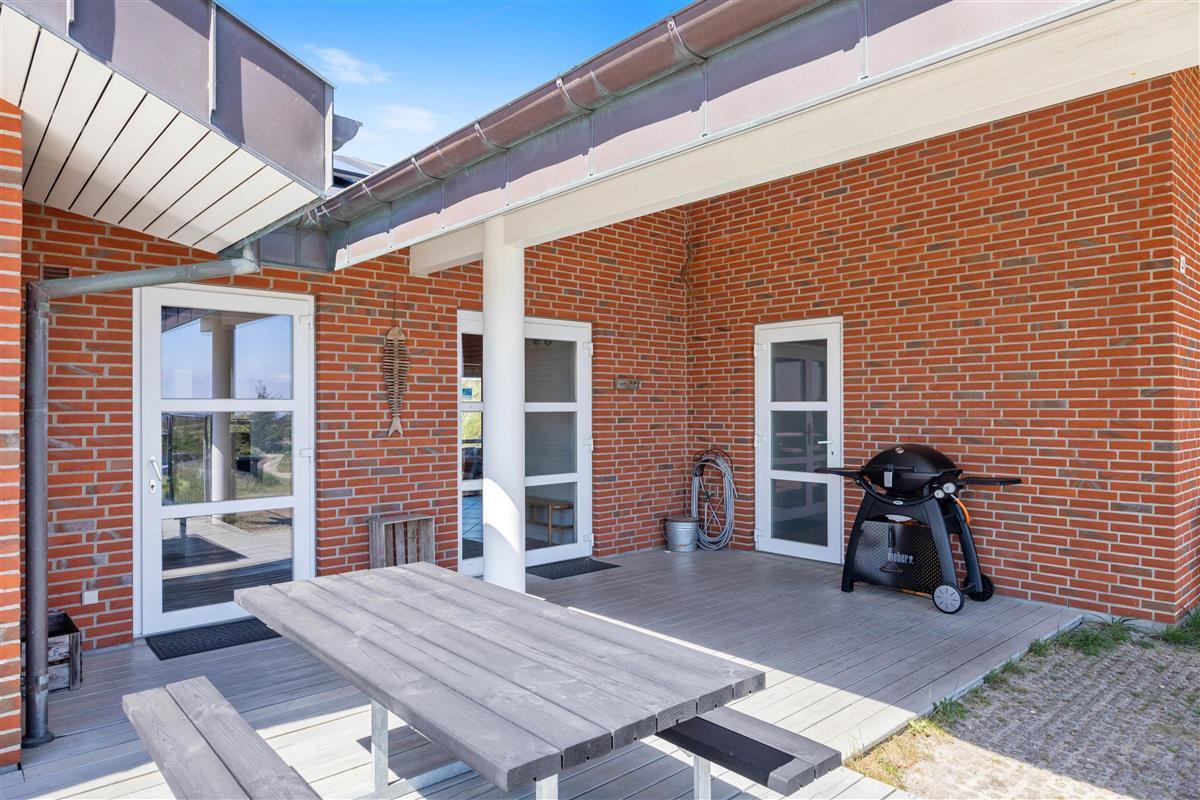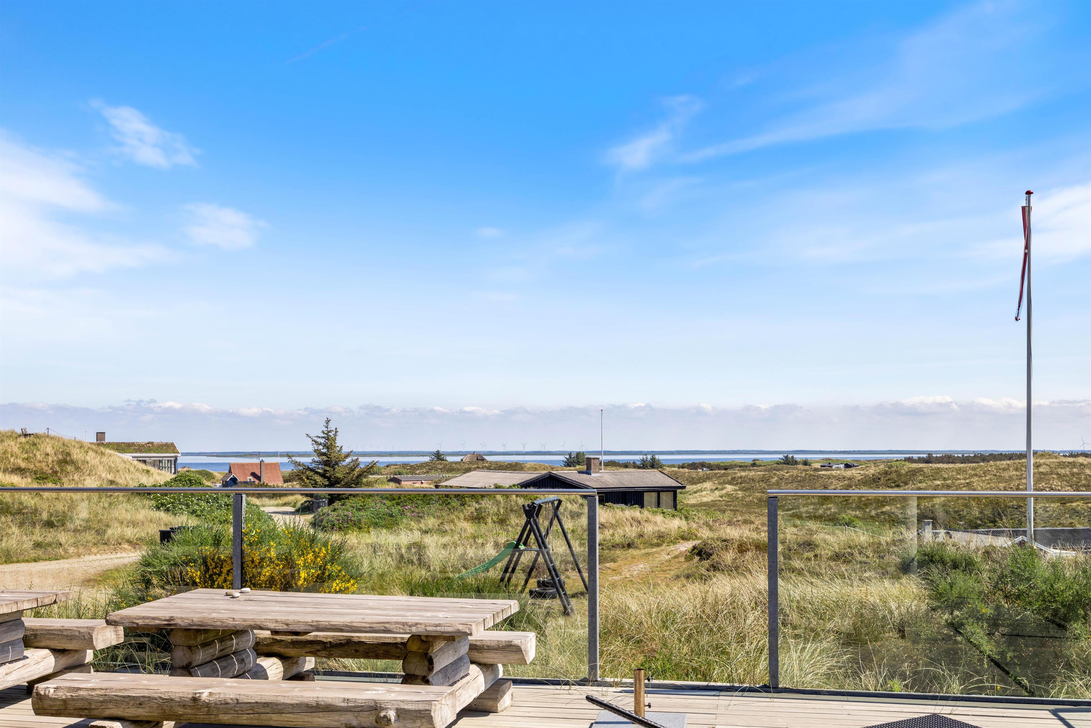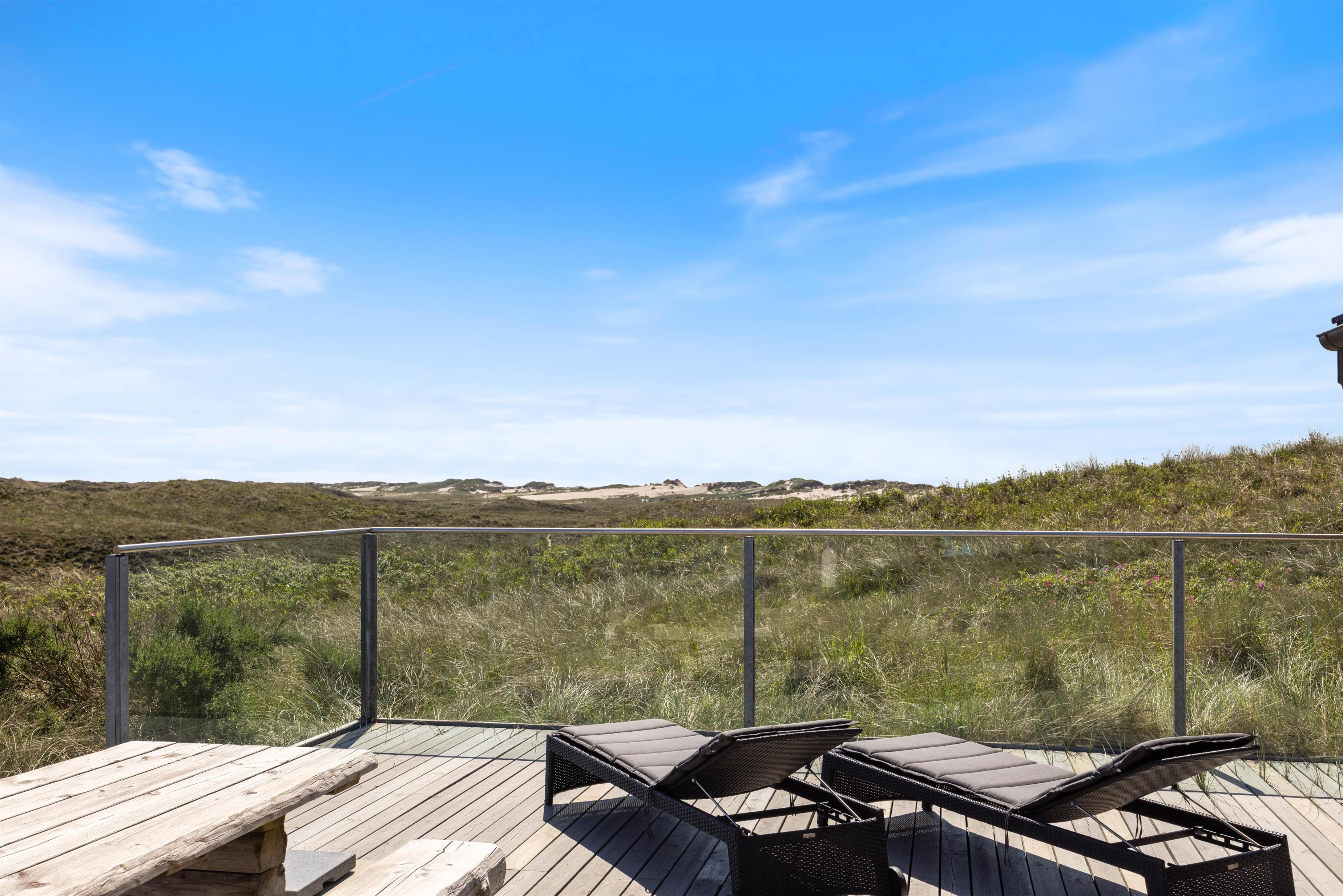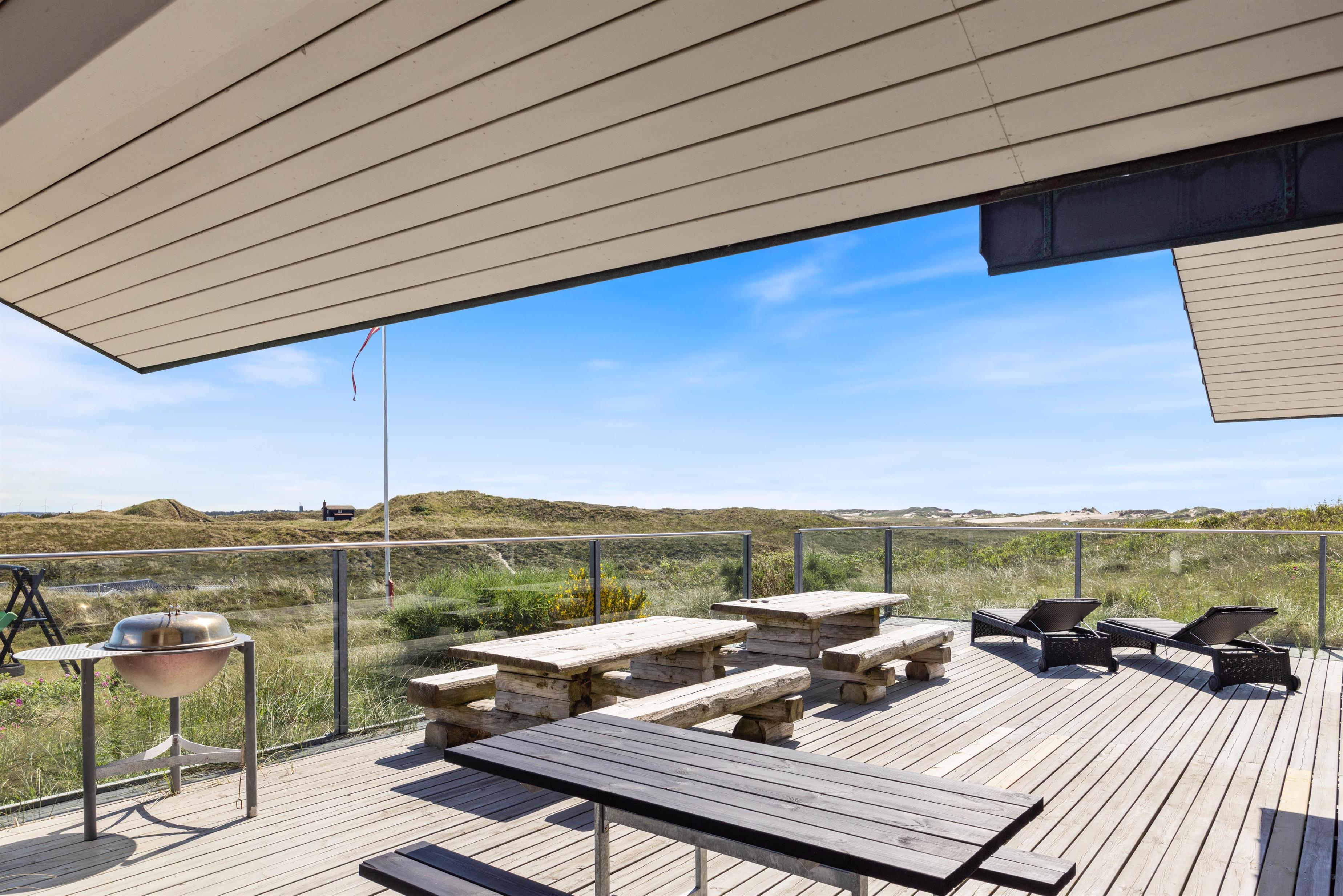 The superb terrace wraps around the entire house. It's largely protected by glass panels, ensuring uninterrupted views whilst providing shelter from the wind. From here, you can enjoy views of both the Ringkøbing Fjord to the east and the fascinating dune landscape to the west. Two partially covered areas create perfect spots for evening barbecues (gas barbecue provided).