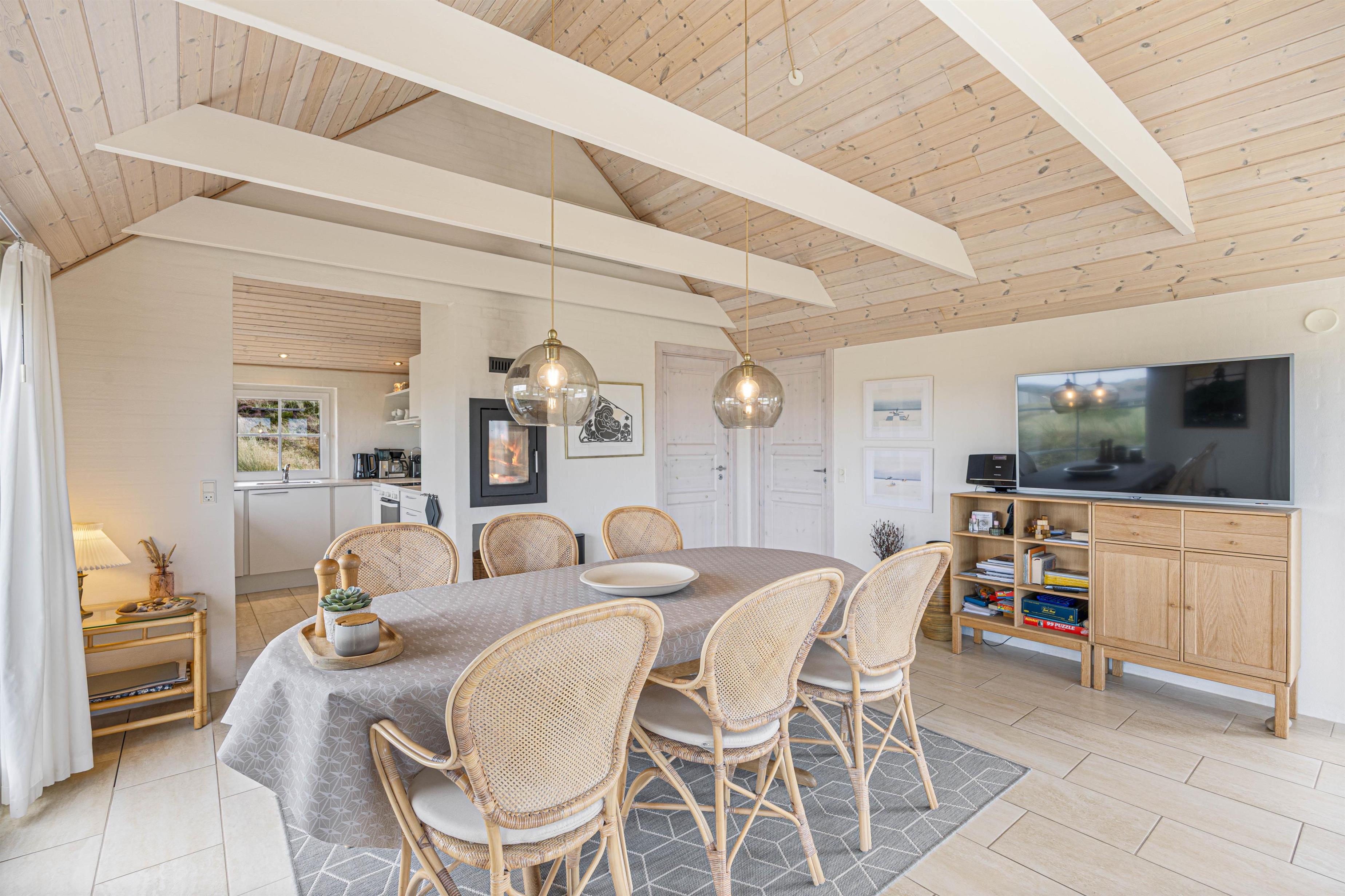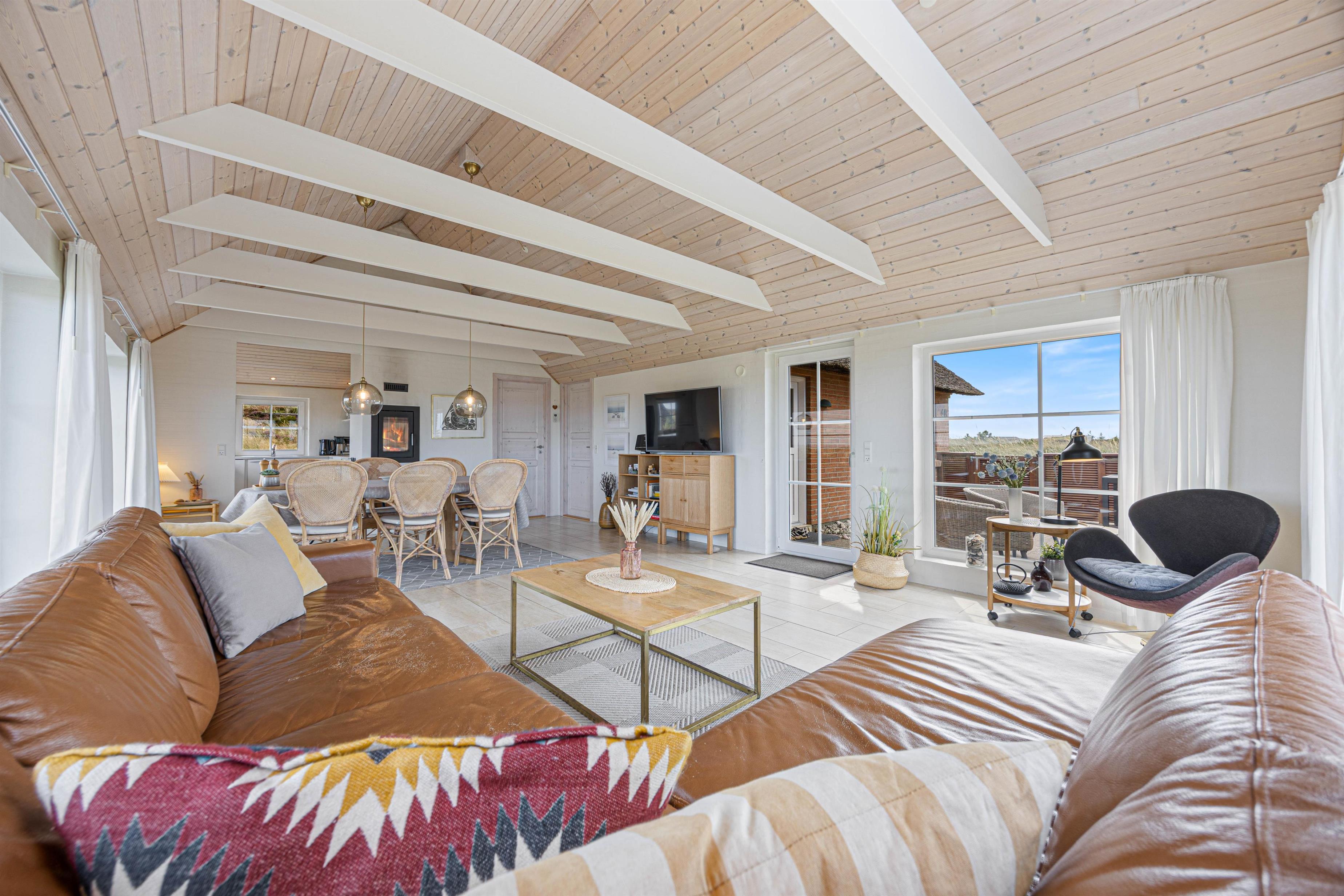 Built in 2012, this bright and airy holiday home features exposed ceiling beams and an open-plan design that allows natural light to flood in. The living room with kitchen and dining area forms the heart of the house - whether you're cooking or reading a good book on the sofa next to the cosy wood-burning stove, you'll always feel connected to the space.