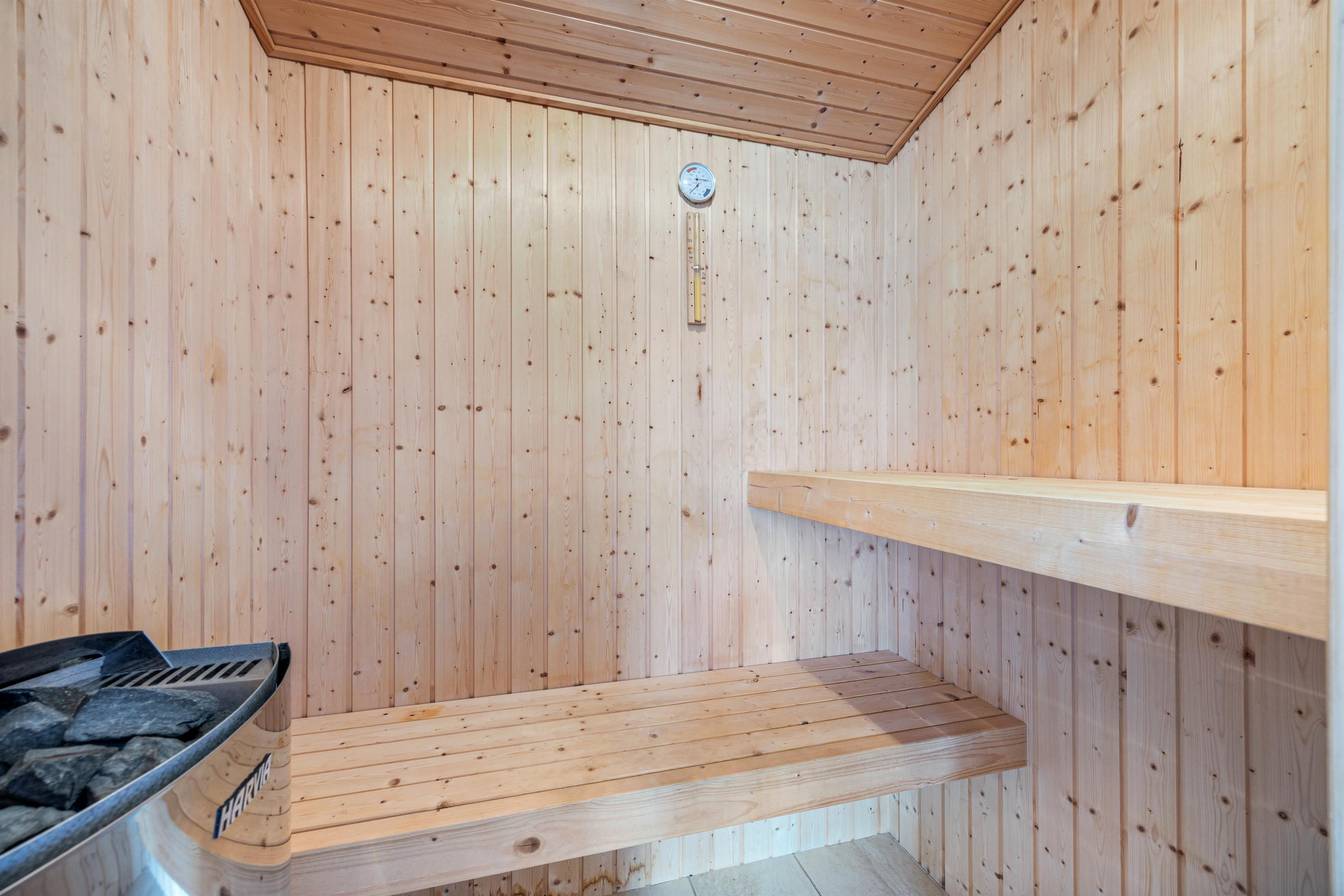 The bathroom includes a sauna, offering welcome warmth on cooler days, perhaps after a long walk in the dunes or along the beach.