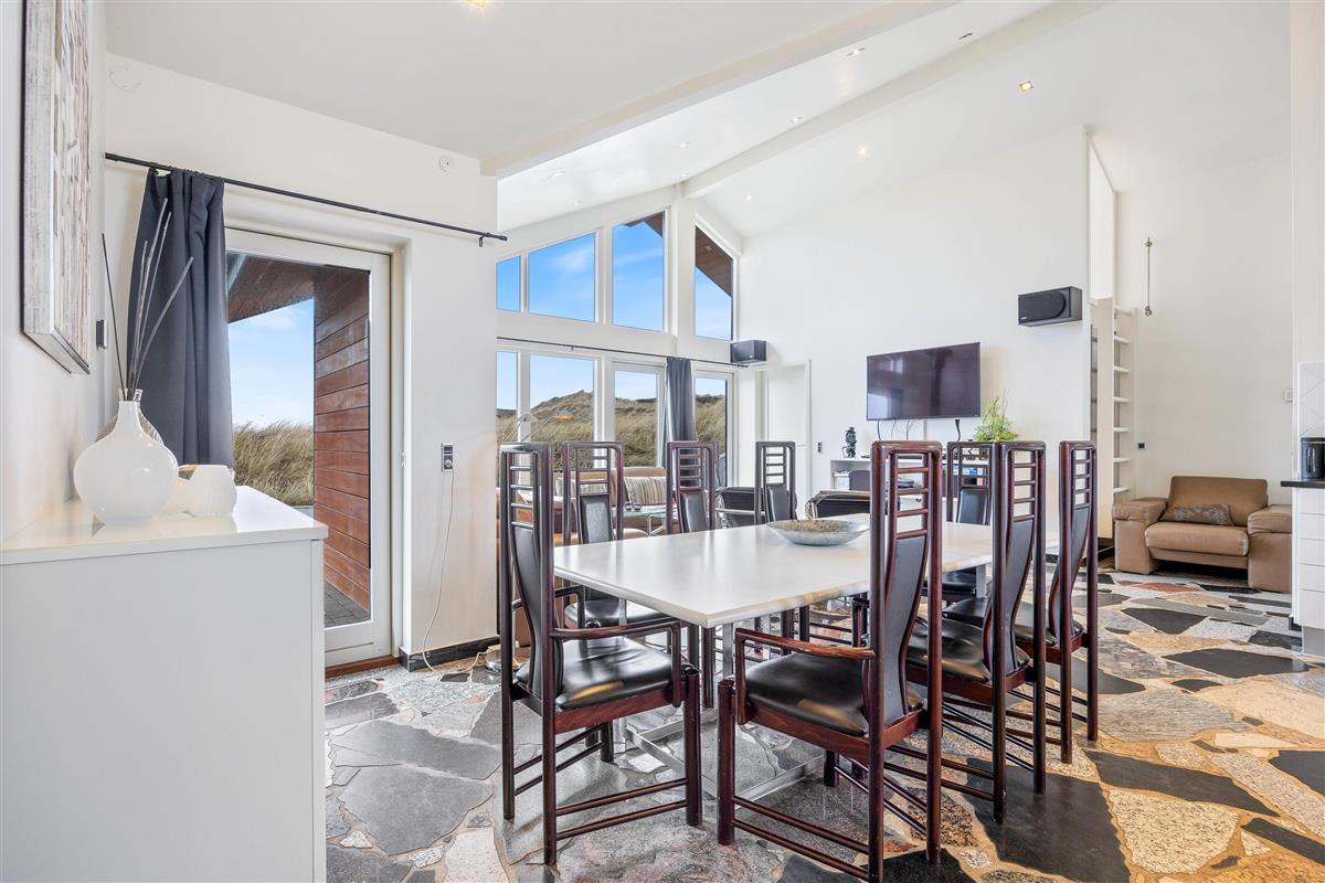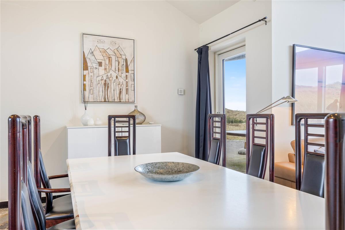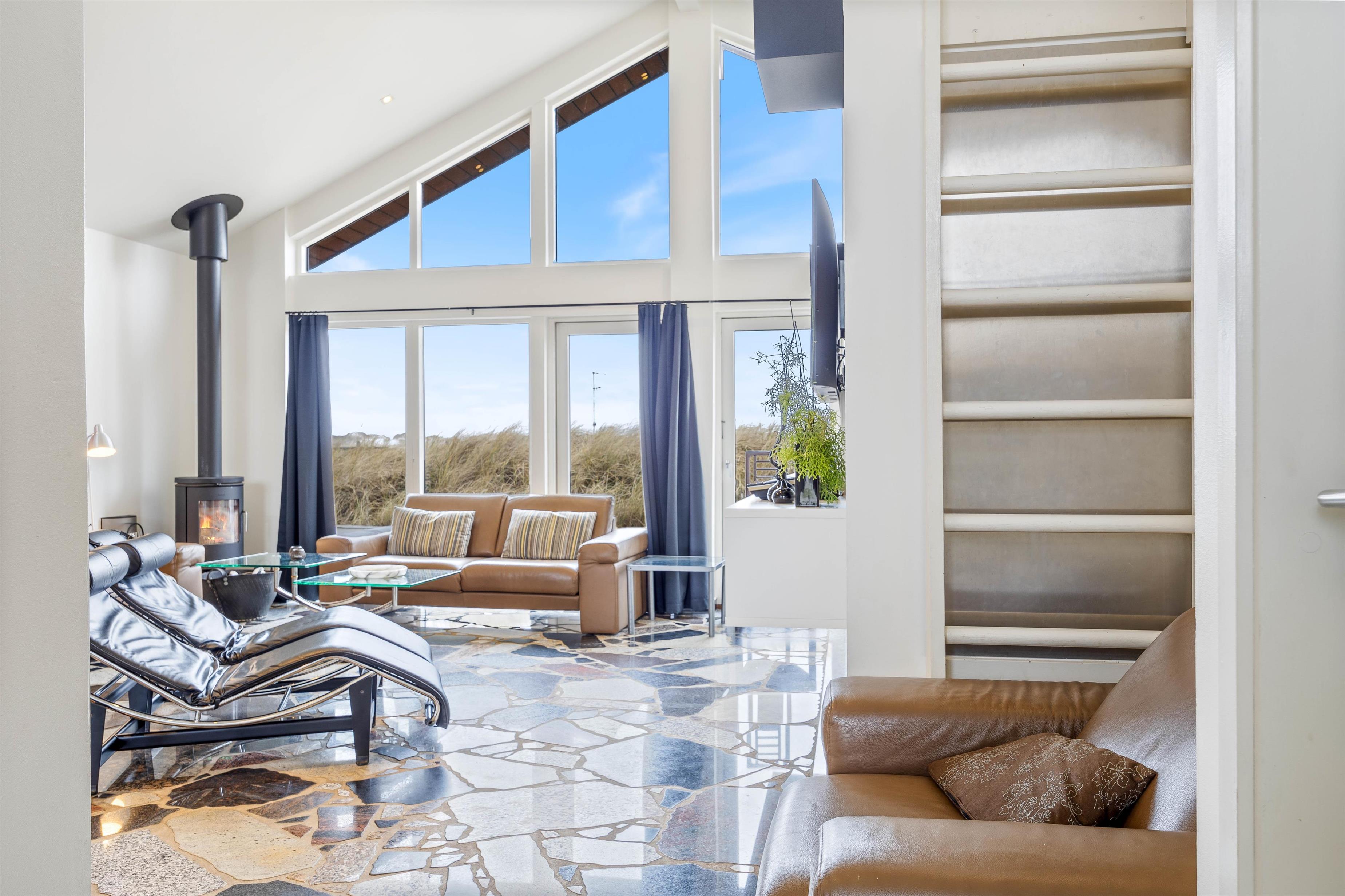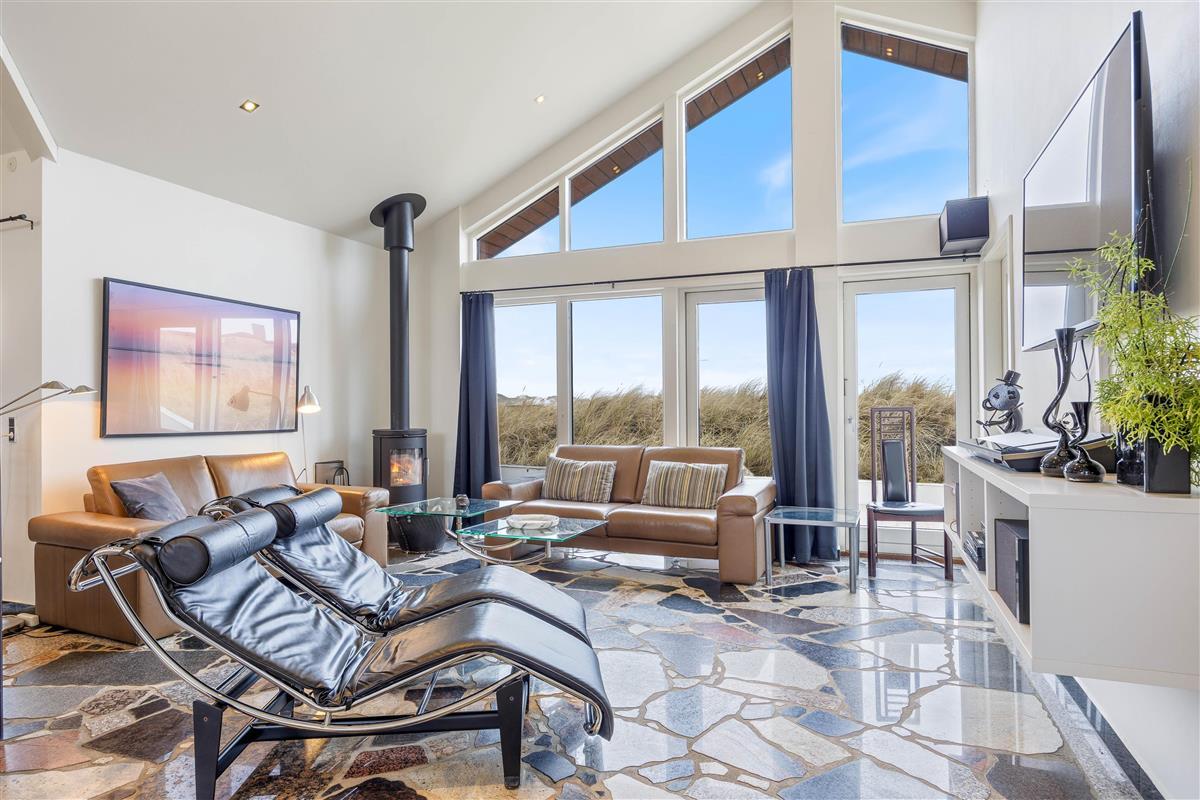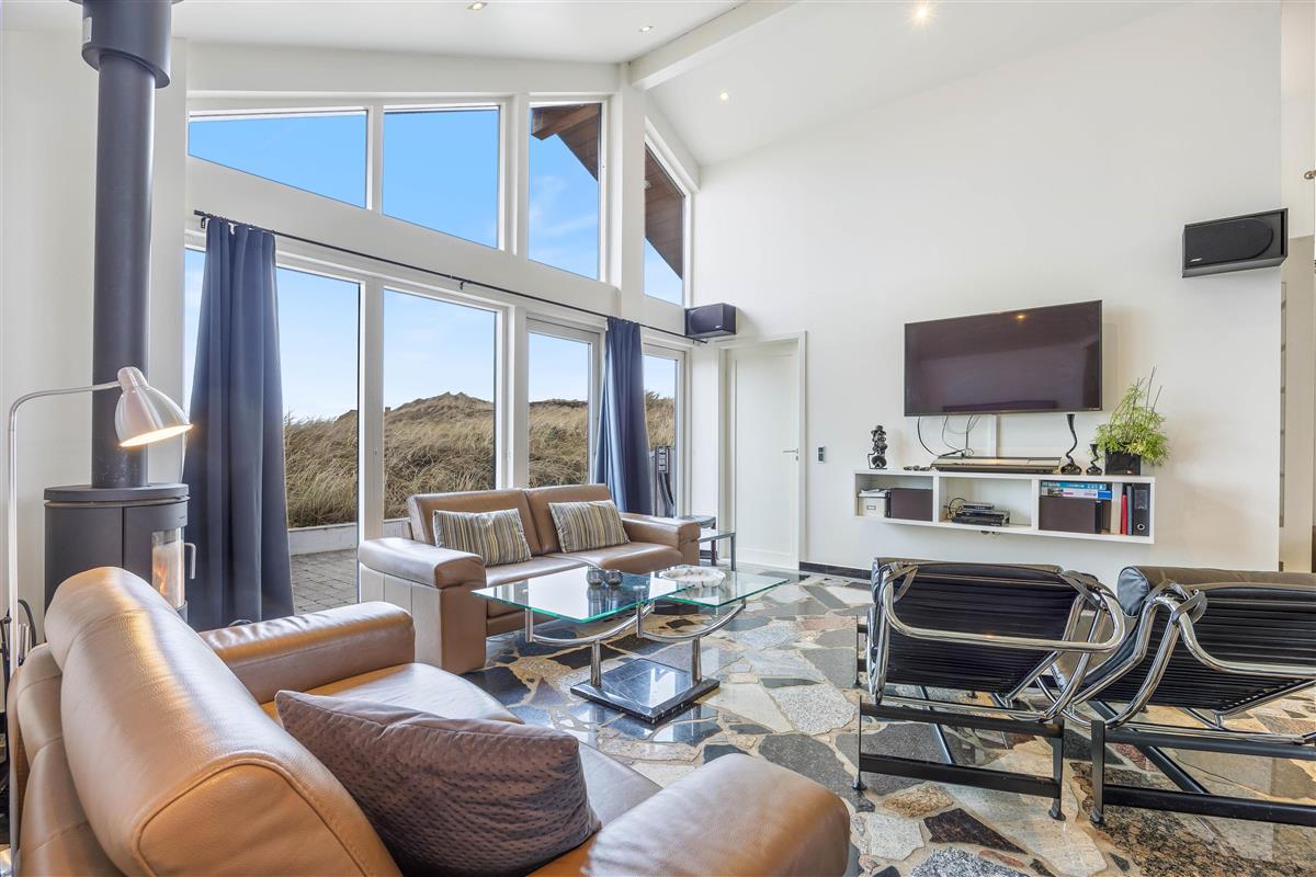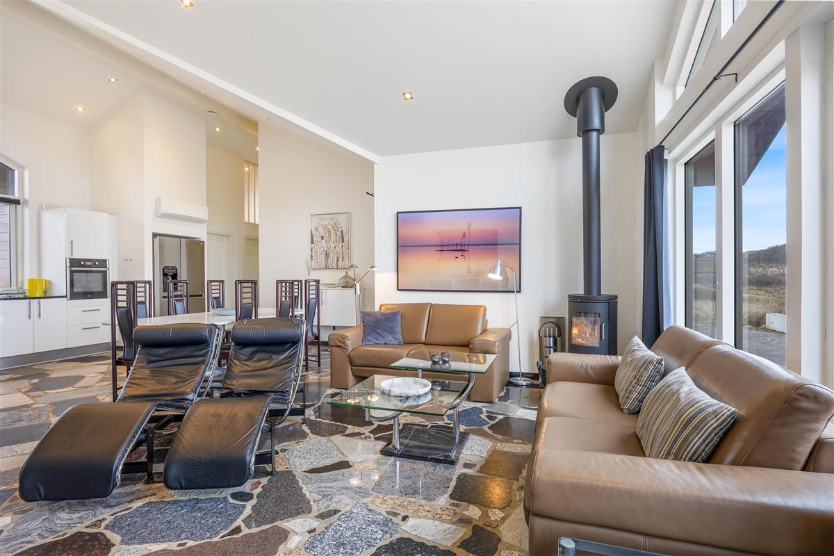The heart of this holiday home is its large, bright living area. Here, the living room, kitchen and dining area flow together, creating a sociable space. The wood-burning stove near the sofa adds cosiness. Whether you're watching television or simply relaxing on the sofa or reclining chairs while gazing at the dunes, everyone feels at home here.