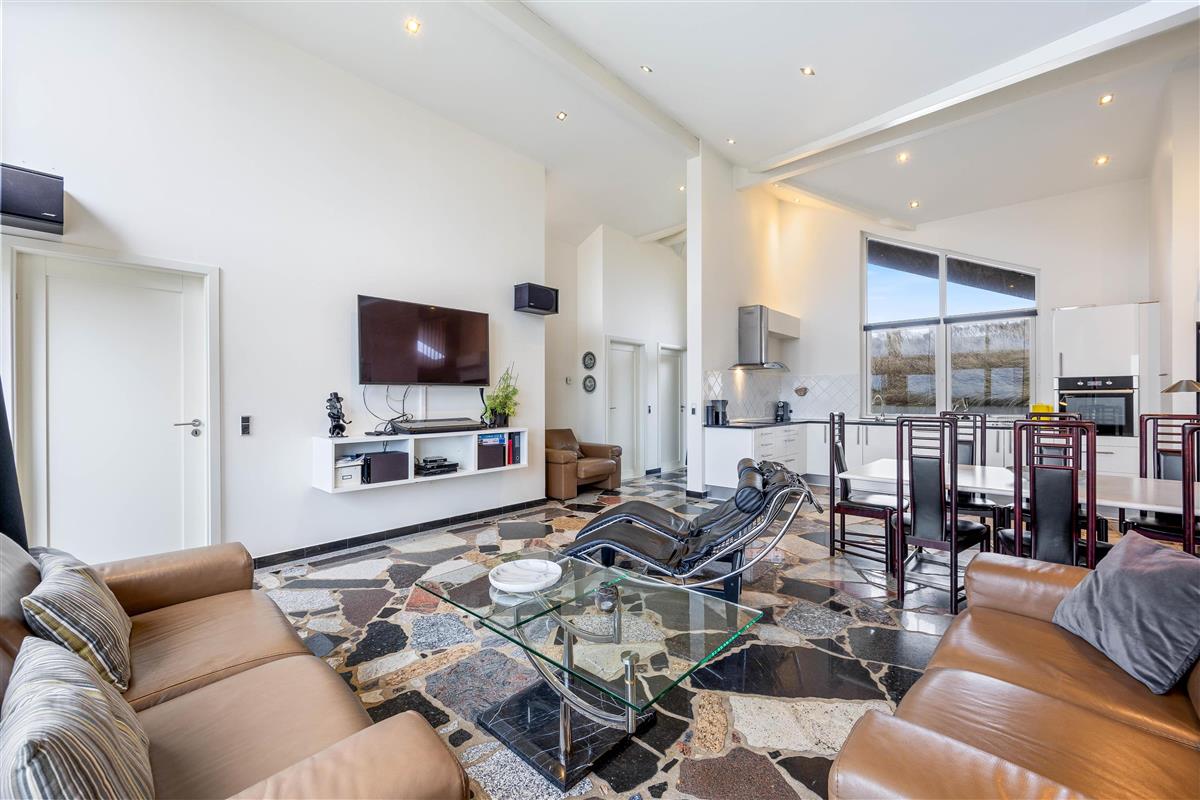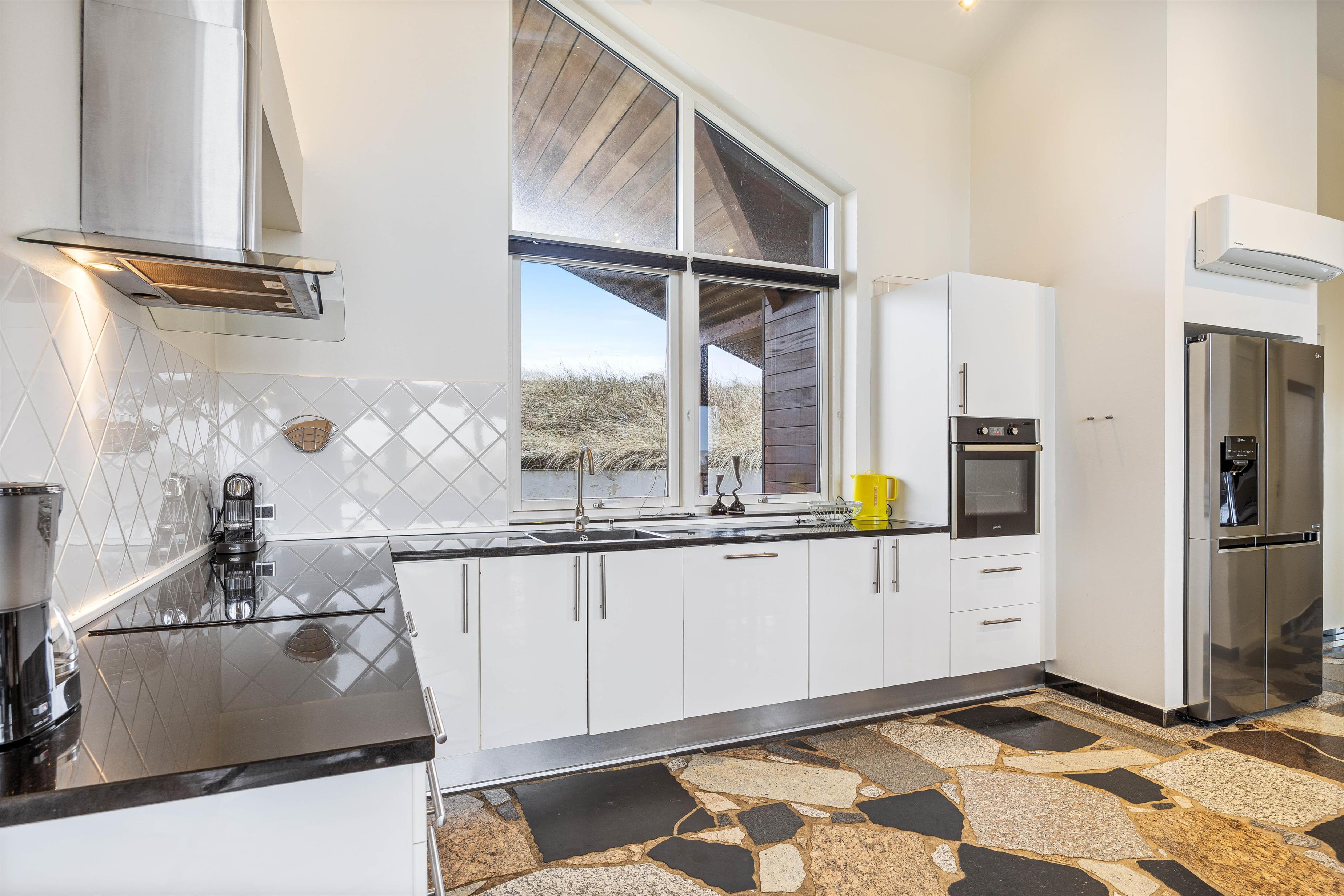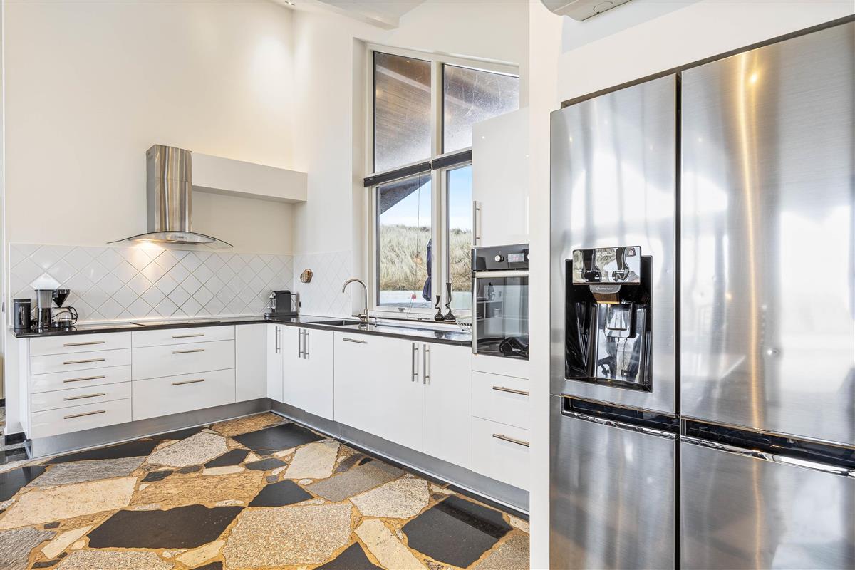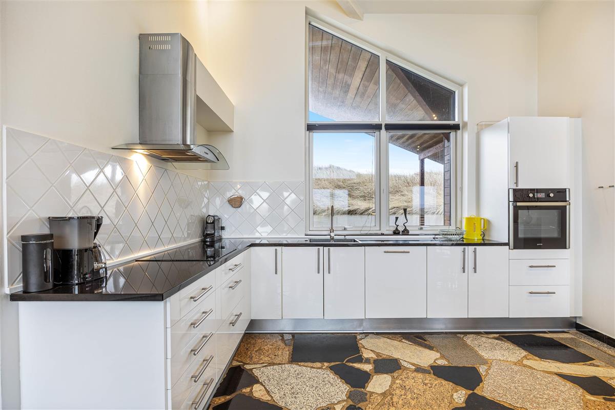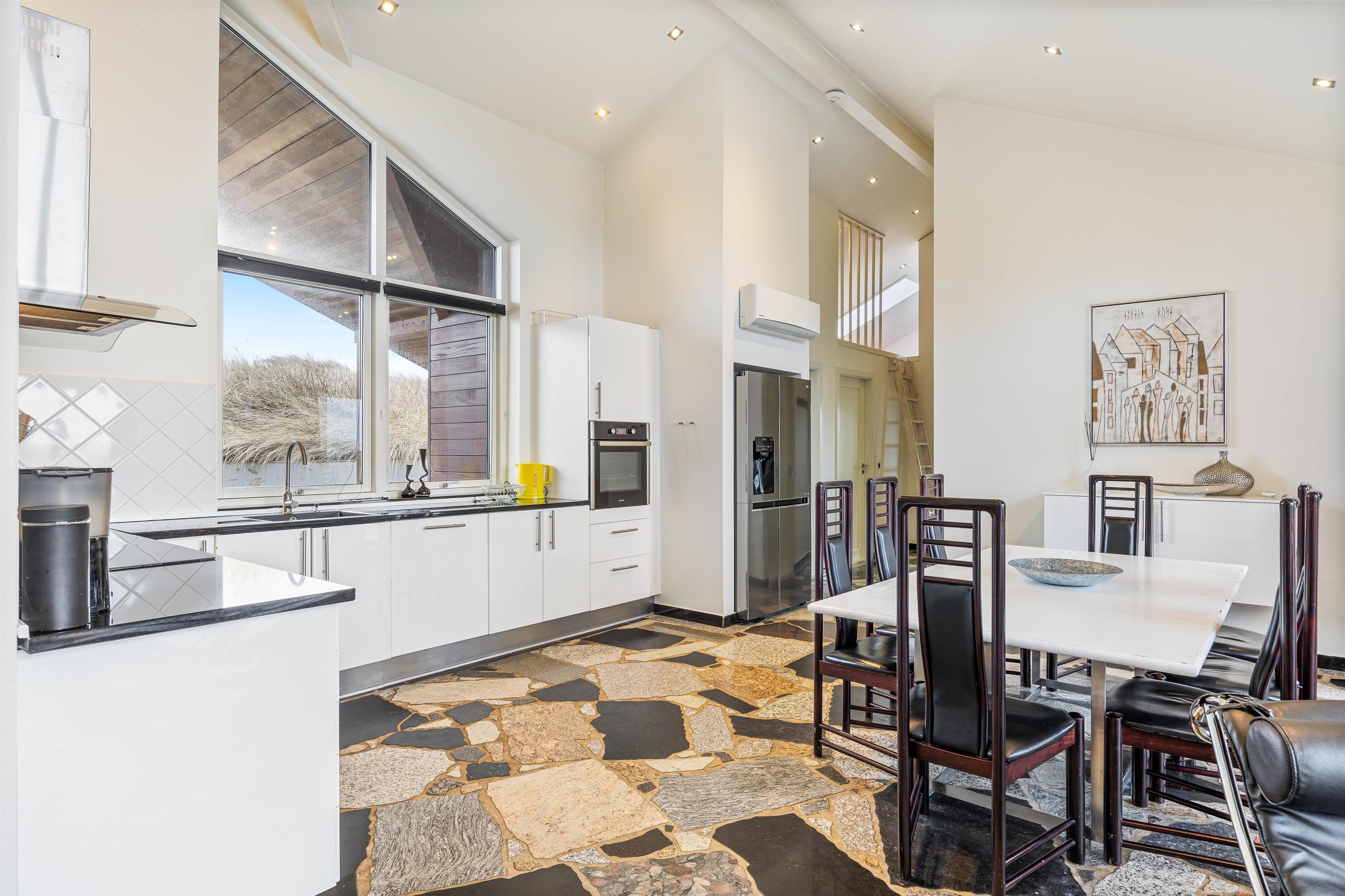 The heart of this holiday home is its large, bright living area. Here, the living room, kitchen and dining area flow together, creating a sociable space. The wood-burning stove near the sofa adds cosiness. Whether you're watching television or simply relaxing on the sofa or reclining chairs while gazing at the dunes, everyone feels at home here.